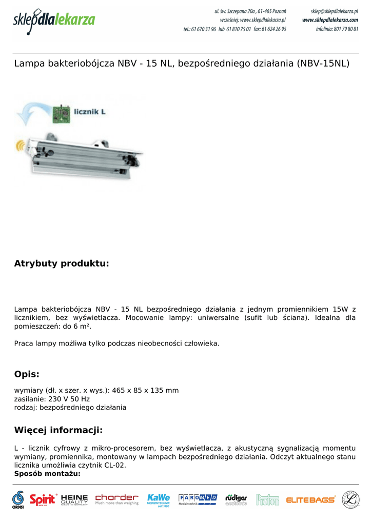 Lampa bakteriobójcza NBV - 15 NL, bezpośredniego działania (NBV-15NL) Atrybuty produktu: Lampa bakteriobójcza NBV - 15 NL bezpośredniego działania z jednym promiennikiem 15W z licznikiem, bez wyświetlacza. Mocowanie lampy: uniwersalne (sufit lub ściana). Idealna dla pomieszczeń: do 6 m². Praca lampy możliwa tylko podczas nieobecności człowieka. Opis: wymiary (dł. x szer. x wys.): 465 x 85 x 135 mm zasilanie: 230 V 50 Hz rodzaj: bezpośredniego działania Więcej informacji: L - licznik cyfrowy z mikro-procesorem, bez wyświetlacza, z akustyczną sygnalizacją momentu wymiany, promiennika, montowany w lampach bezpośredniego działania. Odczyt aktualnego stanu licznika umożliwia czytnik CL-02. Sposób montażu: N - uniwersalna (ścienno-sufitowa), przeznaczone są do podniesienia i utrzymania poziomu czystości mikrobiologicznej pomieszczeń, urządzenia te emitują promieniowanie UV-C o długości fali 253,7 nm, nieodwracalnie dezaktywują bakterie, wirusy, pleśnie, grzyby oraz wszelkie inne drobnoustroje, lampa bakteriobójcza skutecznie dezynfekuje powietrze i powierzchnię, odbłyśnik wykonany z aluminium odblaskowego o bardzo wysokiej jakości, przeznaczone są do stosowania na blokach operacyjnych, w gabinetach zabiegowych, opatrunkowych, salach chorych, przychodniach, laboratoriach, aptekach, w przemyśle farmaceutycznym, spożywczym i kosmetycznym, skuteczność działania lamp bakteriobójczych potwierdzona badaniami, wszelkie wymagane certyfikaty. DANE TECHNICZNE: napięcie zasilania: 230 V 50 Hz pobór mocy: 25 VA element emitujący promieniowanie UV-C: TUV15W natężenie promieniowania UV-C w odległości 1 m : 0,9 W / m2 trwałość promiennika : 8000 h dezynfekowana powierzchnia: 6-8 m2 obrót lampy (możliwość ustawienia) kąta naświetlenia: 200 ° klasa zabezpieczenia ppor.: I typ obudowy : IP 20 rodzaj pracy: ciągła wymiary kopuły: 465 x 85 x 135 mm długość uchwytu: 120 mm typ licznika: bez wyświetlacza Powered by TCPDF (www.tcpdf.org)