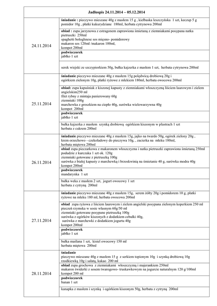 Jadłospis 24.11.2014 – 05.12.2014 śniadanie : pieczywo mieszane 40g z masłem 15 g , kiełbaska leszczyńska 1 szt, keczup 5 g pomidor 10g , płatki kukurydziane 180ml, herbata cytrynowa 200ml 24.11.2014 obiad : zupa jarzynowa z estragonem zaprawiona śmietaną z ziemniakami posypana natka pietruszki 250ml spaghetti bologhnese sos mięsno- pomidorowy makaron sos 120ml /makaron 100ml, kompot 200ml podwieczorek jabłko 1 szt serek wiejski ze szczypiorkiem 50g, bułka kajzerka z masłem 1 szt, herbata cytrynowa 200ml śniadanie pieczywo mieszane 40g z masłem 15g polędwicą drobiową 20g i ogórkiem zielonym 10g, płatki ryżowe z mlekiem 180ml, herbata owocowa 200ml 25.11.2014 obiad: zupa kapuśniak z kiszonej kapusty z ziemniakami włoszczyzną liściem laurowym i zielem angielskim250 ml filet rybny z mintaja panierowany 60g ziemniaki 100g marchewka z groszkiem na ciepło 40g, surówka wielowarzywna 40g kompot 200ml podwieczorek jabłko 1 szt bułka kajzerka z masłem szynką drobiową ogórkiem kiszonym w plastrach 1 szt herbata z cukrem 200ml 26.11.2014 śniadanie pieczywo mieszane 40g z masłem 15g, jajko na twardo 50g, ogórek zielony 20g , krem orzechowo - czekoladowy do pieczywa 10g, , zacierka na mleku 180ml, herbata miętowa 200ml obiad zupa pieczarkowa z makaronem włoszczyzna i natka pietruszki zaprawiona śmietaną 250ml podudzie z kurczaka 1 szt ok. 120g ziemniaki gotowane z pietruszką 100g surówka z białej kapusty z marchewką i brzoskwinią na śmietanie 40 g, surówka modra 40g kompot 200ml podwieczorek mandarynka 1 szt bułka weka z masłem 2 szt, jogurt owocowy 1 szt herbata z cytryną 200ml śniadanie pieczywo mieszane 40g z masłem 15g, serem żółty 20g i pomidorem 10 g, płatki ryżowe na mleku 180 ml, herbata owocowa 200ml 27.11.2014 obiad zupa ryżowa z liściem laurowym i zielem angielski posypana zielonym koperkiem 250 ml pieczeń rzymska w sosie własnym 60g/50 ml ziemniaki gotowane posypane pietruszką 100g surówka z ogórków kiszonych z dodatkiem cebulki 40g, surówka z marchewki z dodatkiem jogurtu 40g kompot 200ml podwieczorek jabłko 1 szt bułka maślana 1 szt, kisiel owocowy 150 ml herbata miętowa 200ml 28.11.2014 śniadanie pieczywo mieszane 40g z masłem 15 g z serkiem topionym 10g i szynką drobiową 10g rzodkiewką 10g i sałatą, kakao 200 ml obiad zupa grochowa z ziemniakami włoszczyzną i majerankiem 250ml makaron świderki z sosem twarogowo- truskawkowym na jogurcie naturalnym 120 g/100ml kompot 200 ml podwieczorek banan 1 szt kanapka z masłem i szynką i ogórkiem kiszonym 50g, herbata z cytryną 200ml śniadanie : pieczywo mieszane 40g z masłem 15g, pasztet pieczony 30g, ogórek zielony 10g, dżem do pieczywa10g, kaszka manna na mleku 180 ml, herbata miętowa 200ml 01.12.2014 obiad : zupa ogórkowa z ziemniakami włoszczyzną posypana natką pietruszki 250 ml risotto z kurczaka z warzywami( pieczarki, marchewka, seler, kukurydza, por, estragon) 100g ryż 100g kompot 200ml podwieczorek jabłko 1 szt bułka weka z masłem szynką wieprzową i pomidorem 50g herbata miętowa 200ml śniadanie pieczywo mieszane 40g z masłem 15 g , serem żółtym 20g pomidorem 10g i ogórkiem kiszonym w plastrach do smaku, płatki owsiane na mleku 180g, herbata cytrynowa 200ml 02.12.2014 obiad: zupa kalafiorowa z włoszczyzną ziemniakami zaprawiona jogurtem naturalnym posypana natką pietruszki 250 ml filet z kurczaka gotowany na parze 60g ziemniaki gotowane sypane pietruszką 100g surówka wiosenna z dodatkiem koperku na jogurcie 40g, sałatka szwedzka 40g kompot 200ml podwieczorek jabłko 1 szt koktajl owocowy 200ml z biszkoptami 5 szt śniadanie pieczywo mieszane 40g z masłem 15g, szynką wieprzową 20g sałata 2 listki, krem orzechowo-czekoladowy do pieczywa 10g, kakao 200 ml 03.12.2014 obiad zupa krupnik z ziemniakami włoszczyzną posypany natką pietruszki 250ml kotlecik z mintaja panierowany 60g ziemniaki gotowane sypane pietruszką 100g surówka z marchewki jabłka 40g, surówka wielowarzywna z dodatkiem oleju rzepakowego 40g kompot 200ml podwieczorek mandarynka 1 szt bułka weka z masłem 2 szt, jogurt 1 szt herbata z cukrem 200ml śniadanie pieczywo mieszane 40g z masłem 15 g filet z indyka 20g sałata zielona, pomidor 10g , zacierka na mleku 180 g herbata miętowa 200ml 04.12.2014 obiad zupa pomidorowa z listkiem laurowym zielem angielski i włoszczyzną na śmietanie z makaronem 250ml pieczeń ze schabu w sosie własnym 60g/50 ml ziemniaki gotowane sypane pietruszką 100g surówka z buraczków czerwonych 40g, surówka z selera, marchewki dodatkiem jabłka i brzoskwini na jogurcie naturalnym 40g kompot 200ml podwieczorek jabłko 1 szt bułka weka z masłem 2 szt, sałatka jarzynowa 60 g, herbata miętowa 200ml śniadanie pieczywo mieszane 40g z masłem 15 g serem białym do kanapek 30g, pomidorem 10g i szczypiorkiem, płatki ryżowe 180 ml, herbata owocowa 200ml 05.12.2014 obiad zupa fasolowa z ziemniakami włoszczyzną majerankiem dodatkiem oleju rzepakowego i natki pietruszki 250 ml naleśniki na słodko z białym serem i dżemem 180 g, kompot 200ml podwieczorek gruszka 1 szt bułka kajzerka z masłem wędliną drobiową i sałatą 1 szt herbata cytrynowa 200ml Jadłospis dieta bezglutenowa śniadanie : pieczywo bezglutenowe 40g z masłem roślinnym 15 g , kiełbaska leszczyńska 1 szt, keczup 5 g, pomidor 10g , kaszka kukurydziana z mlekiem 180ml, herbata cytrynowa 200ml 24.11.2014 obiad : zupa jarzynowa z estragonem zaprawiona śmietaną z ziemniakami posypana natka pietruszki 250ml spaghetti bologhnese sos mięsno- pomidorowy makaron ryżowy sos 120ml /makaron 100ml, kompot 200ml podwieczorek jabłko 1 szt serek wiejski ze szczypiorkiem 50g, pieczywo bezglutenowe z masłem roślinnym , herbata cytrynowa 200ml śniadanie pieczywo bezglutenowe 40g z masłem roślinnym 15 g polędwicą drobiową 20g i ogórkiem zielonym 10g, płatki ryżowe z mlekiem 180ml, herbata owocowa 200ml 25.11.2014 26.11.2014 obiad: zupa kapuśniak z kiszonej ka