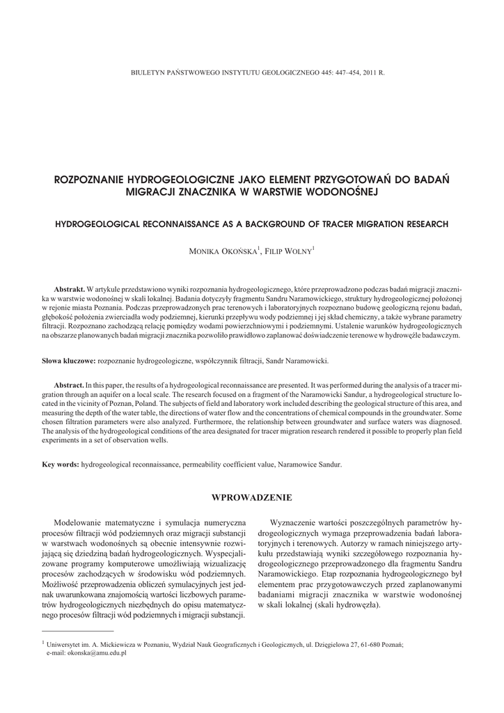 BIULETYN PAÑSTWOWEGO INSTYTUTU GEOLOGICZNEGO 445: 447–454, 2011 R. ROZPOZNANIE HYDROGEOLOGICZNE JAKO ELEMENT PRZYGOTOWAÑ DO BADAÑ MIGRACJI ZNACZNIKA W WARSTWIE WODONOŒNEJ HYDROGEOLOGICAL RECONNAISSANCE AS A BACKGROUND OF TRACER MIGRATION RESEARCH MONIKA OKOÑSKA1, FILIP WOLNY1 Abstrakt. W artykule przedstawiono wyniki rozpoznania hydrogeologicznego, które przeprowadzono podczas badañ migracji znacznika w warstwie wodonoœnej w skali lokalnej. Badania dotyczy³y fragmentu Sandru Naramowickiego, struktury hydrogeologicznej po³o¿onej w rejonie miasta Poznania. Podczas przeprowadzonych prac terenowych i laboratoryjnych rozpoznano budowê geologiczn¹ rejonu badañ, g³êbokoœæ po³o¿enia zwierciad³a wody podziemnej, kierunki przep³ywu wody podziemnej i jej sk³ad chemiczny, a tak¿e wybrane parametry filtracji. Rozpoznano zachodz¹c¹ relacjê pomiêdzy wodami powierzchniowymi i podziemnymi. Ustalenie warunków hydrogeologicznych na obszarze planowanych badañ migracji znacznika pozwoli³o prawid³owo zaplanowaæ doœwiadczenie terenowe w hydrowêŸle badawczym. S³owa kluczowe: rozpoznanie hydrogeologiczne, wspó³czynnik filtracji, Sandr Naramowicki. Abstract. In this paper, the results of a hydrogeological reconnaissance are presented. It was performed during the analysis of a tracer migration through an aquifer on a local scale. The research focused on a fragment of the Naramowicki Sandur, a hydrogeological structure located in the vicinity of Poznan, Poland. The subjects of field and laboratory work included describing the geological structure of this area, and measuring the depth of the water table, the directions of water flow and the concentrations of chemical compounds in the groundwater. Some chosen filtration parameters were also analyzed. Furthermore, the relationship between groundwater and surface waters was diagnosed. The analysis of the hydrogeological conditions of the area designated for tracer migration research rendered it possible to properly plan field experiments in a set of observation wells. Key words: hydrogeological reconnaissance, permeability coefficient value, Naramowice Sandur. WPROWADZENIE Modelowanie matematyczne i symulacja numeryczna procesów filtracji wód podziemnych oraz migracji substancji w warstwach wodonoœnych s¹ obecnie intensywnie rozwijaj¹c¹ siê dziedzin¹ badañ hydrogeologicznych. Wyspecjalizowane programy komputerowe umo¿liwiaj¹ wizualizacjê procesów zachodz¹cych w œrodowisku wód podziemnych. Mo¿liwoœæ przeprowadzenia obliczeñ symulacyjnych jest jednak uwarunkowana znajomoœci¹ wartoœci liczbowych parametrów hydrogeologicznych niezbêdnych do opisu matematycznego procesów filtracji wód podziemnych i migracji substancji. 1 Wyznaczenie wartoœci poszczególnych parametrów hydrogeologicznych wymaga przeprowadzenia badañ laboratoryjnych i terenowych. Autorzy w ramach niniejszego artyku³u przedstawiaj¹ wyniki szczegó³owego rozpoznania hydrogeologicznego przeprowadzonego dla fragmentu Sandru Naramowickiego. Etap rozpoznania hydrogeologicznego by³ elementem prac przygotowawczych przed zaplanowanymi badaniami migracji znacznika w warstwie wodonoœnej w skali lokalnej (skali hydrowêz³a). Uniwersytet im. A. Mickiewicza w Poznaniu, Wydzia³ Nauk Geograficznych i Geologicznych, ul. Dziêgielowa 27, 61-680 Poznañ; e-mail: [email protected] 448 Monika Okoñska, Filip Wolny CHARAKTERYSTYKA OBSZARU BADAÑ Obszar badañ po³o¿ony jest w pó³nocnej czêœci miasta Poznania, na terenie Wydzia³u Nauk Geograficznych i Geologicznych Uniwersytetu im. Adama Mickiewicza (fig. 1A, B). Rozpatrywany obszar obejmuje fragment akumulacyjnej równiny sandrowej (Sandru Naramowickiego), uformowanej w czasie fazy poznañskiej zlodowacenia ba³tyckiego. W rejonie badañ zaznacza siê ponadto fragment niewielkiej formy erozyjnej o przebiegu NW–SE – doliny Ró¿anego Po- Fig. 1. Lokalizacja obszaru badañ A – po³o¿enie rozpatrywanego obszaru w granicach miasta Poznania; B – mapa zwierciad³a wód podziemnych (21.05.2007 r.); C – rozk³ad wartoœci wspó³czynnika filtracji w hydrowêŸle badawczym Location of studied area A – location of the research area against a background of Poznañ boundary; B – map of the groundwater table (21.05.2007 r.); C – distribution of the permeability coefficient values in the research field Rozpoznanie hydrogeologiczne jako element przygotowañ do badañ migracji znacznika... toku (znanego równie¿ pod nazw¹ Strumieñ Ró¿any). Deniwelacje objêtego badaniami terenu wynosz¹ ok. 7,00 m, tj. od rzêdnej 79,50 m n.p.m., w rejonie doliny Ró¿anego Potoku, do ponad 86,50 m n.p.m., w czêœci centralnej obszaru badañ. Analiza dostêpnych dokumentacji geologiczno-in¿ynierskich wykonanych dla potrzeb prac budowlanych prowadzonych na Wydziale Nauk Geograficznych i Geologicznych, pozwoli³a stwierdziæ, ¿e na badanym obszarze do g³êbokoœci ok. 10 m od powierzchni terenu wystêpuj¹ g³ównie piaski drobne i pylaste z licznymi wk³adkami i przewarstwieniami py³ów, piaski gliniaste, przechodz¹ce miejscami w py³y piaszczyste i gliny pylaste oraz piaski œrednio- i ró¿noziarniste. Utwory te w obrêbie jednej warstwy s¹ doœæ zró¿nicowane pod wzglêdem parametrów geotechnicznych (in¿ynierskich). Poni¿ej poziomu sandrowego znajduj¹ siê gliny lodowcowe fazy poznañskiej zlodowacenia ba³tyckiego, pod którymi zalegaj¹ prawdopodobnie piaski i ¿wiry nale¿¹ce do fazy leszczyñskiej zlodowacenia ba³tyckiego. W ich sp¹gu wystêpuj¹ gliny lodowcowe zlodowaceñ œrodkowopolskich, le¿¹ce na neogeñskich i³ach i mu³kach. Pod wzglêdem hydrograficznym obszar badañ nale¿y do zlewni Ró¿anego Potoku, bêd¹cego lewobrze¿nym dop³ywem rzeki Warty. Z wyj¹tkiem Ró¿anego Potoku, sieæ cieków wystêpuj¹ca na obszarze zlewni ma charakter okresowy. Przep³ywy wody w Ró¿anym Potoku na przestrzeni ostatnich kilkunastu lat znacznie siê zmniejszy³y. Podczas pomiarów wykony