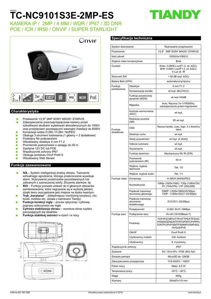 MODEL TC-NC9101S3E-2MP-ES KAMERA IP / 2MP / 4 MM / WDR / IP67 / 3D DNR POE / ICR / IR50 / ONVIF / SUPER STARLIGHT Specyfikacja techniczna System skanowania 1/2.8" 2MP SONY IMX291 STARVIS Ilość pikseli 1920(H)x1080(V) Wyjście video kompozytowe Czułość > 50 dB (wył. AGC) Balans Bieli (ATW) Funkcje podstawowe Obiektyw Funkcja poszerzonej dynamiki (WDR) wł./wył.100dB Redukcja szumów (NR) Funkcje dodatkowe IVA – System inteligentnej analizy obrazu. Tworzenie wirtualnego ogrodzenia, którego przekroczenie wywołuje alarm. Wykrywanie przedmiotów pozostawionych lub zabranych z zaznaczonej strefy. Zliczenie alarmów. itp ROI – Funkcja pozwala ustawić do 4 głównych obszarów zainteresowania, które nagrywane są w wyższej jakości, dzięki temu oszczędzane jest miejsce na dysku twardym. Tryb „korytarza” - dokładniejszy monitoring korytarzy, ulic, tuneli, mostów etc. (działa z kamerami Tiandy) Funkcja korekcji mgły – proces optycznej i cyfrowej poprawy widoczności we mgle Cyfrowa stabilizacja obrazu – wyostrza obraz szybko poruszających się obiektów Funkcja stabilnej ostrości w dzień i w nocy OSD Detekcja ruchu 3D wł./wył. Nazwa kanału, czas, logo, 5 x dowolny tekst wł./wył. Odbicie lustrzane wł./wył. wł./wył. Funkcja dzień/noc Mechaniczny filtr IR (ICR) Promiennik podczerwieni (IR) 50 m Wejście, wyjście alarmowe Tak, 1/0 Wejście, wyjście audio Rozdzielczość Tak, 1/1 H.265/H.264/MJPEG 1080p (1920x1080) / 720p (1280x720) D1 (704x576) / CIF (352x288) Prędkość transmisji strumienia głównego 1080P: (1920x1080)(25/30fps) 720P: (1280x720)(1~25/30fps) Prędkość transmisji strumienia dodatkowego D1/CIF(1~25/30fps) Przepływność H.264: 64 K~16Mbps Podłączenie sieci RJ-45 (10/100Base-T) Protokoły TCP/IP/ICMP/HTTP/HTTPS/FTP/DHC P/DNS/DDNS/RTP/RTSP/RTCP/PPPo E/NTP/UPnP/SMTP/SNMP/IGMP/802. 1X/QoS/IPv6 ONVIF Onvif Profil S Użytkownicy mobilni iOS, Android Użytkownicy 8, 4 poziomy Współczynnik ochrony Zasilanie IP67 DC 12V±10% / POE (802.3af) Gniazdo pamięci MicroSD do 128GB Zabezpieczenie przepięciowe TVS 6000V / 1000V Pobór mocy Maks. 6,5 W Temperatura pracy -35°C ~ 60°C Waga Wymiary Infolinia 801 567 888 wł./wył. wł./wył. (4 strefy) Funkcje video Kompresja Funkcje sieci Auto, Ręczna (1s-1/100000s), zabezpieczenie przed migotaniem Strefy prywatności Wyostrzenie Funkcje zaawansowane 4 mm F1.2 wł./wył. (BLC/HLC) Kontrola wzmocnienia (AGC) Przetwornik 1/2.8" 2MP SONY IMX291 STARVIS Zabezpieczenie przeciwprzepięciowe kamery przed szkodliwymi skutkami wyładowań atmosferycznych do 1000V oraz przepięciami powstającymi wewnątrz instalacji do 6000V Kompresja wideo H.265 / H.264 / MJPEG Obsługa 3 strumieni kodowania (1 główny + 2 dodatkowe) Podwójny filtr podczerwieni Wbudowany obiektyw 4 mm F1.2 Promiennik podczerwieni o zasięgu do 50 m Zasilanie 12V DC lub POE Współczynnik ochrony IP67 Obsługa protokołu Onvif Profil S Wbudowany Web Serwer automatyczny/ręczny Kompensacja światła Migawka Charakterystyka Brak Kolor: 0.0008 Lux/(F1.2, wł. AGC), B/W: 0.0001 Lux/(F1.2, wł. AGC); 0 Lux wł. IR Stosunek S/N Skanowanie progresywne Przetwornik Wszelkie prawa zastrzeżone © 2016 600g 204x97x110 mm www.tiandy.pl