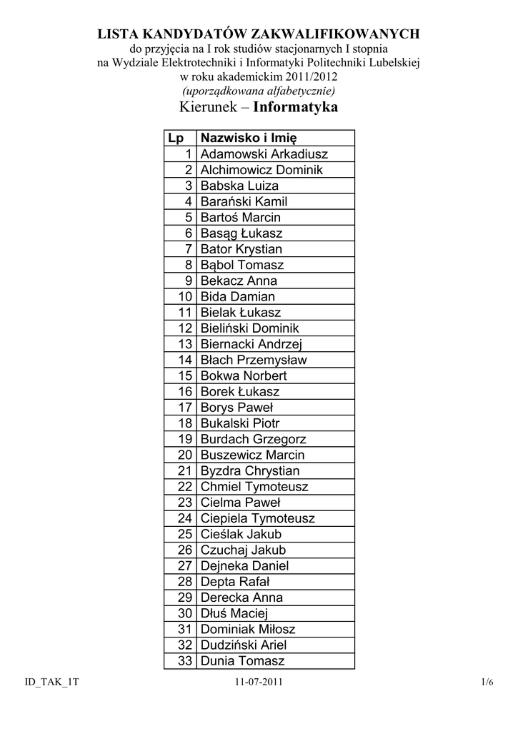 LISTA KANDYDATÓW ZAKWALIFIKOWANYCH do przyjęcia na I rok studiów stacjonarnych I stopnia na Wydziale Elektrotechniki i Informatyki Politechniki Lubelskiej w roku akademickim 2011/2012 (uporządkowana alfabetycznie) Kierunek – Informatyka Lp 1 2 3 4 5 6 7 8 9 10 11 12 13 14 15 16 17 18 19 20 21 22 23 24 25 26 27 28 29 30 31 32 33 ID_TAK_1T Nazwisko i Imię Adamowski Arkadiusz Alchimowicz Dominik Babska Luiza Barański Kamil Bartoś Marcin Basąg Łukasz Bator Krystian Bąbol Tomasz Bekacz Anna Bida Damian Bielak Łukasz Bieliński Dominik Biernacki Andrzej Błach Przemysław Bokwa Norbert Borek Łukasz Borys Paweł Bukalski Piotr Burdach Grzegorz Buszewicz Marcin Byzdra Chrystian Chmiel Tymoteusz Cielma Paweł Ciepiela Tymoteusz Cieślak Jakub Czuchaj Jakub Dejneka Daniel Depta Rafał Derecka Anna Dłuś Maciej Dominiak Miłosz Dudziński Ariel Dunia Tomasz 11-07-2011 1/6 34 35 36 37 38 39 40 41 42 43 44 45 46 47 48 49 50 51 52 53 54 55 56 57 58 59 60 61 62 63 64 65 66 67 68 69 70 71 72 73 ID_TAK_1T Dziak Łukasz Dziarek Paulina Dzięcioł Marek Fiuk Michał Furtak Michał Gdula Artur Gdula Łukasz Gorzelak Piotr Górecki Mateusz Góźdź Rafał Grabias Łukasz Grudzień Mateusz Gryżan Magdalena Grzesińska Magdalena Grzmil Paweł Gumułka Daniel Horodelski Karol Horszczaruk Piotr Izdebski Jakub Jabłoński Dawid Jakóbczak Amadeusz Janaczek Piotr Jarzyna Bartosz Jaskowski Mateusz Jaworski Łukasz Jezierski Michał Kacper Sokołowski Kalisz Paweł Kamiński Adrian Kapitan Justyna Kapitan Łukasz Karasek Mariusz Karwat Amadeusz Kępa Kamil Kępiński Bartosz Kieruczenko Sebastian Klepka Krzysztof Klimek Karol Kobiałka Tomasz Kobylarczyk Monika 11-07-2011 2/6 74 75 76 77 78 79 80 81 82 83 84 85 86 87 88 89 90 91 92 93 94 95 96 97 98 99 100 101 102 103 104 105 106 107 108 109 110 111 112 113 ID_TAK_1T Kolano Dawid Kołodziej Maciej Kołodziejczyk Paweł Konczewska Kamila Kopciński Kacper Kotelba Arkadiusz Kowalczyk Kacper Kowalczyk Radosław Kowalewski Bartosz Kozaczuk Wojciech Kozak Kamil Kozak Paweł Kozieł Piotr Kozioł Konrad Kraska Mateusz Kruk Mateusz Kryczka Ewa Krzysiak Maciej Kubala Małgorzata Kulhawczuk Michał Kurek Kamil Latos Wojciech Lembryk Piotr Lis Michał Liwiak Michał Łagód Mateusz Łukasik Mariusz Łyda Konrad Machul Marcin Maciasz Mateusz Maciąg Krystian Majek Bartosz Majewski Maciej Maleszyk Łukasz Małek Wojciech Marucha Wojciech Matraszek Paweł Matyja Jakub Mazur Piotr Miącz Grzegorz 11-07-2011 3/6 114 115 116 117 118 119 120 121 122 123 124 125 126 127 128 129 130 131 132 133 134 135 136 137 138 139 140 141 142 143 144 145 146 147 148 149 150 151 152 153 ID_TAK_1T Michalik Joanna Michał Lech Michałowski Artur Milewska Iwona Morawiecka Ludmiła Mróz Adrian Mysiak Agata Nowacki Radosław Olak Norbert Oseńko Michał Osuch Paweł Osypiuk Paweł Pacek Marcin Pacek Mateusz Padło Weronika Palak Rafał Pańczyk Piotr Parada Mateusz Pasieczny Przemysław Pawluczuk Monika Pawłowski Daniel Piątek Krystian Pieńkosz Mariusz Pietroń Paweł Prokopiuk Piotr Pronobis Marcin Przybysz Jakub Pudło Przemysław Pylypets Roman Radzikowski Kacper Ratajczyk Tomasz Ratyna Bartłomiej Rębacz Arkadiusz Rosowski Roland Rudziński Michał Rumniak Mariusz Rusinek Robert Sabarański Łukasz Sadowyj Wadim Sajnóg Mateusz 11-07-2011 4/6 154 155 156 157 158 159 160 161 162 163 164 165 166 167 168 169 170 171 172 173 174 175 176 177 178 179 180 181 182 183 184 185 186 187 188 189 190 191 192 193 ID_TAK_1T Sędzielewski Jakub Siegieda Karol Siergiej Łukasz Siwek Michał Skórka Maksym Sławecki Radosław Słowik Marek Sobiesiak Michał Sołtys Paweł Sprawka Przemysław Stangryciuk Marek Stój Paweł Sugier Arkadiusz Suszczyk Daniel Suwała Piotr Szałek Maciej Szamotuła Bartłomiej Szczuchniak Adam Szkurłat Piotr Szlendak Paweł Szostakowski Daniel Tomasiak Kamil Tur Adam Turczyński Łukasz Tymoszuk Maciej Tytkowski Wiktor Voitovych Viktor Warszawski Arkadiusz Wasak Dominika Wasak Marcin Wąsiura Damian Wesołowski Łukasz Węgrzyn Emilia Wieruszewski Norbert Włoch Piotr Włosek Mateusz Wnuk Emil Wojciechowski Marek Woliński Paweł Woźniak Aleksandra 11-07-2011 5/6 194 195 196 197 198 199 200 201 202 203 204 205 Wójcicki Grzegorz Wójcicki Norbert Wójcik Joanna Wójcik Paweł Wójtowicz Marek Wrońska Marta Zarębska Karolina Zarychta Jakub Zarzycki Adam Zbytniewski Krzysztof Żeligowska Michalina Żuber Piotr Sekretarz Przewodniczący Wydziałowej Komisji Rekrutacyjnej Wydziałowej Komisji Rekrutacyjnej ID_TAK_1T 11-07-2011 6/6