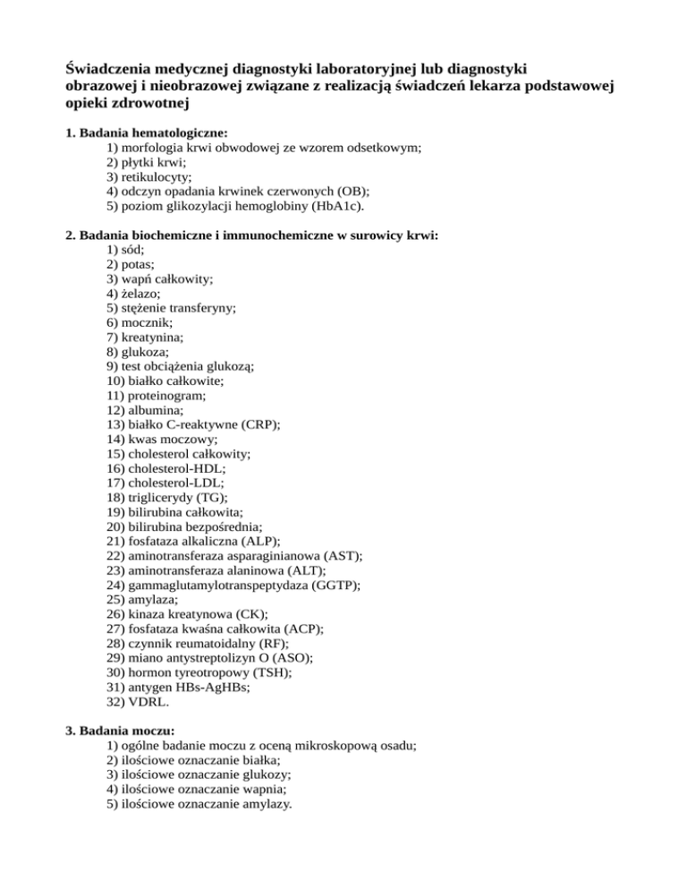 Świadczenia medycznej diagnostyki laboratoryjnej lub diagnostyki obrazowej i nieobrazowej związane z realizacją świadczeń lekarza podstawowej opieki zdrowotnej 1. Badania hematologiczne: 1) morfologia krwi obwodowej ze wzorem odsetkowym; 2) płytki krwi; 3) retikulocyty; 4) odczyn opadania krwinek czerwonych (OB); 5) poziom glikozylacji hemoglobiny (HbA1c). 2. Badania biochemiczne i immunochemiczne w surowicy krwi: 1) sód; 2) potas; 3) wapń całkowity; 4) żelazo; 5) stężenie transferyny; 6) mocznik; 7) kreatynina; 8) glukoza; 9) test obciążenia glukozą; 10) białko całkowite; 11) proteinogram; 12) albumina; 13) białko C-reaktywne (CRP); 14) kwas moczowy; 15) cholesterol całkowity; 16) cholesterol-HDL; 17) cholesterol-LDL; 18) triglicerydy (TG); 19) bilirubina całkowita; 20) bilirubina bezpośrednia; 21) fosfataza alkaliczna (ALP); 22) aminotransferaza asparaginianowa (AST); 23) aminotransferaza alaninowa (ALT); 24) gammaglutamylotranspeptydaza (GGTP); 25) amylaza; 26) kinaza kreatynowa (CK); 27) fosfataza kwaśna całkowita (ACP); 28) czynnik reumatoidalny (RF); 29) miano antystreptolizyn O (ASO); 30) hormon tyreotropowy (TSH); 31) antygen HBs-AgHBs; 32) VDRL. 3. Badania moczu: 1) ogólne badanie moczu z oceną mikroskopową osadu; 2) ilościowe oznaczanie białka; 3) ilościowe oznaczanie glukozy; 4) ilościowe oznaczanie wapnia; 5) ilościowe oznaczanie amylazy. 4. Badania kału: 1) badanie ogólne; 2) pasożyty; 3) krew utajona - metodą immunochemiczną 5. Badania układu krzepnięcia: 1) wskaźnik protrombinowy (INR); 2) czas kaolinowo-kefalinowy (APTT); 3) fibrynogen. 6. Badania mikrobiologiczne: 1) posiew moczu z antybiogramem; 2) posiew wymazu z gardła; 3) ogólny posiew kału w kierunku pałeczek Salmonella, Shigella. 7. Badanie elektrokardiograficzne (EKG) w spoczynku. 8. Badanie ultrasonograficzne (USG) jamy brzusznej. 9. Zdjęcia radiologiczne: 1) zdjęcie klatki piersiowej w projekcji AP i bocznej; 2) zdjęcia kostne - w przypadku kręgosłupa; kończyn i miednicy w projekcji AP i bocznej; 3) zdjęcie czaszki; 4) zdjęcie zatok; 5) zdjęcie przeglądowe jamy brzusznej. Na podstawie zarządzenia Ministra Zdrowia z dnia 22 października 2010r. w sprawie świadczeń gwarantowanych z zakresu podstawowej opieki zdrowotnej.