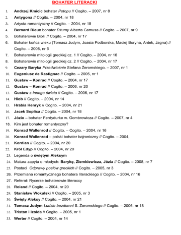 BOHATER LITERACKI 1. Andrzej Kmicic bohater Potopu // Cogito. – 2007, nr 8 2. Antygona // Cogito. – 2004, nr 18 3. Artysta romantyczny // Cogito. – 2004, nr 18 4. Bernard Rieux bohater Dżumy Alberta Camusa // Cogito. – 2007, nr 9 5. Bohaterowie Biblii // Cogito. – 2004, nr 17 6. Bohater końca wieku (Tomasz Judym, Joasia Podborska, Maciej Boryna, Antek, Jagna) // Cogito. – 2008, nr 6 7. Bohaterowie mitologii greckiej cz. 1 // Cogito. – 2004, nr 16 8. Bohaterowie mitologii greckiej cz. 2 // Cogito. – 2004, nr 17 9. Cezary Baryka Przedwiośnie Stefana Żeromskiego. – 2007, nr 1 10. Eugeniusz de Rastignac // Cogito. – 2005, nr 1 11. Gustaw – Konrad // Cogito. – 2004, nr 17 12. Gustaw – Konrad // Cogito. – 2006, nr 20 13. Gustaw z Innego świata // Cogito. – 2006, nr 17 14. Hiob // Cogito. – 2004, nr 14 15. Hrabia Henryk // Cogito. – 2004, nr 21 16. Jacek Soplica // Cogito. – 2004, nr 18 17. Józio – bohater Ferdydurke w. Gombrowicza // Cogito. – 2007, nr 4 18. Kim jest bohater romantyczny? 19. Konrad Wallenrod // Cogito. – Cogito. – 2004, nr 16 20. Konrad Wallenrod – polski bohater bajroniczny // Cogito. – 2004, 21. Kordian // Cogito. – 2004, nr 20 22. Król Edyp // Cogito. – 2004, nr 20 23. Legenda o świętym Aleksym 24. Matura zapyta o młodych: Barykę, Ziemkiewicza, Józia // Cogito. – 2008, nr 7 25. Postaci Odprawy posłów greckich // Cogito. – 2005, nr 3 26. Przemiana romantycznego bohatera literackiego // Cogito. – 2004, nr 16 27. Referat: Rycerze bohaterowie literaccy 28. Roland // Cogito. – 2004, nr 20 29. Stanisław Wokulski // Cogito. – 2005, nr 3 30. Święty Aleksy // Cogito. – 2004, nr 21 31. Tomasz Judym Ludzie bezdomni S. Żeromskiego // Cogito. – 2006, nr 18 32. Tristan i Izolda // Cogito. – 2005, nr 1 33. Werter // Cogito. – 2004, nr 14