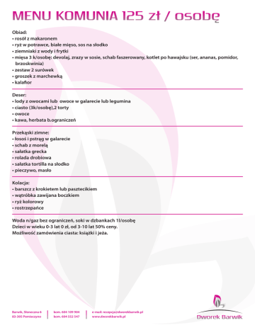MENU KOMUNIA 125 zł / osobę Obiad: • rosół z makaronem • ryż w potrawce, białe mięso, sos na słodko • ziemniaki z wody i frytki • mięsa 3 k/osobę: devolaj, zrazy w sosie, schab faszerowany, kotlet po hawajsku (ser, ananas, pomidor, brzoskwinia) • zestaw 2 surówek • groszek z marchewką • kalafior Deser: • lody z owocami lub owoce w galarecie lub legumina • ciasto (3k/osobę),2 torty • owoce • kawa, herbata b.ograniczeń Przekąski zimne: • łosoś i pstrąg w galarecie • schab z morelą • sałatka grecka • rolada drobiowa • sałatka tortilla na słodko • pieczywo, masło Kolacja: • barszcz z krokietem lub pasztecikiem • wątróbka zawijana boczkiem • ryż kolorowy • rostrzepańce Woda n/gaz bez ograniczeń, soki w dzbankach 1l/osobę Dzieci w wieku 0-3 lat 0 zł, od 3-10 lat 50% ceny. Możliwość zamówienia ciasta: książki i jeża. Barwik, Słoneczna 6 83-305 Pomieczyno kom. 604 109 904 kom. 604 552 547 e-mail: [email protected] www.dworekbarwik.pl Dworek Barwik