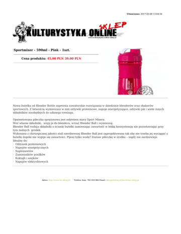 Utworzono: 2017-03-08 13:04:56 Sportmixer - 590ml - Pink - 1szt. Cena produktu: 45,00 PLN 39,00 PLN Nowa butelka od Blender Bottle zapewnia nowatorskie rozwiązania w dziedzinie blenderów oraz shakerów sportowych. Z łatwością wymieszasz w nim odżywki proteinowe, napoje energetyzujące, odżywki jak i wiele innych składników niezbędnych do udanego treningu. Opatentowana piłeczka sprężynowa jest sekretem mocy Sport Mixera. Weź własne składniki, wsyp je do blendera, wrzuć Blender Ball i wymieszaj. Blender Ball rozbija składniki o ścianki butelki zamieniając zawartość w lekką konsystencję nie pozostawiając przy tym żadnych gródek. Wykonana z chirurgicznej jakości stali nierdzewnej Blender Ball jest zaprojektowana tak aby nie trzeba jej wyciągać z butelki dopóki nie wypije się zawartości. Pijesz tylko wodę? Zostaw piłeczkę w środku – nigdy nie zardzewieje. Idealny do: · Odżywek proteinowych · Napojów energetycznych · Suplementów · Zamienników posiłków · Koktajli i szejków · Napojów elektrolitowych Adres: http://www.ko.sklep.pl/ Telefon: kom. 782 010 880 Email: [email protected]