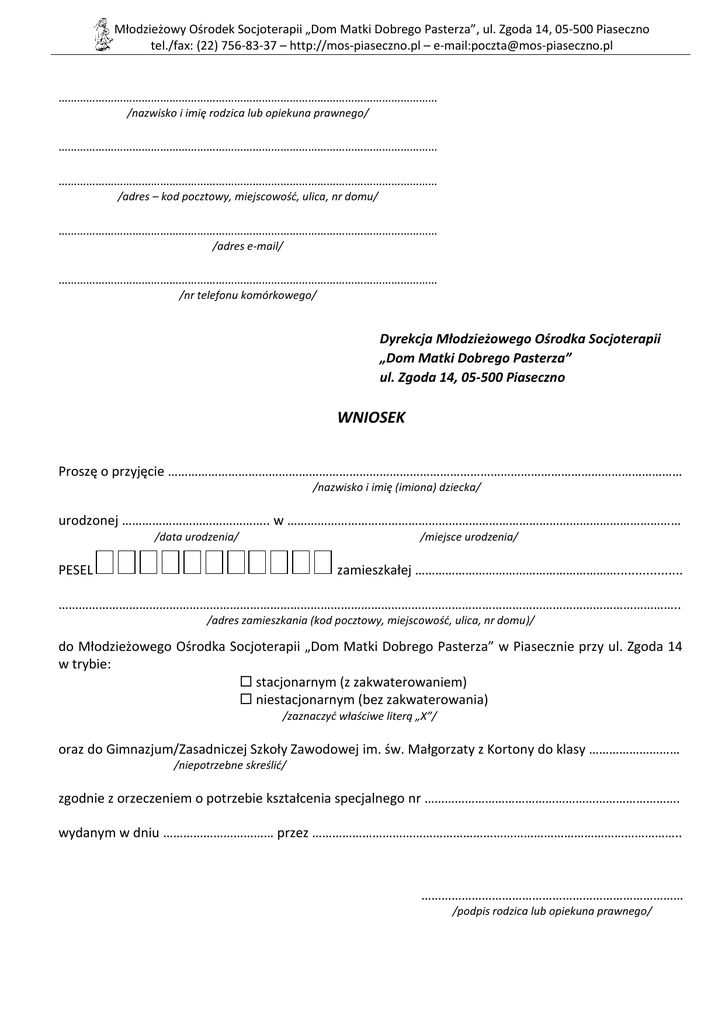 Młodzieżowy Ośrodek Socjoterapii „Dom Matki Dobrego Pasterza”, ul. Zgoda 14, 05-500 Piaseczno tel./fax: (22) 756-83-37 – http://mos-piaseczno.pl – e-mail:[email protected] …………………………………………………………………………………………………………… /nazwisko i imię rodzica lub opiekuna prawnego/ …………………………………………………………………………………………………………… …………………………………………………………………………………………………………… /adres – kod pocztowy, miejscowość, ulica, nr domu/ …………………………………………………………………………………………………………… /adres e-mail/ …………………………………………………………………………………………………………… /nr telefonu komórkowego/ Dyrekcja Młodzieżowego Ośrodka Socjoterapii „Dom Matki Dobrego Pasterza” ul. Zgoda 14, 05-500 Piaseczno WNIOSEK Proszę o przyjęcie ……………………………………………………………………………………………………………………………………… /nazwisko i imię (imiona) dziecka/ urodzonej …………………………………….. w ……………………………………………………………………………………………………… /data urodzenia/ /miejsce urodzenia/ PESEL zamieszkałej …………………………………………………….................. ………………………………………………………………………………………………………………………………………………………………….. /adres zamieszkania (kod pocztowy, miejscowość, ulica, nr domu)/ do Młodzieżowego Ośrodka Socjoterapii „Dom Matki Dobrego Pasterza” w Piasecznie przy ul. Zgoda 14 w trybie: stacjonarnym (z zakwaterowaniem) niestacjonarnym (bez zakwaterowania) /zaznaczyć właściwe literą „X”/ oraz do Gimnazjum/Zasadniczej Szkoły Zawodowej im. św. Małgorzaty z Kortony do klasy ……………………… /niepotrzebne skreślić/ zgodnie z orzeczeniem o potrzebie kształcenia specjalnego nr …………………………………………………………………. wydanym w dniu …………………………… przez ……………………………………………………………………………………………….. …………………………………………………………………… /podpis rodzica lub opiekuna prawnego/ Młodzieżowy Ośrodek Socjoterapii „Dom Matki Dobrego Pasterza”, ul. Zgoda 14, 05-500 Piaseczno tel./fax: (22) 756-83-37 – http://mos-piaseczno.pl – e-mail:[email protected] Młodzieżowy Ośrodek Socjoterapii „Dom Matki Dobrego Pasterza”, ul. Zgoda 14, 05-500 Piaseczno tel./fax: (22) 756-83-37 – http://mos-piaseczno.pl – e-mail:[email protected] …………………………………………………………………………………………………………… /nazwisko i imię rodzica lub opiekuna prawnego/ …………………………………………………………………………………………………………… …………………………………………………………………………………………………………… /adres – kod pocztowy, miejscowość, ulica, nr domu/ …………………………………………………………………………………………………………… /adres e-mail/ …………………………………………………………………………………………………………… /nr telefonu komórkowego/ Dyrekcja Zespołu Szkół im. Św. Małgorzaty z Kortony ul. Zgoda 14, 05-500 Piaseczno WNIOSEK Proszę o przyjęcie ……………………………………………………………………………………………………………………………………… /nazwisko i imię (imiona) dziecka/ urodzonej …………………………………….. w ……………………………………………………………………………………………………… /data urodzenia/ PESEL /miejsce urodzenia/ zamieszkałej …………………………………………………….................. ………………………………………………………………………………………………………………………………………………………………….. /adres zamieszkania (kod pocztowy, miejscowość, ulica, nr domu)/ do Gimnazjum/Zasadniczej Szkoły Zawodowej im. Św. Małgorzaty z Kortony do klasy ……………………………… /niepotrzebne skreślić/ zgodnie z orzeczeniem o potrzebie kształcenia specjalnego nr …………………………………………………………………. wydanym w dniu …………………………… przez ……………………………………………………………………………………………….. …………………………………………………………………… /podpis kandydatki/ …………………………………………………………………… /podpis rodzica lub opiekuna prawnego/ Młodzieżowy Ośrodek Socjoterapii „Dom Matki Dobrego Pasterza”, ul. Zgoda 14, 05-500 Piaseczno tel./fax: (22) 756-83-37 – http://mos-piaseczno.pl – e-mail:[email protected] Młodzieżowy Ośrodek Socjoterapii „Dom Matki Dobrego Pasterza”, ul. Zgoda 14, 05-500 Piaseczno tel./fax: (22) 756-83-37 – http://mos-piaseczno.pl – e-mail:[email protected] DIAGNOZA SYTUACJI WYCHOWANKI 1. Struktura rodziny: pełna niepełna zrekonstruowana (kolejne małżeństwo) zastępcza adopcyjna Uwagi: ………………………………………………………………………………………………………………………………………………………….. ……………