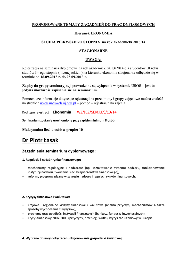 PROPONOWANE TEMATY ZAGADNIEŃ DO PRAC DYPLOMOWYCH Kierunek EKONOMIA STUDIA PIERWSZEGO STOPNIA na rok akademicki 2013/14 STACJONARNE UWAGA: Rejestracja na seminaria dyplomowe na rok akademicki 2013/2014 dla studentów III roku studiów I – ego stopnia ( licencjackich ) na kierunku ekonomia stacjonarne odbędzie się w terminie od 18.09.2013 r. do 25.09.2013 r. Zapisy do grupy seminaryjnej prowadzone są wyłącznie w systemie USOS – jest to jedyna możliwość zapisania się na seminarium. Pomocnicze informacje dotyczące rejestracji na przedmioty i grupy zajęciowe można znaleźć na stronie : www.usosweb.uj.edu.pl – pomoc – rejestracje na zajęcia Kod typu rejestracji Ekonomia WZ/IEZ/SEM.LES/13/14 Seminarium zostanie uruchomione przy zapisie minimum 8 osób. Maksymalna liczba osób w grupie: 10 Dr Piotr Łasak Zagadnienia seminarium dyplomowego : 1. Regulacja i nadzór rynku finansowego: mechanizmy regulacyjne i nadzorcze (np. kształtowanie systemu nadzoru, funkcjonowanie instytucji nadzoru, tworzenie sieci bezpieczeństwa finansowego), reformy przeprowadzane w zakresie nadzoru i regulacji rynków finansowych. 2. Kryzysy finansowe i walutowe: krajowe i regionalne kryzysy finansowe i walutowe (analiza przyczyn, mechanizmów a także sposoby wychodzenia z kryzysów), problemy oraz upadłości instytucji finansowych (banków, funduszy inwestycyjnych), kryzys finansowy 2007-2008 (przyczyny, przebieg, skutki), kryzys zadłużeniowy w Europie. 4. Wybrane obszary dotyczące funkcjonowania gospodarki światowej: analiza struktur: handlu międzynarodowego, działalności inwestycyjnej, działalności produkcyjnej i kształtowania globalnych łańcuchów dostaw. problematyka kształtowania kursów walutowych, kształtowanie sytuacji płatniczej, ewolucja systemów pieniężnych, międzynarodowe rozliczenia finansowe funkcjonowanie korporacji transnarodowych oraz rozwój wybranych globalnych gałęzi przemysłu. 5. Działalność instytucji międzynarodowych: funkcjonowanie wybranych instytucji międzynarodowych - Międzynarodowy Fundusz Walutowy, Bank Światowy, Światowa Organizacja Handlu oraz ich rola we współczesnej światowej gospodarce różne problemy gospodarcze, związane z funkcjonowaniem wyż. wym. instytucji, np. problemy związanie z liberalizacją wymiany handlowej lub działalność pomocowa w sytuacjach kryzysowych. 6. Zarządzanie finansami przedsiębiorstw: finansowanie przedsiębiorstw i kształtowanie struktury kapitału, finansowe aspekty dotyczące decyzji inwestycyjnych, zarządzanie kapitałem obrotowym, wycena przedsiębiorstw analiza finansowa (również wybrane jej obszary np. analiza płynności lub rentowności przedsiębiorstwa). Dr hab. Marta Gancarczyk Obszary tematyczne seminarium 1. Przedsiębiorczość i małe i średnie przedsiębiorstwa (MSP) – zakładanie firmy, zarządzanie procesem wzrostu firmy, wkład MSP w gospodarkę 2. Informacja i doradztwo dla MSP 3. Przedsiębiorczość akademicka – zakładanie i rozwój innowacyjnych firm przez kadrę akademicką i studentów 4. Wsparcie publiczne dla MSP – ocena/ewaluacja programów, zarządzanie wsparciem 5. Strategia organizacji (analiza strategiczna, wybór opcji strategicznych, wdrażanie i kontrola strategii, fuzje i przejęcia, alianse strategiczne) 6. Rozwój regionalny i lokalny; strategie rozwoju regionalnego i lokalnego 7. Zarządzanie przedsiębiorstwem – metody i narzędzia planowania, struktury organizacyjne, przywództwo i motywowanie, systemy i metody kontroli w organizacji 8. Klastry przedsiębiorstw – kooperacja i konkurencja wśród MSP 9. Zarządzanie organizacjami non profit 10. Internacjonalizacja MSP, firmy born global 11. Sektory technologicznie zaawansowane i sektory kreatywne (sektory kultury, rozrywki, mediów, projektowania/wzornictwa, oprogramowania); firmy technologiczne 12. Zarządzanie innowacjami 13. Transfer i dyfuzja technologii w działalności małych i średnich przedsiębiorstw 14. Restrukturyzacja przedsiębiorstw - business process reengineering, lean management, spinoffs, outsourcing Dr Anna Zachorowska - Mazurkiewicz Tematyka seminarium : - nierówności ekonomiczne w współczesnym globalizującym się świecie (nierówności wewnątrz społeczeństw, jak i między narodami); - dyskryminacja ekonomiczna w skali mikro, makro i globalnej (dyskryminacja oparta na płci, grupie etnicznej); - ekonomia rozwoju (rozwój gospodarczy i społeczny, problemy krajów rozwijających i transformujących się); - heterodoksyjne kierunki myśli ekonomicznej, ze szczególnym uwzględnieniem ekonomii instytucjonalnej (ewolucyjnej)(rola historii i instytucji społecznych, takich jak rodzina, religia, szkoła) w kształtowaniu gospodarki Dr Kinga Bauer Tematyka seminarium licencjackiego: System rachunkowości finansowej (na przykładzie przedsiębiorstwa, instytucji) Analiza finansowa przedsiębiorstw (na przykładzie wybranych przedsiębiorstw) Pomiar i ocena rentowności przedsiębiorstw Pomiar i ocena płynności przedsiębiorstw Pomiar i ocena zadłużenia przedsiębiorstw Miejsce budżetowania w systemie zarządzania przedsiębiorstwem Rachunkowość dla celów zarządzania operacyjnego (na przykładzie..) Modele rachunku kosztów wykorzystywane w zarządzaniu przedsiębiorstwem Źródła informacji wykorzystywanych w procesie upadłościowym (lub naprawczym) Możliwości i ograniczenia zwiększania przejrzystości informacyjnej procesu upadłościowego (lub naprawczego) Zarządzanie informacjami w procesie upadłościowym (lub naprawczym) Wycena majątku bankruta Systemy wczesnego ostrzegania przed upadłością Źródła finansowania działalności gospodarczej Zarządzanie przedsiębiorstwem z sektora MSP Dr Małgorzata Kutera Tematyka seminarium : 1. Kreatywna rachunkowość, metody „upiększania” sytuacji majątkowo-finansowej oraz wyniku finansowego spółek 2. Istota oszustw księgowych oraz przestępstw gospodarczych w praktyce 3. Słynne upadki wielkic