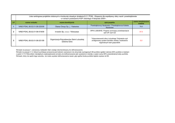 Lista rankingowa projektów złożonych w konkursie otwartym działania 8.2.1 POKL -Wsparcie dla współpracy sfery nauki i przedsiębiorstw - w ramach posiedzenia KOP otwartego 9 listopada 2009 r. LP numer wniosku nazwa beneficjenta tytuł projektu ocena merytoryczna średnia 1 WND-POKL.08.02.01-08-020/09 Otawa Group Sp. j. / Katowice Przedsiębiorczy Naukowiec / Przedsiębiorcza Kobieta Naukowiec 78,5 2 WND-POKL.08.02.01-08-019/09 Investin Sp. z o.o. / Warszawa SPIN LUBUSKIE. Program promujący przedsięwzięcia spin-off i spin-out 57,5 3 WND-POKL.08.02.01-08-021/09 Organizacja Pracodawców Ziemi Lubuskiej /Zielona Góra Trójwymiarowość sfery Lubuskiego Trójmiasta czyli zintegrowany system transferu wiedzy i budowania regionalnych kadr gospodarki 0,0 Wniosek na pozycji 1, oznaczony niebieskim tłem zostaje rekomendowany do dofinansowania. Wnioski na pozycji 2 i 3, których punktacja oznaczona jest kolorem czerwonym nie otrzymały wymaganych 60 punktów ogółem lub/oraz 60% punktów w każdym z pytań 3.1-IV.Warunkiem niezbędnym zaakceptowania wniosku do dofinansowania jest uzyskanie w każdej z części oceny 60% przewidzianej liczby punktów. Wniosek, który nie spełni tego warunku, nie może uzyskać dofinansowania nawet, gdy ogólna liczba punktów będzie wyższa niż 60.