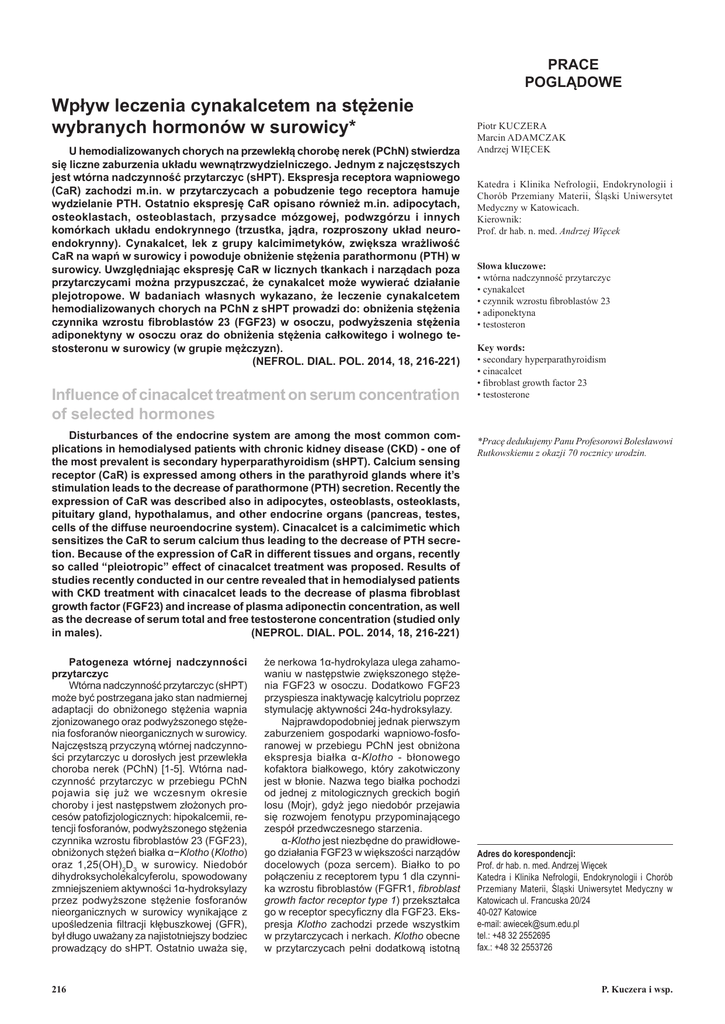 Wpływ leczenia cynakalcetem na stężenie wybranych hormonów w surowicy* U hemodializowanych chorych na przewlekłą chorobę nerek (PChN) stwierdza się liczne zaburzenia układu wewnątrzwydzielniczego. Jednym z najczęstszych jest wtórna nadczynność przytarczyc (sHPT). Ekspresja receptora wapniowego (CaR) zachodzi m.in. w przytarczycach a pobudzenie tego receptora hamuje wydzielanie PTH. Ostatnio ekspresję CaR opisano również m.in. adipocytach, osteoklastach, osteoblastach, przysadce mózgowej, podwzgórzu i innych komórkach układu endokrynnego (trzustka, jądra, rozproszony układ neuroendokrynny). Cynakalcet, lek z grupy kalcimimetyków, zwiększa wrażliwość CaR na wapń w surowicy i powoduje obniżenie stężenia parathormonu (PTH) w surowicy. Uwzględniając ekspresję CaR w licznych tkankach i narządach poza przytarczycami można przypuszczać, że cynakalcet może wywierać działanie plejotropowe. W badaniach własnych wykazano, że leczenie cynakalcetem hemodializowanych chorych na PChN z sHPT prowadzi do: obniżenia stężenia czynnika wzrostu fibroblastów 23 (FGF23) w osoczu, podwyższenia stężenia adiponektyny w osoczu oraz do obniżenia stężenia całkowitego i wolnego testosteronu w surowicy (w grupie mężczyzn). (NEFROL. DIAL. POL. 2014, 18, 216-221) Influence of cinacalcet treatment on serum concentration of selected hormones Disturbances of the endocrine system are among the most common complications in hemodialysed patients with chronic kidney disease (CKD) - one of the most prevalent is secondary hyperparathyroidism (sHPT). Calcium sensing receptor (CaR) is expressed among others in the parathyroid glands where it’s stimulation leads to the decrease of parathormone (PTH) secretion. Recently the expression of CaR was described also in adipocytes, osteoblasts, osteoklasts, pituitary gland, hypothalamus, and other endocrine organs (pancreas, testes, cells of the diffuse neuroendocrine system). Cinacalcet is a calcimimetic which sensitizes the CaR to serum calcium thus leading to the decrease of PTH secretion. Because of the expression of CaR in different tissues and organs, recently so called “pleiotropic” effect of cinacalcet treatment was proposed. Results of studies recently conducted in our centre revealed that in hemodialysed patients with CKD treatment with cinacalcet leads to the decrease of plasma fibroblast growth factor (FGF23) and increase of plasma adiponectin concentration, as well as the decrease of serum total and free testosterone concentration (studied only in males). (NEPROL. DIAL. POL. 2014, 18, 216-221) Patogeneza wtórnej nadczynności przytarczyc Wtórna nadczynność przytarczyc (sHPT) może być postrzegana jako stan nadmiernej adaptacji do obniżonego stężenia wapnia zjonizowanego oraz podwyższonego stężenia fosforanów nieorganicznych w surowicy. Najczęstszą przyczyną wtórnej nadczynności przytarczyc u dorosłych jest przewlekła choroba nerek (PChN) [1-5]. Wtórna nadczynność przytarczyc w przebiegu PChN pojawia się już we wczesnym okresie choroby i jest następstwem złożonych procesów patofizjologicznych: hipokalcemii, retencji fosforanów, podwyższonego stężenia czynnika wzrostu fibroblastów 23 (FGF23), obniżonych stężeń białka α−Klotho (Klotho) oraz 1,25(OH)2D3 w surowicy. Niedobór dihydroksycholekalcyferolu, spowodowany zmniejszeniem aktywności 1α-hydroksylazy przez podwyższone stężenie fosforanów nieorganicznych w surowicy wynikające z upośledzenia filtracji kłębuszkowej (GFR), był długo uważany za najistotniejszy bodziec prowadzący do sHPT. Ostatnio uważa się, 216 że nerkowa 1α-hydrokylaza ulega zahamowaniu w następstwie zwiększonego stężenia FGF23 w osoczu. Dodatkowo FGF23 przyspiesza inaktywację kalcytriolu poprzez stymulację aktywności 24α-hydroksylazy. Najprawdopodobniej jednak pierwszym zaburzeniem gospodarki wapniowo-fosforanowej w przebiegu PChN jest obniżona ekspresja białka α-Klotho - błonowego kofaktora białkowego, który zakotwiczony jest w błonie. Nazwa tego białka pochodzi od jednej z mitologicznych greckich bogiń losu (Mojr), gdyż jego niedobór przejawia się rozwojem fenotypu przypominającego zespół przedwczesnego starzenia. α-Klotho jest niezbędne do prawidłowego działania FGF23 w większości narządów docelowych (poza sercem). Białko to po połączeniu z receptorem typu 1 dla czynnika wzrostu fibroblastów (FGFR1, fibroblast growth factor receptor type 1) przekształca go w receptor specyficzny dla FGF23. Ekspresja Klotho zachodzi przede wszystkim w przytarczycach i nerkach. Klotho obecne w przytarczycach pełni dodatkową istotną PRACE POGLĄDOWE Piotr Kuczera Marcin Adamczak Andrzej Więcek Katedra i Klinika Nefrologii, Endokrynologii i Chorób Przemiany Materii, Śląski Uniwersytet Medyczny w Katowicach. Kierownik: Prof. dr hab. n. med. Andrzej Więcek Słowa kluczowe: • wtórna nadczynność przytarczyc • cynakalcet • czynnik wzrostu fibroblastów 23 • adiponektyna • testosteron Key words: • secondary hyperparathyroidism • cinacalcet • fibroblast growth factor 23 • testosterone *Pracę dedukujemy Panu Profesorowi Bolesławowi Rutkowskiemu z okazji 70 rocznicy urodzin. Adres do korespondencji: Prof. dr hab. n. med. Andrzej Więcek Katedra i Klinika Nefrologii, Endokrynologii i Chorób Przemiany Materii, Śląski Uniwersytet Medyczny w Katowicach ul. Francuska 20/24 40-027 Katowice e-mail: [email protected] tel.: +48 32 2552695 fax.: +48 32 2553726 P. Kuczera i wsp. funkcję w wydzielaniu przez nie PTH. Jest również konieczne do prawidłowej rekrutacji ATPazy sodowo-potasowej do błony komórkowej komórki przytarczyc w warunkach hipokalcemii, co prowadzi do zwiększenia wydzielania PTH przez te komórki [6-8]. Pozakomórkowy fragment błonowego białka Klotho może być „odcinany” przez proteazy związane z błoną komórkową (ADAM10 i/lub ADAM17) i być w związku z powyższym obecny w surow