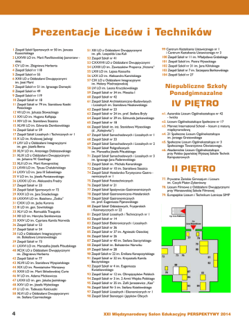 Prezentacje Liceów i Techników 1 Zespół Szkół Sportowych nr 50 im. Janusza Kusocińskiego 2 LXXVIII LO im. Marii Pawlikowskiej-Jasnorzew skiej 3 CV LO im. Zbigniewa Herberta 4 Zespół Szkół nr 118 5 Zespół Szkół nr 55 6 XXII LO z Oddziałami Dwujęzycznymi im. José Martí 7 Zespół Szkół nr 51 im. Ignacego Domeyki 8 Zespól Szkół nr 49 9 Zespół Szkół nr 119 10 Zespół Szkół nr 18 11 Zespół Szkół nr 79 im. Stanisława Kostki Potockiego 12 VII LO im. Juliusza Słowackiego 13 XXI LO im. Hugona Kołłątaja 14 XIV LO im. Stanisława Staszica 15 XLVIII LO im. Edwarda Dembowskiego 16 Zespół Szkół nr 59 17 Zespół Szkół Licealnych i Technicznych nr 1 18 X LO im. Królowej Jadwigi 19 LXV LO z Oddziałami Integracyjnymi im. gen. Józefa Bema 20 XLIV LO im. Antoniego Dobiszewskiego 21 XLIX LO z Oddziałami Dwujęzycznymi im. Johanna W. Goethego 22 XLII LO im. Marii Konopnickiej 23 LXVIII LO im. Tytusa Chałubińskiego 24 LXXV LO im. Jana III Sobieskiego 25 V LO im. ks. Józefa Poniatowskiego 26 LXXXI LO im. Aleksandra Fredry 27 Zespół Szkół nr 23 28 Zespół Szkół Sportowych nr 72 29 XXX LO im. Jana Śniadeckiego 30 LXXXVI LO im. Batalionu „Zośka” 31 CXIX LO im. Jacka Kuronia 32 III LO im. gen. Sowińskiego 33 XLV LO im. Romualda Traugutta 34 XII LO im. Henryka Sienkiewicza 35 XXIV LO im. Cypriana Kamila Norwida 36 Zespół Szkół nr 53 37 Zespół Szkół nr 54 38 I LO z Oddziałami Integracyjnymi im. Bolesława Limanowskiego 39 Zespół Szkół nr 73 41 LXXVI LO im. Marszałka Józefa Piłsudskiego 40 XCIX LO z Oddziałami Dwujęzycznymi im. Zbigniewa Herberta 42 Zespól Szkół nr 77 43 XLVII LO im. Stanisława Wyspiańskiego 44 XIX LO im. Powstańców Warszawy 45 XXIII LO im. Marii Skłodowskiej -Curie 46 IV LO im. Adama Mickiewicza 47 LXXII LO im. gen. Jakuba Jasińskiego 48 XXV LO im. Józefa Wybickiego 49 LI LO im. Tadeusza Kościuszki 50 XLVI LO z Oddziałami Dwujęzycznymi im. Stefana Czarnieckiego 4 51 XIII LO z Oddziałami Dwujęzycznymi im. płk. Leopolda Lisa-Kuli 52 Zespół Szkół nr 41 53 CXXXVII LO z Oddziałami Dwujęzycznymi 54 LXXIII LO im. Zawiszaków Proporca „Victoria” 55 LXIII LO im. Lajosa Kossutha 56 LXX LO im. Aleksandra Kamińskiego 57 CIX LO z Oddziałami Integracyjnymi im. Heleny Modrzejewskiej 58 LVI LO im. Leona Kruczkowskiego 59 Zespół Szkół nr 34 im. Mieszka I 60 Zespół Szkół nr 42 61 Zespół Szkół Architektoniczno-Budowlanych i Licealnych im. Stanisława Noakowskiego 62 Zespół Szkół nr 23 63 Zespół Szkół nr 24 im. prof. Stefana Bryły 64 Zespół Szkół nr 39 im. Edmunda Jankowskiego 65 Zespół Szkół nr 18 66 Zespół Szkół im. inż. Stanisława Wysockiego (d. „Kolejówka”) 67 Zespół Szkół Samochodowych i Licealnych nr 1 68 Zespół Szkół nr 33 69 Zespół Szkół Samochodowych i Licealnych nr 2 70 Zespół Szkół Poligraficznych im. Marszałka Józefa Piłsudskiego 71 Zespół Szkół Samochodowych i Licealnych nr 3 im. Ignacego Jana Paderewskiego 72 Zespół Szkół im. Michała Konarskiego 73 Zespół Szkół nr 10 im. Stanisława Staszica 74 Zespół Szkół Hotelarsko-Turystyczno-Gastro nomicznych nr 1 75 Zespół Szkół Fototechnicznych 76 Zespół Szkół nr 21 77 Zespół Szkół Spożywczo-Gastronomicznych 78 Zespół Szkół Gastronomiczno-Hotelarskich 79 Zespół Szkół Gastronomicznych im. prof. Eugeniusza Pijanowskiego 80 Zespół Szkół Odzieżowych, Fryzjerskich i Kosmetycznych nr 22 81 Zespół Szkół Licealnych i Technicznych nr 1 82 Zespół Szkół nr 14 83 Zespół Szkół Elektronicznych i Licealnych 84 Zespół Szkół nr 36 85 Zespół Szkół nr 37 im. Agnieszki Osieckiej 86 Zespół Szkół nr 26 87 Zespół Szkół nr 40 im. Stefana Starzyńskiego 88 Zespół Szkół im. Bohaterów Narwiku 89 Zespól Szkół nr 28 90 Zespół Szkół nr 22 im. Emiliana Konopczyńskiego 91 Zespół Szkół nr 32 im. Krzysztofa Kamila Baczyńskiego 92 Zespół Szkół nr 4 im. Eugeniusza Kwiatkowskiego 93 Zespół Szkół nr 12 im. Olimpijczyków Polskich 94 Zespół Szkół nr 3 im. 2 Armii Wojska Polskiego 95 Zespół Szkół nr 35 im. Zofii Jaroszewicz „Kasi” 96 Zespół Szkół Nr 5 im. Stefana Kisielewskiego 97 Zespół Szkół Licealnych i Ekonomicznych nr 1 98 Zespół Szkół Stenotypii i Języków Obcych 99 Centrum Kształcenia Ustawicznego nr 1 i Centrum Kształcenia Ustawicznego nr 3 100 Zespół Szkół nr 11 im. Władysława Grabskiego 101 Zespół Szkół im. Piotra Wysockiego 102 Zespół Szkół nr 31 im. Jana Kilińskiego 103 Zespół Szkół nr 7 im. Szczepana Bońkowskiego 104 Zespół Szkół nr 27 Niepubliczne Szkoły Ponadgimnazalne IV PIęTRO n1. Autorskie Liceum Ogólnokształcące nr 42 - Iwicka n2. Liceum Ogólnokształcące Społeczne nr 17 n3. Monnet International School – liceum z maturą międzynarodową n4. 21 Społeczne Liceum Ogólnokształcące im. Jerzego Grotowskiego n5. Społeczne Liceum Ogólnokształcące nr 3 Społecznego Towarzystwa Oświatowego. n6. Akademickie Liceum Ogólnokształcące przy Polsko-Japońskiej Wyższej Szkole Technik Komputerowych II PIęTRO 77. Prywatne żeńskie Gimnazjum i Liceum im. Cecylii Plater-Zyberówny 78. Liceum Filmowe z Oddziałami Dwujęzycznymi przy Warszawskiej Szkole Filmowej 79. Europejskie Liceum i Technikum Lotnicze SIMP XXI Międzynarodowy Salon Edukacyjny PERSPEKTYWY 2014 IV PIęTRO 21st Poland International Education Fair PERSPEKTYWY 2014 5