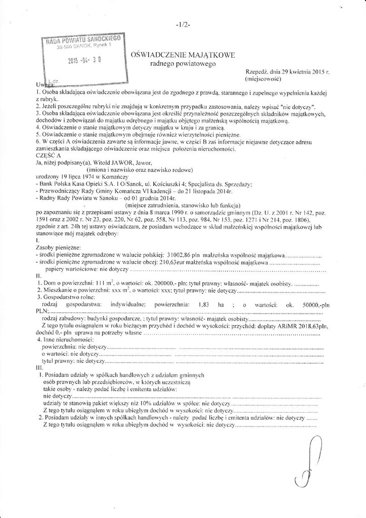 -l12- ffififrtn,łlru slłi\louxi ?!15 -łi, ] l OSWIADCZENIE MAJĄTKOWE radnego powiatowego Rzepedz. dnia 29 kwietnia 20l5 r. (mie jscowość) c]z 1. Osoba składająca oświadczenie obowiązanajest do zgodnego z prawdą, starannego i zupełnego wypełnienia kazdej z rubryk, 2. Jeźeli poszczególne rubryki nie znajdują w konkretnym przypadku zastosowania, należy wpisać ''nie doĘczy''. 3. Osoba składająca ośwjadczęnięobowiązanajest określió przynależnośćposzczególnych składnikólv nlajątkowych, dochodów i zobowiazań do majątku odrębnego imajątku objętego małźeńską wspólnością majatkową. 4. Ośrviadczenie o stanie majątkowym dotyczy majątku w ktaju i za gran icą. 5. Oświadczęnię o stanie majątkowym obejmuje równieź wielzytelności pienięźne. 6. W częściA oświadczenia zawane są infonnacj e j awne, w części B zaś infonnacje niejawne dotyczące adresu zanieszkania składającego oświadczenie oraz miejsca położenianieluchoiności, cZĘSc A Ja, niźej podpisany(a). Witold JAWOR, Jawor, (imiona i nazwisko oraz nazwisko rodowe) urodzony l9 lipca l974 W Komańczy - Bank Polska Kasa opieki S.A- 1 o/Sanok, ul. Kościuszki 4; Specja]ista ds. Sprzedazy; - Przewodniczący Rady Gminy Komańcza Vl kadencji - do 21 listopada 20l4r, - Radny Rady Powiatu w Sanoku - od 01 grudnia 20I4l (nriejsce zatrudnienia. stanorvisko Iub funkcja) po zapoznaniu się z przepisami ustawy Z dnia 8 n]arca 1990 r, o samorządzie gminnym (DZ, U. Z 200l r. Nr ]42, poz. |59l oraz z 2002 r, Nr 23, poz. 220, Nr 62, poz. 558, Nr ll3. poz. 984. NI l53, poz. I27l iNr 2 t4. poz, l806). zgodnie z aI1, 24h tej ustawy oświadczanr. źe posiadanr wchodzące w skład małżeńskiej wspólności majatkowej lub stanoWiącę mój majątek odrębny: l. Zasoby pienięźne: - środkipieniężnę zgromadzone w walucie polskiej: 3l002,86 pln małżeńskawspólność majątkowa.............,.,,.,,,.,, - środki pienięme zgroInadzone w rvalucie obcej: 2l0,63euI małżeńSka Wspólność majątkowa...... papiery rłanościorłe:nie dotlcz; II. l. Dom o powielzchni: l l l m], o wafiości: ok, 200000.- p|n; tytuł pmwny: własność-]najątek osobisty. ......,....._.., 2. Mieszkanie o powierzchni: xxx m2, o wańości; xxx, tytuł prawny: nie dotyczy................,....... , ...,....,. , .. . .. .. 3. Gospodarstwo rolne: rodzaj gospodalstwa: indywidualne; powierzchnia: 1,83 ha ; o wartości: ok. ,, 50000,-pln rodzaj zabudow1,: budynki gospodarcze, ;tytuł prawny: własność-majątek osobisty.... Z tego tytułu osiągnałem w loku bięźącyrn przychód i dochód w wysokości: pl,zychód: dopłaty ARiMR 20l 8.63pln, dochód 0,- pln uprawa na potrzeby własne . . . . , , . , , , . . . . _ 4. Inne n ieruchomości: lIl, ]. Posiadam udziały ł,spółkach handlowych z udziałem gminnych osób prawnych lub przedsiębiorców. w których uczestniczą takje osoby - naleąv podać liczbę ienritęnta udziałów: udziały te stanowią pakiet większy niz l0% udziałów w spółce: nie dotyczy,... Z tego tytułu osiągnąłem w roku ubiegl_łm dochód w lvysokości: nie do§czy,,,,,,., 2. Posiadam udziaty w innych spółkach handlowych - naleźy podać liczbę ięnitęnta udziałów: 1lie doĘyczy...,.,, Z tego §/tu]u osiągnąłem w roku ubiegłym dochód w wysokości: nie dotycz.y..,,......... 0 \j IV. l.Posiadam akcje r.v spółkach handlorvych z udziałenr gminnych osób prawnych lub przedsiębiorców. rv któlych uczestniczą takie osoby - należy podać liczbe i ęnlitenta akcji: nie doq,czlt...... ak(,ię lę slanorĄ ia pakiet lr ieLsz; nrż l00 o akcji rł spóIce: nie dot5 cĄ .,,,,.........,,,,,,,,,,,,,, Z tego tytuhr osiągnałem w loku ubiegłyIn dochód w wysokości: nie dotyczy............. 2. Posiadam akcje lv innych spółkach handlowych - naleźy podać Iiczbę iemitenta akcji: 800 TPSA; 2l5l PGNIC;75 PCCUARD:27 PEKAO; l5]0 PKOBP; rł spoltlośc lllaiqtkorr a, Z tego tytułu osiągnąłem lr, 31 DOMDEV;532 FON;25 KGHM; - nałżeńska roku ubiegłvm dochód w wyso(ości;nie dotyczy,,,,,,....... Nab1'lem (nabył rnó.j trrałźonęk.z rlyłączeniem mienia przynależnego do jego majątku odrębnego) od Skarbu Państwa, innej państworrej osoby prawnej. jedlloStek SamoIZądu 1erytorialnego. ich zlviązków Jub od komunalnej osoby prawnęj następujące mienie, któIe podlegało zbycirr w drodze plzetargu - naleźy podać opis mienia idatę nabycia, od Vl, l. Prowadzę dziaIalnośćgospodarczą (należy podać fotmę prawną i przedmiot działalności):nie doryczy....,,.,,,,....., Z tego t_,-tułu osiągnąłem w roku ubiegl_.,,m przychód i dochód w wysokości; nie dotyczy,,,,,, 2. Zal'ządzan działalnościagospodarczą lub.jestem przedstawicieleln pełnomocnikiem takiej działalności(nalezy podac lorlne prarł na i pruedmiot tlzialalnoscil: nie doq c4 ,............ - rł spóIn ie z inn5 m i o,obam i n ic dotl c4 ,,,,,,,,,,,,, Z tego tytułu osiągnąlem w roku ubiegłynl dochód w wysokości: nie dot),cł,....... VI|. W spółkach handlou,r,ch (nazwa, siedziba spółki): nie dotyczy -1etteln ezIotlkieln rad; nadzorczej łod kied1 i: niśJo§c1\,,.,...,..,,, - 1estellt czlottkieln kolnisi i rerł izl.jnej r od k icd1 1: nit Llot; cz1,.,,,,,,,,,,, Z tego tytułu osiąglrąłeln w roku ubiegłym dochód lv wysokości: nie dotycz_r-......,,,, VIll Inne dochod1" osiągane Z t}lułu Zatrudnienia lub innej działalnościzarobkorve.j lub zajeć, z podaniem kwot uzyskirvanych z każdego rytułu: dochód ż tytułu umowy Za pracę w roku bieżącynl rnalżeliska wspólność maialko\tJ-Oóó5l.]8pln: dieq radnęgo l0750.- pllr,,,,,,,,,.....,,,,,,,,..., lx. Składniki mienia ruchomego o wańości powyżej l0,000 złotych (w przypadku pojazdów nechanicznych naleźy podać markę, nodel i rok produkcji): Opel Meriva, rok prod,2009- rnałźeńska wspólność maiątkowa.,,,..,,. X, Zoborviązania pieniężne o wańości powyżej l0.000 złotych, w t},m zaciągnięte kredyty ipozyczki oraz warunki, na 