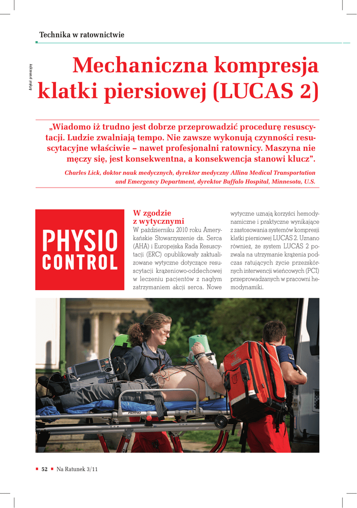 Artykuł promocyjny Technika w ratownictwie Mechaniczna kompresja klatki piersiowej (LUCAS 2) „Wiadomo iż trudno jest dobrze przeprowadzić procedurę resuscytacji. Ludzie zwalniają tempo. Nie zawsze wykonują czynności resuscytacyjne właściwie – nawet profesjonalni ratownicy. Maszyna nie męczy się, jest konsekwentna, a konsekwencja stanowi klucz”. Charles Lick, doktor nauk medycznych, dyrektor medyczny Allina Medical Transportation and Emergency Department, dyrektor Buffalo Hospital, Minnesota, U.S. W zgodzie z wytycznymi W październiku 2010 roku Amerykańskie Stowarzyszenie ds. Serca (AHA) i Europejska Rada Resuscytacji (ERC) opublikowały zaktualizowane wytyczne dotyczące resuscytacji krążeniowo-oddechowej w leczeniu pacjentów z nagłym zatrzymaniem akcji serca. Nowe  52  Na Ratunek 3/11 wytyczne uznają korzyści hemodynamiczne i praktyczne wynikające z zastosowania systemów kompresji klatki piersiowej LUCAS 2. Uznano również, że system LUCAS 2 pozwala na utrzymanie krążenia podczas ratujących życie przezskórnych interwencji wieńcowych (PCI) przeprowadzanych w pracowni hemodynamiki. Technika w ratownictwie – WYTYCZNE ERC I AHA 2010 Zaktualizowane wytyczne AHA i ERC kładą większy nacisk na znaczenie wcześnie zastosowanych, nieprzerwanych i charakteryzujących się wysoką jakością ucisków klatki piersiowej podczas resuscytacji. Podczas manualnego masażu klatki piersiowej zarówno ERC, jak i AHA zalecają głębokość wynoszącą co najmniej 5 cm i częstość wynoszącą co najmniej 100 na minutę. Masaż klatki piersiowej należy stosować podczas ładowania defibrylatora oraz niezwłocznie po defibrylacji, aby zapobiec powstawaniu przerw. W celu zre- dukowania czynnika zmęczenia ratownicy powinny zmieniać się co dwie minuty. Trudno jest ratownikom utrzymać właściwe tempo i jakość ucisków zgodne z nowymi wytycznymi. LUCAS 2 wykonuje uciski w tempie 100 na minutę. Można dokonać wyboru pomiędzy działaniem w trybie 30:2 (dorośli pacjenci niezaintubowani) lub w trybie ciągłym (z krótkim alarmem 8 razy na minutę) w celu ułatwienia wentylacji z właściwymi odstępami. Ponieważ urządzenie LUCAS 2 minimalizuje czas, w którym konieczne jest użycie rąk ratownika podczas prowadzonej resuscytacji pacjenta, minimalizacji podlega opóźnienie pomiędzy kompresją klatki piersiowej i defibrylacją. Dobrze zorganizowane miejsce zdarzenia W czasie gdy LUCAS 2 prowadzi systematyczne uciski, prowadzący akcję są w stanie zarządzać miejscem zdarzenia. LUCAS 2 pozwala na pełną koncentrację na czynnościach związanych z ratowaniem pacjenta, takich jak podawanie leków, defibrylacja czy wentylacja. Działaniu urządzenia towarzyszy niski poziom hałasu, minimalizujący stres. Mały ciężar, kompaktowa konstrukcja i wygodna torba sprawiają, iż łatwo jest przenosić LUCAS 2. Optymalne działanie w każdych warunkach Urządzenie LUCAS 2 jest przeznaczone do optymalnego działania w większości sytuacji i w różnych warunkach. Może ono być zastosowane u pacjenta niezależnie od tego, czy leży na trawie, na łóżku, czy też na noszach lub w ambulansie. LUCAS 2 daje możliwość efektywnej kompresji klatki piersiowej podczas transportowania do szpitala. System może stanowić część klinicznych rozwiązań nowoczesnego programu resuscytacji. Działa w parze z terapiami schładzającymi lub urządzeniami impedancji progowej, dążąc do osiągnięcia całościowego podejścia do procedury resuscytacji pacjenta.  Physio-Control dział firmy Medtronic Poland Sp. z o.o. 04-041 Warszawa ul. Ostrobramska 101 tel. 22 465 69 00 fax 22 465 69 17 www.physio-control.pl www.naratunek.elamed.pl  53