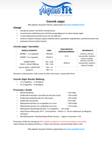 Cennik zajęć Aby zapisać się przez intenet, zapraszamy na www.aquafit.net.pl Uwagi • • • • • stosujemy system karnetów miesięcznych, cena karnetu uzależniona jest od ilości przypadających na dany miesiąc zajęć, w razie planowanej nieobecności nie ma odliczeń, można w danym miesiącu zajęcia odrobić lub po uprzednim uzgodnieniu i poinformowaniu nas przekazać karnet osobie trzeciej. Cennik zajęć i karnetów RODZAJ KARNETU CENA KARNET 1x w tygodniu 100,00 zł KARNET 2x w tygodniu 190,00 zł KARNET OPEN AQUA + Nordic Walking 100 + 45zł 180 + 45zł Karnet AQUA + DIETETYKA grupowa 100 + 15 180 + 15 CENA WEJŚCIA JEDNORAZOWEGO 27 zł 38,00 zł INFORMACJA emeryci, renciści, nauczyciele, studenci minus % zniżka emeryci, renciści, nauczyciele, studenci minus % zniżka Stosujemy indywidualne zniżki nawet do 20%. Informacje u właścicielki firmy. Cennik Zajęć Nordic Walking • • 1x w tygodniu - 11 zł/zajęcia 2x w tygodniu - 10 zł/zajęcia Promocje i Zniżki • • • • • • • • • Karnet Rodzinny – 5% zniżki, Zniżka dla emerytów, rencistów (po 60 roku życia) – 10% zniżki, Zniżka dla studentów (do 26. roku życia) – 10% zniżki Zniżka dla nauczycieli – 5% zniżki Wykupienie karnetu 2x w tygodniu na 3 mce – 10% zniżki, Wykupienie karnetu 2x w tygodniu na 6 mcy – 15% zniżki, Wykupienie dowolnego karnetu 1x w tygodniu – 5% zniżki. Aqua Fitness Wieczysta, SP17, Cena karnetu - 100 ZŁ (+/- 20 zł w zależności od długości miesiąca) Dla klubowiczów Wrocławskiego Klubu Seniora – zajęcia w karrnecie 17zł. Promocje i zniżki nie sumują się. Brak wpłaty za zajęcia w terminie powoduje utratę zniżki. Jeżeli miesiąc jest dłuższy/krótszy o 1 dzień cena karnetu wzrasta/maleje tylko o 22zł Aby zapisać się przez intenet, zapraszamy na www.aquafit.net.pl
