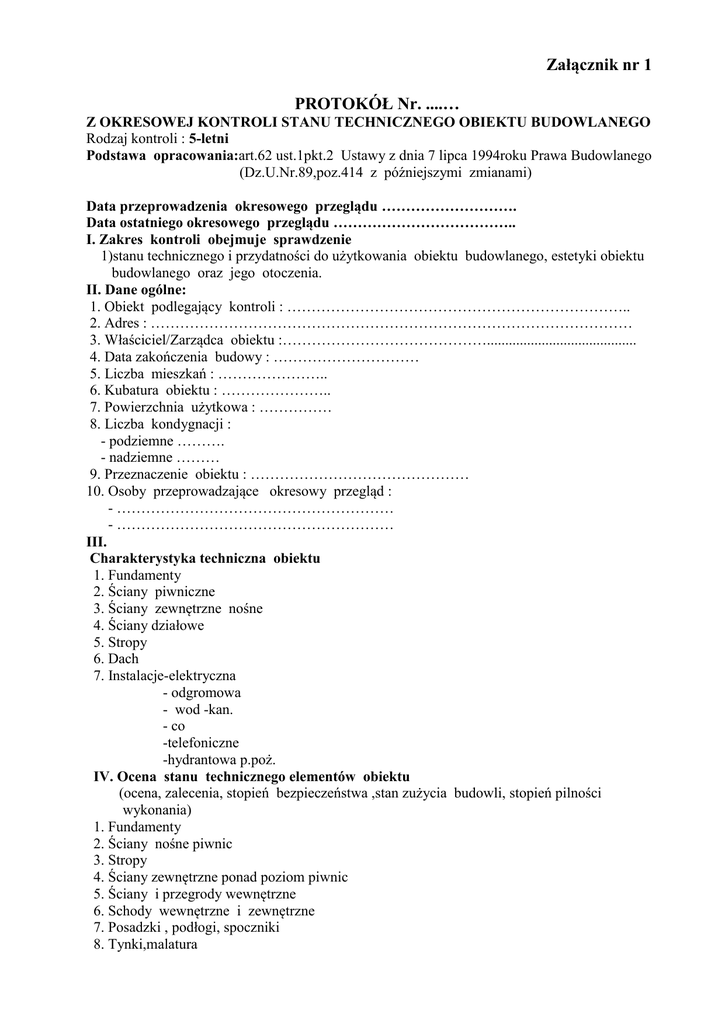 Załącznik nr 1 PROTOKÓŁ Nr. ....… Z OKRESOWEJ KONTROLI STANU TECHNICZNEGO OBIEKTU BUDOWLANEGO Rodzaj kontroli : 5-letni Podstawa opracowania:art.62 ust.1pkt.2 Ustawy z dnia 7 lipca 1994roku Prawa Budowlanego (Dz.U.Nr.89,poz.414 z późniejszymi zmianami) Data przeprowadzenia okresowego przeglądu ………………………. Data ostatniego okresowego przeglądu ……………………………….. I. Zakres kontroli obejmuje sprawdzenie 1)stanu technicznego i przydatności do użytkowania obiektu budowlanego, estetyki obiektu budowlanego oraz jego otoczenia. II. Dane ogólne: 1. Obiekt podlegający kontroli : …………………………………………………………….. 2. Adres : ……………………………………………………………………………………… 3. Właściciel/Zarządca obiektu :……………………………………......................................... 4. Data zakończenia budowy : ………………………… 5. Liczba mieszkań : ………………….. 6. Kubatura obiektu : ………………….. 7. Powierzchnia użytkowa : …………… 8. Liczba kondygnacji : - podziemne ………. - nadziemne ……… 9. Przeznaczenie obiektu : ……………………………………… 10. Osoby przeprowadzające okresowy przegląd : - ………………………………………………… - ………………………………………………… III. Charakterystyka techniczna obiektu 1. Fundamenty 2. Ściany piwniczne 3. Ściany zewnętrzne nośne 4. Ściany działowe 5. Stropy 6. Dach 7. Instalacje-elektryczna - odgromowa - wod -kan. - co -telefoniczne -hydrantowa p.poż. IV. Ocena stanu technicznego elementów obiektu (ocena, zalecenia, stopień bezpieczeństwa ,stan zużycia budowli, stopień pilności wykonania) 1. Fundamenty 2. Ściany nośne piwnic 3. Stropy 4. Ściany zewnętrzne ponad poziom piwnic 5. Ściany i przegrody wewnętrzne 6. Schody wewnętrzne i zewnętrzne 7. Posadzki , podłogi, spoczniki 8. Tynki,malatura 9. Balustrady 10. Stolarka okienna 11. Stolarka drzwiowa 12. Stropodach ,więźba dachowa, pokrycie dachowe, obróbki blacharskie 13. Kominy -obudowa 14. Elewacja 15. Balkony/loggie 16. Instalacja wodna (pion) 17.Instalacja kanalizacyjna(pion) 18. Instalacja c.o. (pion) 19. Instalacja kanalizacyjna deszczowa(pion) 20. Oświetlenie wewnętrzne i zewnętrzne 21. Wyjście na dach, drabina 22. Stan techniczny pomieszczeń specjalnych(przyłączy gazu, wodomierza, węzła cieplnego, pralni, suszarni. hydroforni, kotłowni blokowej) 23. Inne elementy, urządzenia, instalacje(drogi, chodniki, miejsca postojowe, zieleń, ogrodzenia, miejsca gromadzenia odpadów stałych, obiekty małej architektury, urządzenia rekreacyjne ) 24. Inne zalecenia, opinie, uwagi, postanowienia. 25 Określenie lokalizacji i sporządzenie inwentaryzacji azbestu, jeżeli w obiekcie są miejsca i produkty zawierające azbest stanowiąc zagrożenie jest/brak 26. Dokumentacja graficzna/fotograficzna wykonana w toku kontroli w załączeniu. V. Uwagi końcowe Coroczne przeglądy wewnętrznych instalacji gazowych i urządzeń, instalacji elektrycznych i odgromowej oraz kominowych zlecanych przez S.M. są dokonywane osobną kontrolą i osobnymi protokołami. Przegląd stanu technicznego sprawności obiektu wypadł pozytywnie/negatywnie Stwierdza się, że obiekt nie/wykazuje zagrożeń/nia w zakresie stabilności konstrukcji, oraz jest zdatny do użytkowania na przeznaczone ku temu cele, określone w niniejszym protokole i szczegółowych protokołach okresowych kontroli obiektu instalacji i otoczenia. Protokół sporządzono w 2- egzemplarzach, pierwszy w celu załączenia do książki obiektu budowlanego, drugi dla osoby, która przeprowadziła kontrolę. Zarządca/ obiektu Podpis kontrolującego
