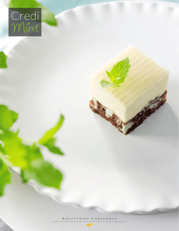 Credi Mint Kreat y wna Cukiernia Credi Mint Nowe ciasto Credi Mint to pyszny mariaż subtelnej słodyczy z chłodną świeżością mięty. Swój smak i aromat zawdzięcza naturalnemu olejkowi miętowemu. Dzięki Credi Mint możesz wzbogacić ofertę cukierni o dystyngowane, eleganckie desery i oryginalne, orzeźwiające ciasteczka. Choco Mint Cake Blat czekoladowo-miętowy Krem waniliowy Ciasto Chocolada 500 Jaja 175 Olej 200 Woda 100 Wymieszać składniki (2 min, wolne obroty). Nie ubijać! CF Nadzienie waniliowe 2000 Śmietana 30% 2000 Credi Fond neutralny 400 Woda 400 Śmietanę ubić, dodać CF Nadzienie o smaku waniliowym. Credi Fond neutralny rozpuścić w wodzie i połączyć z masą śmietanową. Gotową masę nałożyć na wypieczony blat i udekorować. Credi Mint 500 Jaja 150 Olej 150 Woda 150 Wymieszać składniki (2 min, wolne obroty). Nie ubijać! Żelka Wyszprycować naprzemiennie obie masy. Dodatkowo wyszprycować cienkie paski nadzienia CF Wiśnie w żelu 65% (ok. 1000 g). Piec w temp. 170 °C przez ok. 30 min. Credigel Instant 25 Cukier 125 Woda (wrząca) 500 Credigel Instant wymieszać z cukrem i rozpuścić we wrzącej wodzie. Nałożyć na przestygnięte ciasto. Choco Mint Cookies Credi Mint Mąka pszenna T550 Kakao Margaryna Cukier puder Jaja 300 500 50 450 200 50 Margarynę, cukier puder i jaja ubić (10 min, szybkie obroty). Mąkę pszenną wymieszać z kakao oraz z Credi Mint. D N Polska Sp. z o.o. ul. Czysta 6 55-050 Sobótka Suchą mieszankę dodać do napowietrzonej margaryny. Całość mieszać przez 1 min do uzyskania jednolitej konsystencji. Szprycować z worka cukierniczego za pomocą karbowanej tylki lub z użyciem maszyny typu dropping. Piec w temp. 200 °C przez ok. 11-12 min, w zależności od masy ciasteczek. tel. (+48) 71 316 2124 wew. 127 — fax 126 [email protected] www.credin.pl