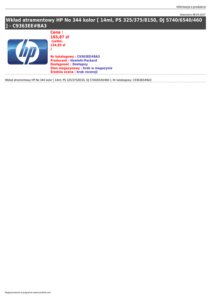Informacje o produkcie Utworzono 08-03-2017 Wkład atramentowy HP No 344 kolor [ 14ml, PS 325/375/8150, DJ 5740/6540/460 ] - C9363EE#BA3 Cena : 165,87 zł (netto: 134,85 zł ) Nr katalogowy : C9363EE#BA3 Producent : Hewlett-Packard Dostępność : Dostępny Stan magazynowy : brak w magazynie Średnia ocena : brak recenzji Wkład atramentowy HP No 344 kolor [ 14ml, PS 325/375/8150, DJ 5740/6540/460 ]. Nr katalogowy: C9363EE#BA3 Wygenerowano w programie www.oscGold.com