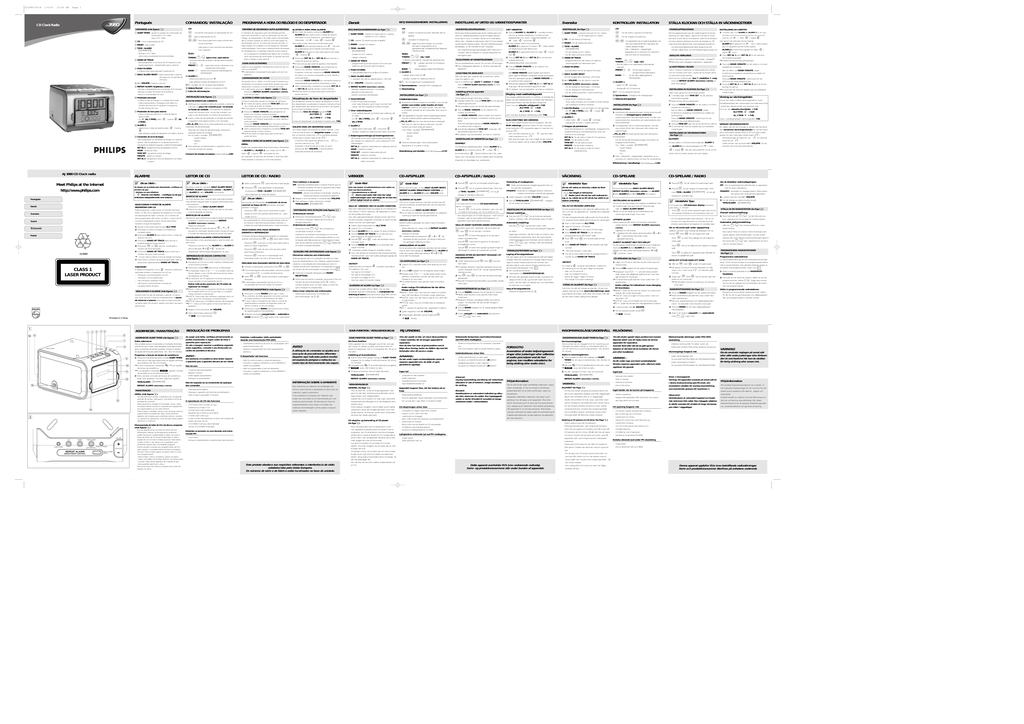 AJ3980/00-B 1/6/03 10:45 AM Page 1 Português 3980 CD Clock Radio AJ COMANDOS/ INSTALAÇÃO CD: COMANDOS (vide figuras 1) 1SLEEP TIMER - ajusta as opções do controlador de tempo para CD / rádio - liga o CD / rádio. 2CD - inicia a reprodução do CD 3RADIO - liga o rádio 4TIME / ALARM - inicia/faz uma pausa na reprodução do CD -pára a reprodução do CD. / CD / RADIO OFF - desliga o CD / rádio - selecciona visualização da hora do relógio 5WAKE-UP TRACK - para programar a sua faixa de CD favorita como opção para faixa - despertador para o alarme. 6PUSH TO OPEN - empurre este canto para abrir a porta do CD 7DAILY ALARM RESET - para interromper o alarme activado por um período de 24 horas 8+ / - VOLUME - regula o volume 9REPEAT ALARM/ brightness control -desliga o despertador por um período de 9 minutos; -desliga a função de tempo de sonolência; -altera a luminosidade do visor 0Mostrador principal - indica a hora do relógio e o estado da função. - indica brevemente a frequência de rádio e o número da faixa do CD quando a respectiva função estiver em uso !Mostrador da hora para alarme - indica a hora para alarme e o modo de alarme seleccionado: - CD (AL 1 TIME), rádio / buzina (AL 2 TIME) @ALARM 2 - selecciona o modo de alarme rádio / buzina . - liga/ desliga a opção de despertar com rádio / buzina #Comandos do ecrã de toque São visualizados os comandos do relógio no modo de espera. São visualizados os comandos de pré-sintonização do rádio/CD quando o rádio/CD está ligado. SET AL 1 - programa a hora do despertar com CD HOUR - acerta as horas TIME SET - programa a hora do relógio MINUTE - acerta os minutos SET AL 2 - programa a hora do despertar com rádio / buzina AJ3980 CD Clock radio ALARME Se deseja ser acordado pelo despertador, certifique-se primeiro de que: - desligou os auscultadores. http://www.philips.com Alarme com Rádio: : certifique-se de que sintonizou adequadamente uma estação. Português SELECCIONAR O MODO DE ALARME DESPERTAR COM CD Pode programar e seleccionar um número de faixa entre 1 e 99, com o aparelho em espera ou no modo de reprodução de rádio. Contudo, se o número de faixa programado não existir no disco, o leitor de CD iniciará a reprodução a partir da primeira faixa durante o toque de despertar. 1. Ajuste a hora para alarme para AL1 TIME 2. Introduza um disco compacto no respectivo compartimento. 3. Pressione ALARM 1 para seleccionar o modo de alarme com CD. 4. Pressione WAKE-UP TRACK para activar a programação da faixa favorita. 5. Pressione ou até ser visualizado o número da faixa desejada. 6. Pressione WAKE-UP TRACK para confirmar o número da faixa seleccionada. = O visor volta a indicar a hora do relógio em espera. 7. Para rever o número da faixa programada, volte a pressionar repetidamente WAKE-UP TRACK. Dansk Svenska Suomi Έλληνικά W Polski AJ3980 Importante! A opção de despertar com o besouro substituirá automaticamente o despertar com CD se: – introduziu incorrectamente um CD; – introduziu um CD danificado; – não introduziu qualquer disco; – não fechou correctamente a tampa do compartimento do disco. CLASS 1 LASER PRODUCT DESLIGANDO O ALARME (vide figuras 4) Existem três formas de desligar o alarme. A menos que você cancele o alarme completamente, a opção de reiniciar o alarme será seleccionada automaticamente após 59 minutos, desde a primeira vez que o alarme soe. Printed in China 1 ADORMECER / MANUTENÇÃO 1 2 3 45 6 ^ & 7 8 9 0 ! # % @ $ 2 SH PU TO N PE O VOLUME CD RADIO SLEEP TIMER TIME / ALARM CD / RADIO OFF REPEAT ALARM BRIGHTNESS CONTROL Radio: TUNING / (para cima / para baixo) - sintoniza automaticamente/ manualmente estações de rádio PRESET 1 - 5 - para seleccionar/ memorizar uma estação pré-sintonizada BAND - selecciona a faixa de radiofrequência FM/MW(AM). $ALARM 1 - selecciona alarme com CD . - liga/ desliga a opção de despertar com CD %p - tomada de 3,5 mm para auscultadores ^Antena flexível - melhora a recepção em FM &Cabo De Alimentação INSTALAÇÃO (vide figuras 2) ABASTECIMENTO DE CORRENTE 1. Verifique se o abastecimento de corrente, conforme indicado na placa de classificação localizada no fundo da unidade, corresponde ao abastecimento de corrente local. Se tal não suceder, consulte o seu distribuidor ou centro de assistência. 2. Ligue o cabo de alimentação à tomada da parede. O aparelho está agora pronto a ser utilizado. ...PH...IL..IPS mover-se-á continuadamente ao longo do mostrador de demonstração. • Para sair do modo de demonstração, pressione qualquer botão da unidade. Por ex.TIME / ALARM CD / RADIO OFF SLEEP TIMER RADIO CD 3. Para desligar completamente o aparelho, tire a ficha da tomada da parede. Consumo de energia em espera (modo horário)....1.5W LEITOR DE CD Dicas Utéis : Meet Philips at the Internet WAKE-UP TRACK DAILY ALARM RESET ADORMECER (SLEEP TIMER vide figuras 7) Sobre adormecer Esta unidade possui incorporado um contador de tempo, permitindo que o rádio seja desligado automaticamente após um período de tempo ajustado. Existem 3 opções de ajuste de hora para adormecer : 60 , 30 e 15 minutos. Programar a função de tempo de sonolência 1. Pressione momentaneamente o botão SLEEP TIMER duas vez ou mais para seleccionar as opções de tempo de sonolência: 60, 30 e 15 minutos =O visor indicará por momentos ”SL:” e as opções de tempo de sonolência. =É visualizada a indicação quando o tempo de sonolência se encontra activado. 2. Para cancelar a função de tempo de sonolência, pode usar qualquer uma das seguintes opções: • TIME/ALARM CD / RADIO OFF • REPEAT ALARM/ BRIGHTNESS CONTROL MANUTENÇÃO GERAL (vide figuras 8) • Se não tenciona utilizar o aparelho por um grande período de tempo, desligue-o, retirando a ficha da tomada de corrente. • Não exponha a unidade à humidade, chuva, areia ou aquecimento excessivo causado por equipamentos aquecedores ou luz solar directa. • Para