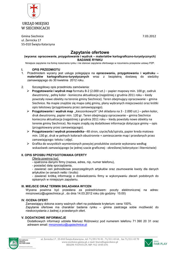 URZĄD MIEJSKI W SIECHNICACH Gmina Siechnice ul. Żernicka 17 55-010 Święta Katarzyna 7.03.2012 Zapytanie ofertowe (wycena: opracowanie, przygotowanie i wydruk – materiałów kartograficzno-turystycznych) BADANIE RYNKU Niniejsze zapytanie ma formę rozeznania rynku i nie stanowi zapytania ofertowego w rozumieniu przepisów ustawy PZP. I. 1. 2. OPIS PRZEDMIOTU Przedmiotem wyceny jest usługa polegająca na opracowaniu, przygotowaniu i wydruku – materiałów kartograficzno-turystycznych wraz z bezpłatną dostawą do siedziby zamawiającego do 30 kwietnia 2012 roku. Szczegółowy opis przedmiotu zamówienia: Przygotowanie i wydruk map formatu B-2 (2.000 szt.) – papier mapowy min. 100 gr, zadruk dwustronny , pełny kolor - konieczna aktualizacja (najpóźniej z grudnia 2011 roku – kiedy powstały nowe obiekty na terenie gminy Siechnice). Teren obejmujący opracowanie – gmina Siechnice. Na mapie znajdzie się mapa całej gminy, plany wybranych miejscowości oraz krótki opis tekstowy (przygotowany przez zamawiającego). Przygotowanie i wydruk map „kieszonkowych” (A4 składana na 3 - 2.000 szt.) – pełen kolor, druk dwustronny, papier min. 120 gr. Teren obejmujący opracowanie – gmina Siechnice konieczna aktualizacja (najpóźniej z grudnia 2011 roku – kiedy powstały nowe obiekty na terenie gminy Siechnice). Na mapie znajdą się dodatkowe informacje dotyczące gminy – opis (przygotowany przez zamawiającego). Przygotowanie i wydruk przewodnika– 48 stron, szycie/lub/spirala, papier kreda matowa min. 130 gr, druk w pełnych kolorach obustronnie + zamieszczenie map i przesłanych przez zamawiającego: tekstu i zdjęć. Grafika do wszystkich wymienionych powyżej produktów zostanie wykonana według wskazówek zamawiającego (w jednej szacie graficznej - określonej kolorystyce i liternictwie) II. OPIS SPOSBU PRZYGOTOWANIA OFERTY Oferta powinna być: - opatrzona danymi firmy (nazwa, adres, nip, numer telefonu), - posiadać datę sporządzenia, - zawierać cen jednostkowe poszczególnych artykułów oraz zsumowanie kwoty dla danych artykułów (w cenach netto i brutto) - zawierać krótką informację o doświadczeniu firmy w wykonywaniu zleceń podobnych do opisanych w niniejszym zapytaniu. III. MIEJSCE ORAZ TERMIN SKŁADANIA WYCEN Wycena powinna być przesłana za pośrednictwem: poczty elektronicznej [email protected] , do dnia 14.03.2012 roku (do godziny 15:00) na adres: IV. OCENA OFERT Zamawiający dokona oceny waŜnych ofert na podstawie kryterium: cena 100%. Zapytanie ofertowe ma charakter badania rynku – gmina zastrzega sobie moŜliwość do nieskorzystania z Ŝadnej z przesłanych ofert. V. DODATKOWE INFORMACJE Dodatkowych informacji udziela Mariusz RóŜnowicz pod numerem telefonu 71 390 20 31 oraz adresem email: [email protected] ul. Żernicka 17 , 55-010 Święta Katarzyna , tel. 71/391 91 01 , 71/311 43 64 , fax 71/311 43 70 www.siechnice.gmina.pl, e-mail: [email protected] REGON: 931935129, NIP: 912 10 05 691