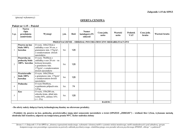 Załącznik 1.15 do SIWZ ............................................ (pieczęć wykonawcy) OFERTA CENOWA Pakiet nr 1.15 – Pościel L.p. 1 2 3 4 5 Nazwa Opis przedmiotu zamówienia Wymogi j.m. Ilość Numer katalogowy/Pr oducent Cena jedn. netto Wartość netto Podatek VAT Cena jedn. brutto Wartość brutto PRZEZNACZENIE – ODDZIAŁ PSYCHIATRYCZNY REHABILITACYJNY Poszwa na koc O wym. 160x210cm z zakładką o szer 30 cm, o biała 100% Szt. gramaturze min. 175g/m², 128 bawełna z oznakowaniem dwóch naroŜników O wym. 70x80cm z Poszewka na poduszkę biała zakładką o szer 20 cm – na 100% bawełna krótszej krawędzi, Szt. 128 o gramaturze min. 175g/m², z oznakowaniem dwóch naroŜników O wym. 160x250cm Prześcieradło o gramaturze min. 175g/m² białe 100% Szt. 128 z oznakowaniem dwóch bawełna naroŜników O wym 50x60cm, Poduszka Szt. wypełnienie półpuch min. 74 1,0 kg O wym, 150x200 cm, Koc szkocka krata, skład min. Szt. 128 wełna 84%, anilana 16% (+/- 5%) RAZEM: - Do oferty naleŜy dołączyć kartę technologiczną tkaniny na oferowane produkty. - Produkty (tj. poszwa na koc, poduszkę, prześcieradło,) mają mieć oznaczenie naroŜników o treści (SPSZOZ „ZDROJE”) – wielkość liter 2,5cm, wykonane metodą sitodruku lub transferu, odporne na temperaturę prania 95ºC. Kolor nadruku zielony Strona 1 z 1 Załącznik 1.15 do SIWZ na „dostawę wyposaŜenia medycznego, wykonanie i dostawę mebli w systemie stelaŜa metalowego, mebli standardowych i pod zabudowę, sprzętu komputerowego oraz pozostałego wyposaŜenia na potrzeby oddziału psychiatrycznego, rehabilitacyjnego oraz poradni zdrowia psychicznego SPSZOZ „Zdroje” w pakietach" RAZEM NETTO: ..................................... SŁOWNIE: .......................................................................................................................... ZŁ. RAZEM BRUTTO: ..................................... SŁOWNIE: ........................................................................................................................ ZŁ. ......................................................... (miejscowość i data) ............................................................. (podpis osoby upowaŜnionej) Strona 2 z 1 Załącznik 1.15 do SIWZ na „dostawę wyposaŜenia medycznego, wykonanie i dostawę mebli w systemie stelaŜa metalowego, mebli standardowych i pod zabudowę, sprzętu komputerowego oraz pozostałego wyposaŜenia na potrzeby oddziału psychiatrycznego, rehabilitacyjnego oraz poradni zdrowia psychicznego SPSZOZ „Zdroje” w pakietach"