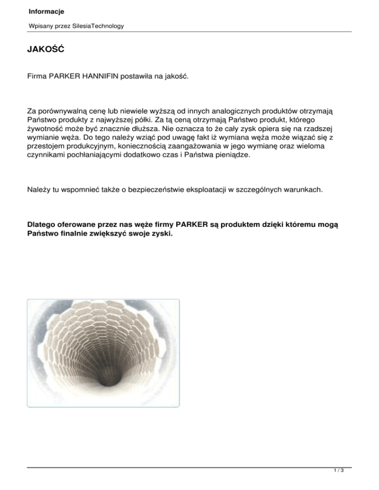 Informacje Wpisany przez SilesiaTechnology JAKOŚĆ Firma PARKER HANNIFIN postawiła na jakość. Za porównywalną cenę lub niewiele wyższą od innych analogicznych produktów otrzymają Państwo produkty z najwyższej półki. Za tą ceną otrzymają Państwo produkt, którego żywotność może być znacznie dłuższa. Nie oznacza to że cały zysk opiera się na rzadszej wymianie węża. Do tego należy wziąć pod uwagę fakt iż wymiana węża może wiązać się z przestojem produkcyjnym, koniecznością zaangażowania w jego wymianę oraz wieloma czynnikami pochłaniającymi dodatkowo czas i Państwa pieniądze. Należy tu wspomnieć także o bezpieczeństwie eksploatacji w szczególnych warunkach. Dlatego oferowane przez nas węże firmy PARKER są produktem dzięki któremu mogą Państwo finalnie zwiększyć swoje zyski. 1/3 Informacje Wpisany przez SilesiaTechnology WŁASNE LOGO Firma PARKER HANNIFIN jako jeden z niewielu dostawców węży umożliwia Państwu nadrukowanie własnego logo lub nazwy firmy na zamówionym produkcie. Rozwiązanie to szczególnie przydatne jest dla producentów urządzeń, w których taki wąż jest jednym z elementów całości rozwiązania. Nadruk powoduje iż zazwyczaj iż użytkownik końcowy takiego urządzenia w razie potrzeby szuka tego elementu u producenta urządzenia, a nie wśród innych proponowanych na rynku węży. Jednocześnie jest to dobre rozwiązanie reklamowe, podnoszące prestiż producenta. Zachęcamy do rozważenia tej propozycji. W razie pytań prosimy o kontakt. DORADZTWO TECHNICZNE Firma nasza służy Państwu pełnym doradztwem techniczym w zakresie złącz i węży przemysłowych. Jako dystrybutor firmy PARKER jesteśmy także wspierani wiedzą tej firmy. Mamy pełen dostęp do informacji technologicznej, dzięki której możemy zaoferować najbardziej optymalne rozwiązania. Pozwoli na zooptymalizowanie Państwa kosztów, poprzez zwiększenie wytrzymałoścł stosowanych elementów, co jednocześnie przełoży się na rzadsze przestoje związane z koniecznocią wymiany tych elementów, a w konsekwencji zmniejszy ilość przestojów w produkcji. 2/3 Informacje Wpisany przez SilesiaTechnology KRÓTKIE TERMINY REALIZACJI Dzięki rozbudowanej sieci dystrybucyjnej firmy PARKER możliwe jest zapewnienie krótkich terminów realizacji zamówień. Dla stałych klientów istnieje możliwość tworzenia zapasów magazynowych. 3/3