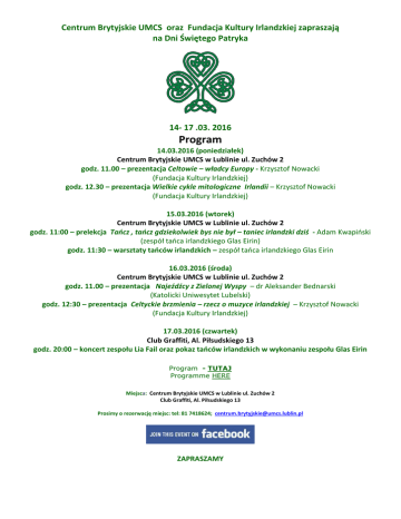 Centrum Brytyjskie UMCS oraz Fundacja Kultury Irlandzkiej zapraszają na Dni Świętego Patryka 14- 17 .03. 2016 Program 14.03.2016 (poniedziałek) Centrum Brytyjskie UMCS w Lublinie ul. Zuchów 2 godz. 11.00 – prezentacja Celtowie – władcy Europy - Krzysztof Nowacki (Fundacja Kultury Irlandzkiej) godz. 12.30 – prezentacja Wielkie cykle mitologiczne Irlandii – Krzysztof Nowacki (Fundacja Kultury Irlandzkiej) 15.03.2016 (wtorek) Centrum Brytyjskie UMCS w Lublinie ul. Zuchów 2 godz. 11:00 – prelekcja Tańcz , tańcz gdziekolwiek bys nie był – taniec irlandzki dziś - Adam Kwapiński (zespół tańca irlandzkiego Glas Eirin) godz. 11:30 – warsztaty tańców irlandzkich – zespół tańca irlandzkiego Glas Eirin 16.03.2016 (środa) Centrum Brytyjskie UMCS w Lublinie ul. Zuchów 2 godz. 11.00 – prezentacja Najeźdźcy z Zielonej Wyspy – dr Aleksander Bednarski (Katolicki Uniwesytet Lubelski) godz. 12:30 – prezentacja Celtyckie brzmienia – rzecz o muzyce irlandzkiej – Krzysztof Nowacki (Fundacja Kultury Irlandzkiej) 17.03.2016 (czwartek) Club Graffiti, Al. Piłsudskiego 13 godz. 20:00 – koncert zespołu Lia Fail oraz pokaz tańców irlandzkich w wykonaniu zespołu Glas Eirin Program - TUTAJ Programme HERE Miejsca: Centrum Brytyjskie UMCS w Lublinie ul. Zuchów 2 Club Graffiti, Al. Piłsudskiego 13 Prosimy o rezerwację miejsc: tel: 81 7418624; [email protected] ZAPRASZAMY