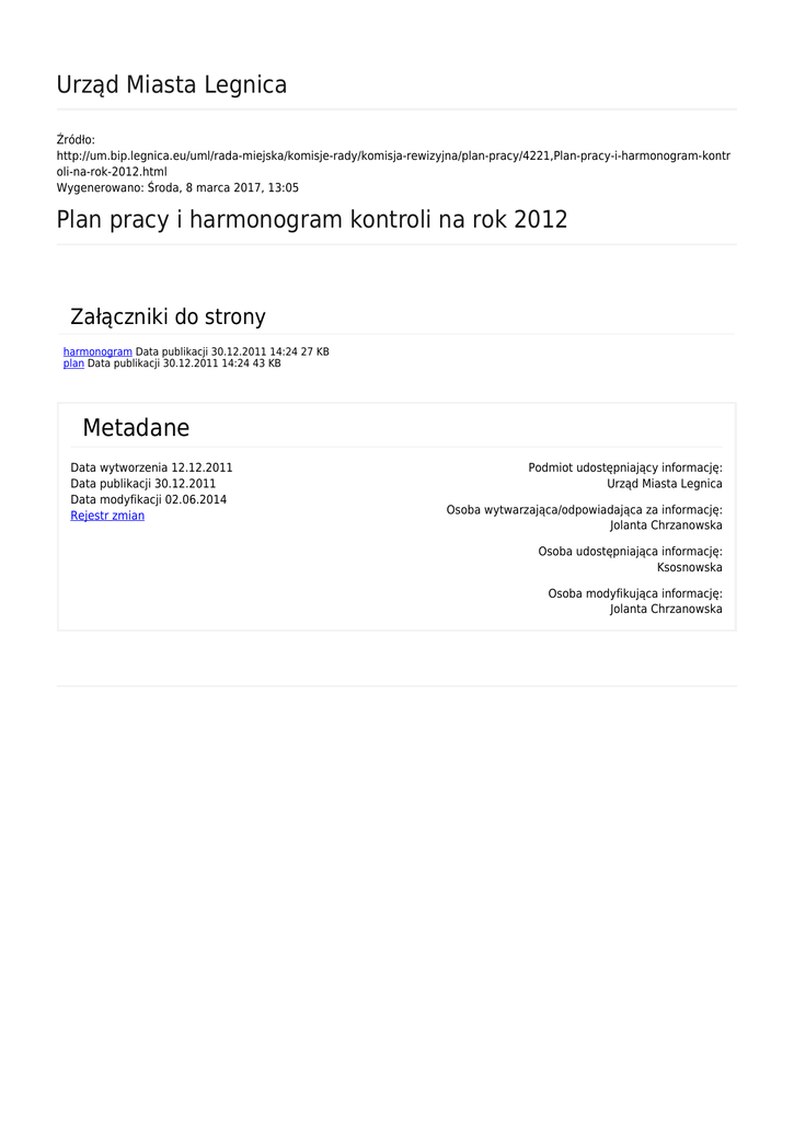 Urząd Miasta Legnica Źródło: http://um.bip.legnica.eu/uml/rada-miejska/komisje-rady/komisja-rewizyjna/plan-pracy/4221,Plan-pracy-i-harmonogram-kontr oli-na-rok-2012.html Wygenerowano: Środa, 8 marca 2017, 13:05 Plan pracy i harmonogram kontroli na rok 2012 Załączniki do strony harmonogram Data publikacji 30.12.2011 14:24 27 KB plan Data publikacji 30.12.2011 14:24 43 KB Metadane Data wytworzenia 12.12.2011 Data publikacji 30.12.2011 Data modyfikacji 02.06.2014 Rejestr zmian Podmiot udostępniający informację: Urząd Miasta Legnica Osoba wytwarzająca/odpowiadająca za informację: Jolanta Chrzanowska Osoba udostępniająca informację: Ksosnowska Osoba modyfikująca informację: Jolanta Chrzanowska