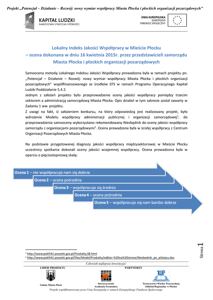 Projekt ,,Potencjał – Działanie – Rozwój: nowy wymiar współpracy Miasta Płocka i płockich organizacji pozarządowych” Lokalny Indeks Jakości Współpracy w Mieście Płocku – ocena dokonana w dniu 16 kwietnia 2015r. przez przedstawicieli samorządu Miasta Płocka i płockich organizacji pozarządowych Samoocena metodą Lokalnego Indeksu Jakości Współpracy prowadzona była w ramach projektu pn. ,,Potencjał – Działanie – Rozwój: nowy wymiar współpracy Miasta Płocka i płockich organizacji pozarządowych” współfinansowanego ze środków EFS w ramach Programu Operacyjnego Kapitał Ludzki Poddziałanie 5.4.2. Jednym z założeń projektu było przeprowadzenie oceny jakości współpracy pomiędzy trzecim sektorem a administracją samorządową Miasta Płocka. Opis działań w tym zakresie został zawarty w Zadaniu 1 ww. projektu. Z uwagi na fakt, iż założeniem konkursu, na który odpowiedzią jest realizowany projekt, było wdrożenie Modelu współpracy administracji publicznej i organizacji samorządowej1, do przeprowadzenia samooceny wykorzystano rekomendowany Niezbędnik do oceny jakości współpracy samorządu z organizacjami pozarządowymi2. Ocena prowadzona była w ścisłej współpracy z Centrum Organizacji Pozarządowych Miasta Płocka. 1 2 http://www.pokl541.pozytek.gov.pl/Produkty,38.html http://www.pokl541.pozytek.gov.pl/files/Model/Produkty/odbior-%20na%20strone/Niezbednik_po_pilotazu.doc Człowiek najlepsza inwestycja! LIDER PROJEKTU Gmina Miasto Płock PARTNERZY Stowarzyszenie Academia Economica Towarzystwo Wiedzy Powszechnej Oddział Regionalny w Płocku Projekt współfinansowany przez Unię Europejską w ramach Europejskiego Funduszu Społecznego Strona 1 Na podstawie przygotowanej diagnozy jakości współpracy międzysektorowej w Mieście Płocku uczestnicy spotkania dokonali oceny jakości wzajemnej współpracy. Ocena prowadzona była w oparciu o pięciostopniową skalę: Projekt ,,Potencjał – Działanie – Rozwój: nowy wymiar współpracy Miasta Płocka i płockich organizacji pozarządowych” Ocena Obszar Wyniki oceny dokonanej przez uczestników spotkania Tworzenie polityk publicznych Realizacja zadań publicznych Rozwijanie infrastruktury współpracy 4 5 5 Samorząd regularnie prowadzi konkursy dla organizacji pozarządowych, zleca też zadania publiczne w inny sposób. Co więcej, organizacje realizują zadania w bardzo różnych obszarach. W co najmniej kilku z nich istnieje stabilna współpraca, zawiązywane są formalne partnerstwa w różnych sprawach. Organizacje współuczestniczą w ocenie realizacji zadań publicznych Samorząd inwestuje w rozwój organizacji na swoim terenie. Organizuje dla nich szkolenia, udziela wsparcia merytorycznego (np. porad prawnych), pomaga w organizacji konferencji, przedstawiciele administracji uczestniczą w spotkaniach środowisk pozarządowych. Organizacje mogą liczyć na pomoc, gdy chcą rozszerzyć swoją działalność, współpracować z innymi samorządami. Intensywnie działa lokalna rada pożytku publicznego/zespoły/fora konsultacyjne itp. Interpretacja Ocena oznacza, że uczestnikom trudno było zgodzić co do 3-ki lub 5-ki Ocena 3 - Czasem współpracujemy ze sobą, ale nieregularnie. Nie wszystkie polityki (w tym dokumenty, prawo lokalne itp.) podlegają konsultacjom. Programy współpracy, choć istnieją, to nie satysfakcjonują jednej ze stron, są sztampowe – nie do końca odzwierciedlają lokalne potrzeby, nie zawsze przekładają się na realia. Ocena 4 - Wspólnie tworzymy wszystkie ważne polityki i dokumenty, konsultujemy je, wymieniamy się informacjami. Programy współpracy odzwierciedlają prawdziwe relacje między nami i gwarantują ich poprawność. Strona 2 Średnia ocena jakości współpracy wyniosła 4,7. Człowiek najlepsza inwestycja! LIDER PROJEKTU Gmina Miasto Płock PARTNERZY Stowarzyszenie Academia Economica Towarzystwo Wiedzy Powszechnej Oddział Regionalny w Płocku Projekt współfinansowany przez Unię Europejską w ramach Europejskiego Funduszu Społecznego Projekt ,,Potencjał – Działanie – Rozwój: nowy wymiar współpracy Miasta Płocka i płockich organizacji pozarządowych” Międzysektorowa dyskusja nt. oceny współpracy była dokonywana w kontekście jej trzech najważniejszych aspektów (płaszczyzn) i właściwych dla nich obszarów. Skutkowała zdefiniowaniem następujących wniosków: I. Współpraca organizacji jednostek samorządu terytorialnego i organizacji pozarządowych w zakresie tworzenia polityk publicznych 1. W Mieście Płocku diagnozowanie problemów lokalnych odbywa się każdorazowo przy opracowywaniu dokumentów planistycznych. Nie ma jednak ustalonych zasad uczestnictwa organizacji pozarządowych w procesie diagnozy. Przedstawiciele organizacji pozarządowych zgłosiły potrzebę uczestnictwa w sporządzaniu diagnoz, które wprowadza się do podstawowych dokumentów planistycznych. 2. W zakresie wymiany informacji o obszarach działania organizacji pozarządowych oraz podejmowanych inicjatywach nie ma ustalonej procedury wzajemnego informowania się – brak jednolitego systemu wymiany informacji branżowych, zgłoszono potrzebę utworzenia „mapy aktywności” jako narzędzia wymiany informacji a także poznania zalet praktycznego wykorzystania tego narzędzia. 3. W Mieście Płocku funkcjonuje przyjęty uchwałą Rady Miasta tryb konsultowania z organizacjami pozarządowymi projektów aktów prawa miejscowego w dziedzinach dotyczących działalności statutowej tych organizacji. Ponadto organizacje pozarządowe włączane są w prace nad projektami podstawowych dokumentów planistycznych poprzez pracę zespołów tematycznych. Nie ma jednak ujednoliconej procedury tworzenia dokumentów planistycznych, w tym uwzględniających rolę i miejsce NGO w procesach programowania. W mieście brak jest jednolitej procedury tworzenia dokumentów planistycznych, co przekłada się na brak zasad udziału organizac
