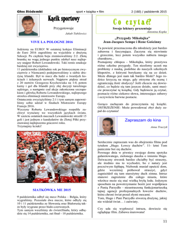 Głos Siódemki sport • książka • film 2 (160) / październik 2015 _______________________________________________________________________________________________________________________________________________________________________________________________________________________________________________________________________________________________________________________________________________________________________________________ Kącik sportowy Przygotowuje Jakub Tubilewicz VIVE LA POLOGNE 2016 Jedziemy na EURO! W ostatniej kolejce Eliminacji do Euro 2016 zagraliśmy na wyjeździe z drużyną Szkocji. Po ciężkim boju zremisowaliśmy 2:2. Złotą bramkę na wagę jednego punktu zdobył nasz najlepszy snajper Robert Lewandowski. Taki remis smakuje bardziej niż zwycięstwo. 11 października (dokładnie rok po historycznym zwycięstwie z Niemcami) podejmowaliśmy u siebie drużynę Irlandii. Był to mecz dla ludzi o twardych kościach i żelaznych nerwach. Najpierw piękny strzał z 20 metrów Grzegorza Krychowiaka na 1:0, potem karny i gol dla Irlandii przy złej decyzji tureckiego sędziego, a następnie cud akcja zakończona szczupakiem i główką Roberta Lewandowskiego, najlepszego strzelca eliminacji mistrzostw Europy. Ostatecznie zwyciężyliśmy 2:1 i tym samym zapewniliśmy sobie udział w finałach Mistrzostw Europy Francja 2016. Wyczyny Roberta Lewandowskiego rozpaliły zachwyt wyrażany we wszystkich językach świata. W sześciu ostatnich meczach Lewandowski strzelił 15 goli i jest jednym z kandydatów do Złotej Piłki przyznawanej najlepszemu graczowi roku. Trzymajmy kciuki! SIATKÓWKA ME 2015 9 października odbył się mecz Polska – Belgia, który wygraliśmy. Pozostałe dwa mecze, które odbyły się 10 i 11 października ze Słowenią oraz Białorusią także były wygrane przez biało-czerwonych. Tym samym weszliśmy do ćwierćfinału, który odbędzie się 14 października, zaś finał - 18 października. C o c z y t a ć? Swoje lektury prezentuje Antonina Kopka „Przygody Mikołajka” Jean-Jacques Sempe i Rene Gościnny Ta powieść przeznaczona dla młodzieży jest bardzo zabawna i fascynująca. Zaczyna się niewinnie i grzecznie, lecz potem wszystko nabiera innego charakteru... Poznajemy chłopca - Mikołajka, który przeżywa różne szkolne przygody. Ten niesforny uczeń ma problemy z nauką, podobne do naszych szkolnych kłopotów, z którymi borykamy się na co dzień. Może dlatego jest nam tak bardzo bliski? Jego rodzice krzyczą na niego, gdy otrzyma zła ocenę i ograniczają ilość słodyczy! Jeśli chcecie się dowiedzieć, co będzie się tam jeszcze działo, sami musicie przeczytać tę książkę. Gdy będziecie ją czytać, poznacie różne ciekawe słowa, interesujące zabawy i oczywiście barwne postacie. Gorąco zachęcam do przeczytania tej książki. OSTRZEŻENIE: Może powodować zbyt duży zapał do czytania! Zapraszam do kina Anna Traczyk Serdecznie zapraszam was do obejrzenia filmu pod tytułem „Hugo. Łowcy duchów”. 11- letni Tom panicznie boi się duchów. Pewnego dnia w piwnicy swojego domu spotyka galaretowatego, zielonego duszka o imieniu Hugo. Dziwaczny stworek bardzo chciałby być straszny, ale średnio mu to wychodzi, bo z natury jest poczciwym fajtłapą. Nieborak musiał opuścić dom, gdzie wcześniej próbował straszyć, gdyż zagnieździł się tam starożytny duch zimna. Intruz stanowi zagrożenie dla całego miasta, które wkrótce może się stać wielką bryłą lodu. Jedynym sposobem na powstrzymanie bestii jest współpraca z Panią Parzydło - nieustraszoną funkcjonariuszką tajnej agencji profesjonalnych łowców duchów, która chroni świat przed złymi mocami. Tom, Hugo i Pani Parzydło stworzą drużynę, jakiej nie widział świat… i zaświaty. Czy uda się wypłoszyć intruza, dowiecie się oglądając film. Zabawa murowana! __________________________________________________________________________________________________________________________________________________________________________________________________________________________________________________________________________________________________________________________________________________________________________________________________________________________________________________________________________ 11
