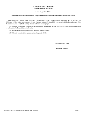 UCHWAŁA NR XXII/147/2012 RADY GMINY RĘCZNO z dnia 28 grudnia 2012 r. w sprawie uchwalenia Gminnego Programu Przeciwdziałania Narkomanii na lata 2013-2015 Na podstawie art. 18 ust. 2 pkt. 15 stawy z dnia 8 marca 1990 r. o samorządzie gminnym (Dz. U. z 2001r. Nr 142, poz. 1591 z póżn. zm.) oraz art. 10 ust. 3 ustawy z dnia 29 lipca 2005 r. o przeciwdziałaniu narkomanii (Dz. U. z 2012 r., poz. 124) Rada Gminy Ręczno uchwala co następuje: § 1. Uchwala się Gminny Program Przeciwdziałania Narkomanii na lata 2013-2015 w brzmieniu określonym w załączniku Nr 1 do niniejszej uchwały. § 2. Wykonanie uchwały powierza się Wójtowi Gminy Ręczno. § 3. Uchwała w wchodzi w życie z dniem 1 stycznia 2013r. Przewodniczący Rady Mirosław Zawada Id: DAB3FAE9-1CF7-4FEB-9ED9-DE3FA64FCD06. Podpisany Strona 1 Załącznik Nr 1 do Uchwały Nr XXII/147/2012 Rady Gminy Ręczno z dnia 28 grudnia 2012 r. Gminny Program Przeciwdziałania Narkomanii w Gminie Ręczno na lata 2013-2015 . § 1. Wstęp. Narkotyki – to potoczne określenie niektórych substancji psychotropowych. Ze względu na potoczność tego słowa, różnice kulturowe, poglądy poszczególnych osób, stan prawny itp. nie ma jednoznacznej definicji, ale zwykle obejmuje ona wszystkie substancje psychotropowe, które aktualnie są nielegalne. Narkomania – oznacza nadużywanie środków psychoaktywnych, potocznie –narkotyków. Są to substancje naturalne lub syntetyczne, które wprowadzone w określonej dawce do organizmu ludzkiego, oddziałują na ośrodkowy układ nerwowy, powodując między innymi zmiany świadomości, percepcji, nastroju. Narkomania od lat stanowi problem o zasięgu globalnym. Ogranicza rozwój gospodarczy krajów biednych, angażuje nieproporcjonalnie duże nakłady finansowe związane z przeciwdziałaniem narkomanii w krajach najbogatszych. Niesie za sobą poważne ryzyko dla zdrowia publicznego, szczególnie w kontekście chorób zakaźnych tj. HIV, zakażenia wirusem żółtaczki typu B i C, infekcji przenoszonych drogą płciową, gruźlicy. Konsumenci narkotyków (uzależnieni, użytkownicy problemowi i eksperymentujący) charakteryzują się wysokim ryzykiem zgonu, nieadekwatnym niejednokrotnie do ich wieku. Narkomania wiąże się z problemami społecznymi takimi jak: ubóstwo, bezrobocie, prostytucja, przemoc, przestępczość, bezdomność oraz inne uzależnienia (hazard, alkoholizm). Narkomania jest obecnie jednym z najpoważniejszych problemów społecznych w Polsce. Nastąpił wzrost podaży i popytu na narkotyki. Główną rolę odegrały czynniki związane z wielką zmianą społeczną, na którą polityka wobec narkomanii miała wielki wpływ. Podaż rosła wraz z rozwojem międzynarodowej wymiany handlowej, rosnącym ruchem turystycznym, otwarciem granic, postępującą wymienialnością złotego i rozwojem przestępczości zorganizowanej. Na popyt wpływ miała również intensywna transmisja wzorów kulturowych, zwłaszcza wśród ludzi młodych. Dla odwrócenia obecnego trendu potrzebna jest mobilizacja całego społeczeństwa, oparta na pełnym konsensusie co do celu, jaki chcemy osiągnąć. Ustawa z dnia 29 lipca 2005 roku o przeciwdziałaniu narkomanii umożliwia realizację działań profilaktycznych, jak i zaradczych na szczeblu gminnym. Ustawodawca wskazał zarówno zadania, jakie mają być realizowane, formę prawną w postaci gminnego programu przeciwdziałania narkomanii, jak i środki na realizację tych zadań. Źródłem finansowania są środki finansowe budżetu gminy pochodzące z opłat za korzystanie z zezwoleń na sprzedaż i podawanie napojów alkoholowych. Program Przeciwdziałania Narkomanii Gminy Ręczno stanowi spis działań będących jednocześnie zadaniami własnymi gminy w obszarze tych zagadnień społecznych, które realizowane będą w latach 2013-2015. Założenia ww. programu są zgodne z założeniami Krajowego Programu Przeciwdziałania Narkomanii. § 2. Cele Programu. Celem Gminnego Programu Przeciwdziałania Narkomanii jest tworzenie i realizacja lokalnych zasad polityki społecznej poprzez: a) podejmowanie działań zmierzających do ograniczenia zażywania narkotyków oraz usuwania następstw ich nadużywania, b) podniesienia poziomu wiedzy społeczeństwa na temat problemów związanych z używaniem środków psychoaktywnych i możliwości zapobiegania zjawisku, c) rozpowszechnianie zdrowego stylu życia wśród dzieci i młodzieży, d) wzrost zaangażowania społeczności lokalnych w działania profilaktyczne poprzez wspieranie lokalnych inicjatyw działań profilaktycznych na terenie szkół, organizacji pozarządowych. § 3. Zadania programu: 1) Zwiększenie dostępności pomocy terapeutycznej i rehabilitacyjnej dla osób uzależnionych oraz zagrożonych uzależnieniem poprzez: a) prowadzenie Punktu Konsultacyjnego, w ramach którego udziela się członkom rodzin, w których występują problemy narkomanii pomocy psychospołecznej i prawnej, b) stworzenie osobom uzależnionym i zagrożonym uzależnieniem narkomanii możliwości korzystania z porad psychologicznych, Id: DAB3FAE9-1CF7-4FEB-9ED9-DE3FA64FCD06. Podpisany Strona 1 c) współpracę z placówkami leczenia i terapii uzależnień w zakresie pozyskiwania informacji dotyczącej uzyskiwania pomocy terapeutycznej. 2) Udzielanie rodzinom, w których występuje problemy narkomanii pomocy psychospołecznej i prawnej poprzez: a) współpracę pomiędzy instytucjami i organizacjami zajmującymi się pomocą socjalną, medyczną, prawną i psychologiczną. 3) Prowadzenie profilaktycznej działalności informacyjnej, edukacyjnej oraz szkoleniowej w zakresie rozwiązywania problemów narkomanii, w szczególności skierowanej do dzieci i młodzieży poprzez: a) realizację programów profilaktycznych, warsztatów profilaktycznych w szkołach na terenie gminy, b) zakup literatury i materiałów edukacyjnych (ulotki, broszury, plakaty, płyty DVD) dotyczących zagrożeń związanych z narkomanią oraz r