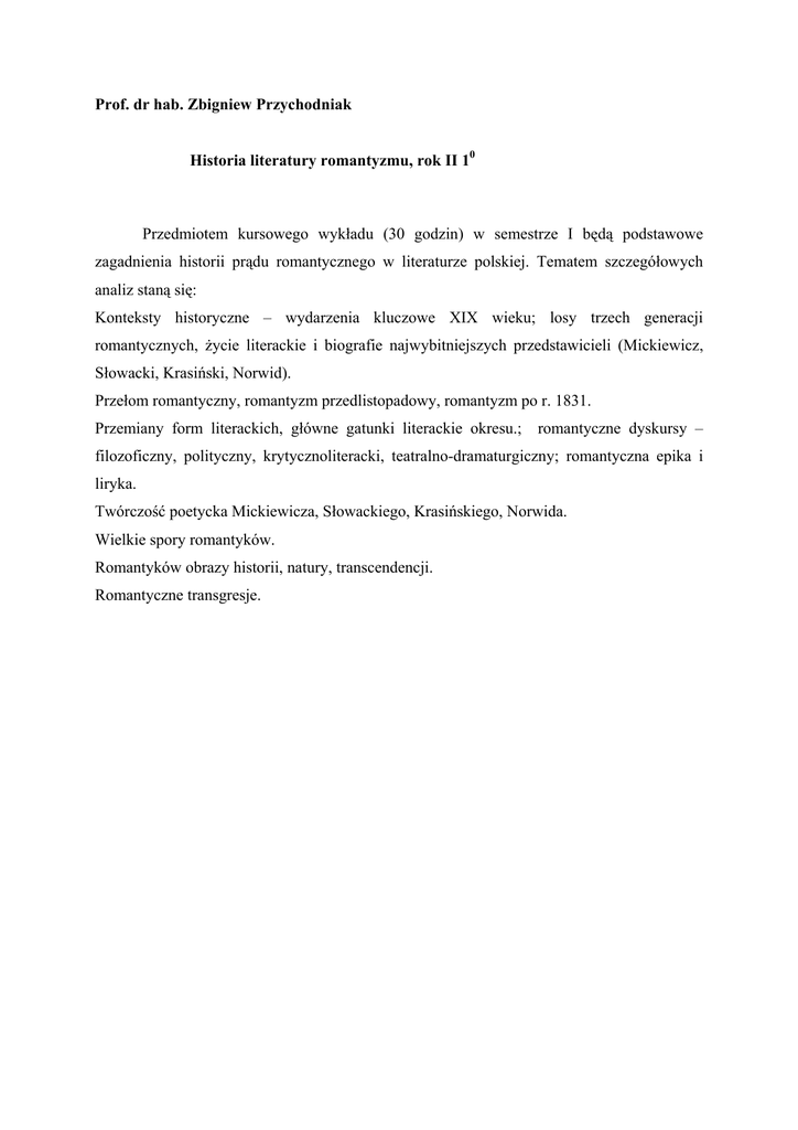Prof. dr hab. Zbigniew Przychodniak Historia literatury romantyzmu, rok II 10 Przedmiotem kursowego wykładu (30 godzin) w semestrze I będą podstawowe zagadnienia historii prądu romantycznego w literaturze polskiej. Tematem szczegółowych analiz staną się: Konteksty historyczne – wydarzenia kluczowe XIX wieku; losy trzech generacji romantycznych, życie literackie i biografie najwybitniejszych przedstawicieli (Mickiewicz, Słowacki, Krasiński, Norwid). Przełom romantyczny, romantyzm przedlistopadowy, romantyzm po r. 1831. Przemiany form literackich, główne gatunki literackie okresu.; romantyczne dyskursy – filozoficzny, polityczny, krytycznoliteracki, teatralno-dramaturgiczny; romantyczna epika i liryka. Twórczość poetycka Mickiewicza, Słowackiego, Krasińskiego, Norwida. Wielkie spory romantyków. Romantyków obrazy historii, natury, transcendencji. Romantyczne transgresje. Tematy wykładów „Historia literatury romantyzmu”. Rok akad. 2011/2012, semestr zimowy 1. Co to jest romantyzm? Termin, pojęcie historyczne, typologiczne 2. Romantyczny światopogląd. Filozofia(e) romantyzmu 3. Romantyczna poezja i symbolizm romantyczny 4. Historia romantyzmu – romantyzm historii. 5. Od melodramatu do mesjanizmu. Cz. I. Klasycy wobec niewoli. 6. Od melodramatu do mesjanizmu. Cz. II. Mesjanizm romantyczny: idea i praktyka. Doktryna i utopia. Mickiewicz,, Słowacki, Krasiński 7. Dyskurs krytyczny klasyków i romantyków 8. Maurycy Mochnacki – krytyk programowy, publicysta i polityk 9. Romantyczny dramat i teatr 10. Liryczne przestrzenie romantyków. Cz. I. Mickiewicz i inni 11. Liryczne przestrzenie romantyków. Cz. II. Słowacki 12-13. Mapa polskiej prozy 1 poł. XIX wieku