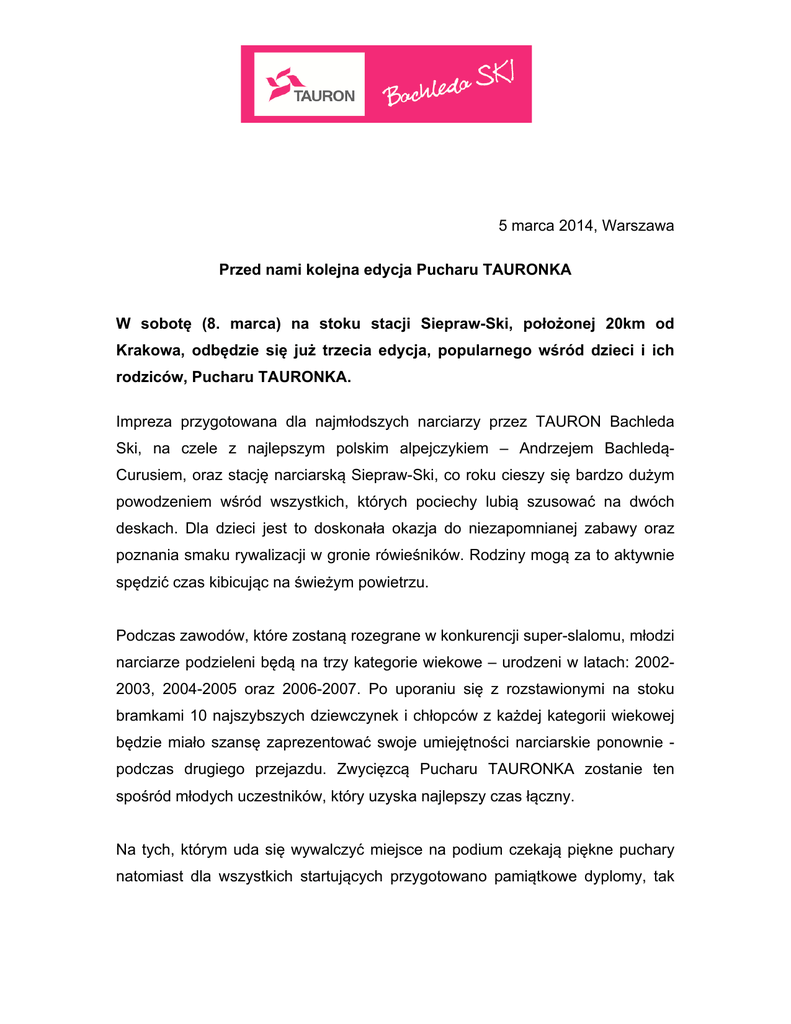 orga 5 marca 2014, Warszawa Przed nami kolejna edycja Pucharu TAURONKA W sobotę (8. marca) na stoku stacji Siepraw-Ski, położonej 20km od Krakowa, odbędzie się już trzecia edycja, popularnego wśród dzieci i ich rodziców, Pucharu TAURONKA. Impreza przygotowana dla najmłodszych narciarzy przez TAURON Bachleda Ski, na czele z najlepszym polskim alpejczykiem – Andrzejem BachledąCurusiem, oraz stację narciarską Siepraw-Ski, co roku cieszy się bardzo dużym powodzeniem wśród wszystkich, których pociechy lubią szusować na dwóch deskach. Dla dzieci jest to doskonała okazja do niezapomnianej zabawy oraz poznania smaku rywalizacji w gronie rówieśników. Rodziny mogą za to aktywnie spędzić czas kibicując na świeżym powietrzu. Podczas zawodów, które zostaną rozegrane w konkurencji super-slalomu, młodzi narciarze podzieleni będą na trzy kategorie wiekowe – urodzeni w latach: 20022003, 2004-2005 oraz 2006-2007. Po uporaniu się z rozstawionymi na stoku bramkami 10 najszybszych dziewczynek i chłopców z każdej kategorii wiekowej będzie miało szansę zaprezentować swoje umiejętności narciarskie ponownie podczas drugiego przejazdu. Zwycięzcą Pucharu TAURONKA zostanie ten spośród młodych uczestników, który uzyska najlepszy czas łączny. Na tych, którym uda się wywalczyć miejsce na podium czekają piękne puchary natomiast dla wszystkich startujących przygotowano pamiątkowe dyplomy, tak aby każdy mały narciarz czuł się wyróżniony i zawsze pełen radości wracał na stok. Udział w zawodach jest bezpłatny, we własnym zakresie należy zakupić jedynie karnet na wyciąg. Organizatorzy przypominają także, że wszyscy uczestnicy muszą posiadać kaski narciarskie. Impreza startuje o godzinie 10:00. Zgłoszenia można przesyłać drogą mailową na adres: [email protected] oraz telefonicznie pod numerem 12 274 64 91 wew. 13 (szkoła narciarska). Andrzej Lesiewski [email protected] +48 512 348 232 TAURON Polska Energia SA jest spółką holdingową w grupie kapitałowej, która zajmuje się wydobyciem węgla, wytwarzaniem, dystrybucją i sprzedażą energii. Grupa TAURON wraz z GZE obejmuje swoim działaniem 18 proc. powierzchni kraju i jest jednym z największych podmiotów gospodarczych w Polsce, posiadającym 5,2 mln klientów. W skład Grupy TAURON wchodzą m.in. TAURON Wytwarzanie, TAURON Dystrybucja, TAURON Sprzedaż, TAURON Obsługa Klienta, Południowy Koncern Węglowy, TAURON Ciepło, TAURON Ekoenergia oraz spółki należące do GZE. Andrzej Bachleda-Curuś II – (ur. 2 stycznia 1947 roku w Zakopanem) to najbardziej utytułowany polski narciarz alpejski. Dwukrotnie reprezentował Polskę na Igrzyskach Olimpijskich – w 1968 roku w Grenoble, gdzie zdobył 6. lokatę w slalomie specjalnym oraz w Sapporo w roku 1972, plasując się na 9. pozycji w slalomie gigancie. W jego kolekcji znajdują się też medale Narciarskich Mistrzostw Świata - brąz za kombinację alpejską w Val Gardena w 1970 roku oraz srebro zdobyte w 1974 w St. Moritz w tej samej konkurencji. Wybitnym wynikiem było też 2. miejsce w slalomowej klasyfikacji Pucharu Świata i 6. miejsce w klasyfikacji generalnej w sezonie 1971/1972. Andrzej Bachleda-Curuś wielokrotnie tryumfował też na Zimowych Uniwersjadach i Spartakiadach Armii Zaprzyjaźnionych. Na najwyższym podium Mistrzostw Polski stawał aż 14 razy. W trakcie swojej kariery ścigał się z największymi legendami narciarstwa alpejskiego, takimi jak Jean Claude Killy czy Gustavo Thöni. Jest pierwszym Polakiem uhonorowanym prestiżową nagrodą „Fair Play” przyznawaną przez UNESCO. W 2009 roku otrzymał Krzyż Kawalerski Orderu Odrodzenia Polski.
