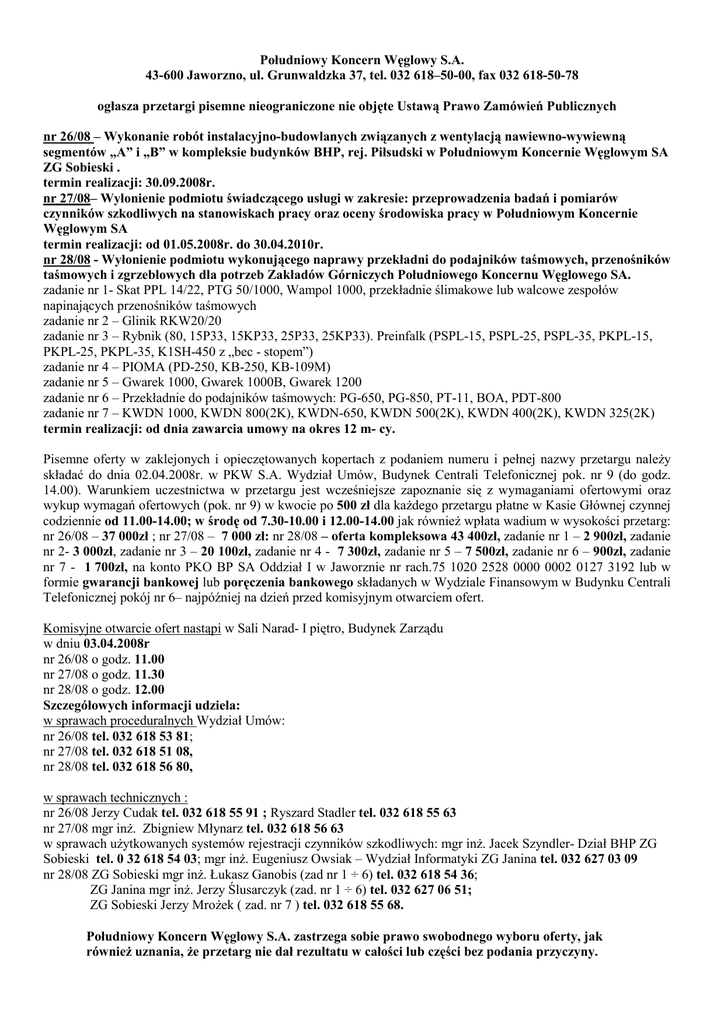 Południowy Koncern Węglowy S.A. 43-600 Jaworzno, ul. Grunwaldzka 37, tel. 032 618–50-00, fax 032 618-50-78 ogłasza przetargi pisemne nieograniczone nie objęte Ustawą Prawo Zamówień Publicznych nr 26/08 – Wykonanie robót instalacyjno-budowlanych związanych z wentylacją nawiewno-wywiewną segmentów „A” i „B” w kompleksie budynków BHP, rej. Piłsudski w Południowym Koncernie Węglowym SA ZG Sobieski . termin realizacji: 30.09.2008r. nr 27/08– Wyłonienie podmiotu świadczącego usługi w zakresie: przeprowadzenia badań i pomiarów czynników szkodliwych na stanowiskach pracy oraz oceny środowiska pracy w Południowym Koncernie Węglowym SA termin realizacji: od 01.05.2008r. do 30.04.2010r. nr 28/08 - Wyłonienie podmiotu wykonującego naprawy przekładni do podajników taśmowych, przenośników taśmowych i zgrzebłowych dla potrzeb Zakładów Górniczych Południowego Koncernu Węglowego SA. zadanie nr 1- Skat PPL 14/22, PTG 50/1000, Wampol 1000, przekładnie ślimakowe lub walcowe zespołów napinających przenośników taśmowych zadanie nr 2 – Glinik RKW20/20 zadanie nr 3 – Rybnik (80, 15P33, 15KP33, 25P33, 25KP33). Preinfalk (PSPL-15, PSPL-25, PSPL-35, PKPL-15, PKPL-25, PKPL-35, K1SH-450 z „bec - stopem”) zadanie nr 4 – PIOMA (PD-250, KB-250, KB-109M) zadanie nr 5 – Gwarek 1000, Gwarek 1000B, Gwarek 1200 zadanie nr 6 – Przekładnie do podajników taśmowych: PG-650, PG-850, PT-11, BOA, PDT-800 zadanie nr 7 – KWDN 1000, KWDN 800(2K), KWDN-650, KWDN 500(2K), KWDN 400(2K), KWDN 325(2K) termin realizacji: od dnia zawarcia umowy na okres 12 m- cy. Pisemne oferty w zaklejonych i opieczętowanych kopertach z podaniem numeru i pełnej nazwy przetargu naleŜy składać do dnia 02.04.2008r. w PKW S.A. Wydział Umów, Budynek Centrali Telefonicznej pok. nr 9 (do godz. 14.00). Warunkiem uczestnictwa w przetargu jest wcześniejsze zapoznanie się z wymaganiami ofertowymi oraz wykup wymagań ofertowych (pok. nr 9) w kwocie po 500 zł dla kaŜdego przetargu płatne w Kasie Głównej czynnej codziennie od 11.00-14.00; w środę od 7.30-10.00 i 12.00-14.00 jak równieŜ wpłata wadium w wysokości przetarg: nr 26/08 – 37 000zł ; nr 27/08 – 7 000 zł: nr 28/08 – oferta kompleksowa 43 400zł, zadanie nr 1 – 2 900zł, zadanie nr 2- 3 000zł, zadanie nr 3 – 20 100zł, zadanie nr 4 - 7 300zł, zadanie nr 5 – 7 500zł, zadanie nr 6 – 900zł, zadanie nr 7 - 1 700zł, na konto PKO BP SA Oddział I w Jaworznie nr rach.75 1020 2528 0000 0002 0127 3192 lub w formie gwarancji bankowej lub poręczenia bankowego składanych w Wydziale Finansowym w Budynku Centrali Telefonicznej pokój nr 6– najpóźniej na dzień przed komisyjnym otwarciem ofert. Komisyjne otwarcie ofert nastąpi w Sali Narad- I piętro, Budynek Zarządu w dniu 03.04.2008r nr 26/08 o godz. 11.00 nr 27/08 o godz. 11.30 nr 28/08 o godz. 12.00 Szczegółowych informacji udziela: w sprawach proceduralnych Wydział Umów: nr 26/08 tel. 032 618 53 81; nr 27/08 tel. 032 618 51 08, nr 28/08 tel. 032 618 56 80, w sprawach technicznych : nr 26/08 Jerzy Cudak tel. 032 618 55 91 ; Ryszard Stadler tel. 032 618 55 63 nr 27/08 mgr inŜ. Zbigniew Młynarz tel. 032 618 56 63 w sprawach uŜytkowanych systemów rejestracji czynników szkodliwych: mgr inŜ. Jacek Szyndler- Dział BHP ZG Sobieski tel. 0 32 618 54 03; mgr inŜ. Eugeniusz Owsiak – Wydział Informatyki ZG Janina tel. 032 627 03 09 nr 28/08 ZG Sobieski mgr inŜ. Łukasz Ganobis (zad nr 1 ÷ 6) tel. 032 618 54 36; ZG Janina mgr inŜ. Jerzy Ślusarczyk (zad. nr 1 ÷ 6) tel. 032 627 06 51; ZG Sobieski Jerzy MroŜek ( zad. nr 7 ) tel. 032 618 55 68. Południowy Koncern Węglowy S.A. zastrzega sobie prawo swobodnego wyboru oferty, jak równieŜ uznania, Ŝe przetarg nie dał rezultatu w całości lub części bez podania przyczyny.