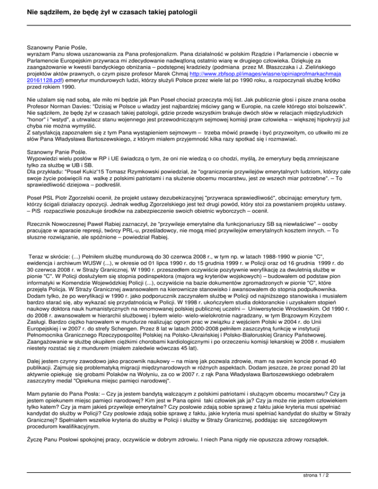 Nie sądziłem, że będę żył w czasach takiej patologii Szanowny Panie Pośle, wyrażam Panu słowa uszanowania za Pana profesjonalizm. Pana działalność w polskim Rządzie i Parlamencie i obecnie w Parlamencie Europejskim przywraca mi zdecydowanie nadwątloną ostatnio wiarę w drugiego człowieka. Dziękuję za zaangażowanie w kwestii bandyckiego obniżania – podstępnej kradzieży (podmiana przez M. Błaszczaka i J. Zielińskiego projektów aktów prawnych, o czym pisze profesor Marek Chmaj http://www.zbfsop.pl/images/wlasne/opiniaprofmarkachmaja 20161128.pdf) emerytur mundurowych ludzi, którzy służyli Polsce przez wiele lat po 1990 roku, a rozpoczynali służbę krótko przed rokiem 1990. Nie użalam się nad sobą, ale miło mi będzie jak Pan Poseł chociaż przeczyta mój list. Jak publicznie głosi i pisze znana osoba Profesor Norman Davies: "Dzisiaj w Polsce u władzy jest najbardziej mściwy gang w Europie, na czele którego stoi bolszewik". Nie sądziłem, że będę żył w czasach takiej patologii, gdzie przede wszystkim brakuje dwóch słów w relacjach międzyludzkich "honor" i "wstyd", a utrwalacz stanu wojennego jest przewodniczącym sejmowej komisji praw człowieka – większej hipokryzji już chyba nie można wymyślić. Z satysfakcją zapoznałem się z tym Pana wystąpieniem sejmowym – trzeba mówić prawdę i być przyzwoitym, co utkwiło mi ze słów Pana Władysława Bartoszewskiego, z którym miałem przyjemność kilka razy spotkać się i rozmawiać. Szanowny Panie Pośle. Wypowiedzi wielu posłów w RP i UE świadczą o tym, że oni nie wiedzą o co chodzi, myślą, że emerytury będą zmniejszane tylko za służbę w UB i SB. Dla przykładu: "Poseł Kukiz'15 Tomasz Rzymkowski powiedział, że "ograniczenie przywilejów emerytalnych ludziom, którzy całe swoje życie poświęcili na walkę z polskimi patriotami i na służenie obcemu mocarstwu, jest ze wszech miar potrzebne". – To sprawiedliwość dziejowa – podkreślił. Poseł PSL Piotr Zgorzelski ocenił, że projekt ustawy dezubekizacyjnej "przywraca sprawiedliwość", obcinając emerytury tym, którzy ścigali działaczy opozycji. Jednak według Zgorzelskiego jest też drugi powód, który stoi za powstaniem projektu ustawy. – PiS rozpaczliwie poszukuje środków na zabezpieczenie swoich obietnic wyborczych – ocenił. Rzecznik Nowoczesnej Paweł Rabiej zaznaczył, że "przywileje emerytalne dla funkcjonariuszy SB są niewłaściwe" – osoby pracujące w aparacie represji, twórcy PRL-u, prześladowcy, nie mogą mieć przywilejów emerytalnych kosztem innych. – To słuszne rozwiązanie, ale spóźnione – powiedział Rabiej. Teraz w skrócie: (...) Pełniłem służbę mundurową do 30 czerwca 2008 r., w tym np. w latach 1988-1990 w pionie "C", ewidencja i archiwum WUSW (...), w okresie od 01 lipca 1990 r. do 15 grudnia 1999 r. w Policji oraz od 16 grudnia 1999 r. do 30 czerwca 2008 r. w Straży Granicznej. W 1990 r. przeszedłem oczywiście pozytywnie weryfikację za dwuletnią służbę w pionie "C". W Policji dosłużyłem się stopnia podinspektora (majora wg kryteriów wojskowych) – budowałem od podstaw pion informatyki w Komendzie Wojewódzkiej Policji (...), oczywiście na bazie dokumentów zgromadzonych w pionie "C", które przejęła Policja. W Straży Granicznej awansowałem na kierownicze stanowisko i awansowałem do stopnia podpułkownika. Dodam tylko, że po weryfikacji w 1990 r. jako podporucznik zaczynałem służbę w Policji od najniższego stanowiska i musiałem bardzo starać się, aby wykazać się przydatnością w Policji. W 1998 r. ukończyłem studia doktoranckie i uzyskałem stopień naukowy doktora nauk humanistycznych na renomowanej polskiej publicznej uczelni – Uniwersytecie Wrocławskim. Od 1990 r. do 2008 r. awansowałem w hierarchii służbowej i byłem wielo- wielo-wielokrotnie nagradzany, w tym Brązowym Krzyżem Zasługi. Bardzo ciężko harowałem w mundurze realizując ogrom prac w związku z wejściem Polski w 2004 r. do Unii Europejskiej i w 2007 r. do strefy Schengen. Przez 8 lat w latach 2000-2008 pełniłem zaszczytną funkcję w instytucji Pełnomocnika Granicznego Rzeczypospolitej Polskiej na Polsko-Ukraińskiej i Polsko-Białoruskiej Granicy Państwowej. Zaangażowanie w służbę okupiłem ciężkimi chorobami kardiologicznymi i po orzeczeniu komisji lekarskiej w 2008 r. musiałem niestety rozstać się z mundurem (miałem zaledwie wówczas 45 lat). Dalej jestem czynny zawodowo jako pracownik naukowy – na miarę jak pozwala zdrowie, mam na swoim koncie ponad 40 publikacji. Zajmuję się problematyką migracji międzynarodowych w różnych aspektach. Dodam jeszcze, że przez ponad 20 lat aktywnie opiekuję się grobami Polaków na Wołyniu, za co w 2007 r. z rąk Pana Władysława Bartoszewskiego odebrałem zaszczytny medal "Opiekuna miejsc pamięci narodowej". Mam pytanie do Pana Posła: – Czy ja jestem bandytą walczącym z polskimi patriotami i służącym obcemu mocarstwu? Czy ja jestem opiekunem miejsc pamięci narodowej? Kim jest w Pana opinii taki człowiek jak ja? Czy ja może nie jestem człowiekiem tylko katem? Czy ja mam jakieś przywileje emerytalne? Czy posłowie zdają sobie sprawę z faktu jakie kryteria musi spełniać kandydat do służby w Policji? Czy posłowie zdają sobie sprawę z faktu, jakie kryteria musi spełniać kandydat do służby w Straży Granicznej? Spełniałem wszelkie kryteria do służby w Policji i służby w Straży Granicznej, poddając się szczegółowym procedurom kwalifikacyjnym. Życzę Panu Posłowi spokojnej pracy, oczywiście w dobrym zdrowiu. I niech Pana nigdy nie opuszcza zdrowy rozsądek. strona 1 / 2 Nie sądziłem, że będę żył w czasach takiej patologii Z wyrazami uszanowania (dane adresowe do wiadomości posła J. Zemke), 9 grudnia 2016 r. *** Szanowny Panie. Dziękuje za b. interesujący list, z którego tezami się zgadzam. Pozdrawiam Janusz Zemke, 9 grudnia 2016 r