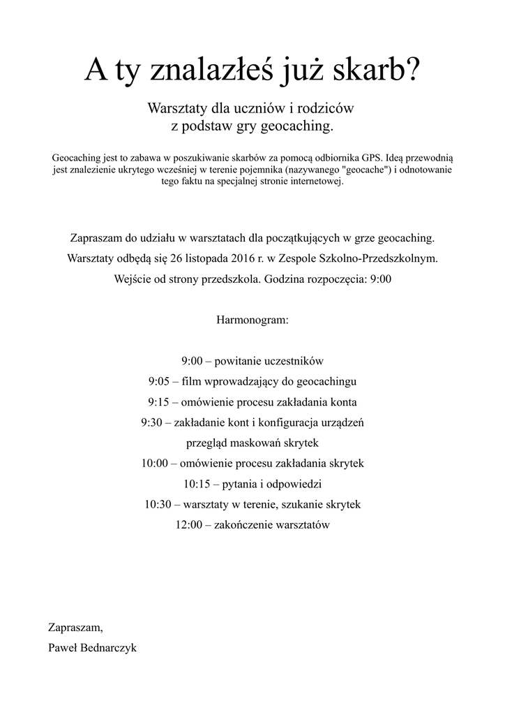 A ty znalazłeś już skarb? Warsztaty dla uczniów i rodziców z podstaw gry geocaching. Geocaching jest to zabawa w poszukiwanie skarbów za pomocą odbiornika GPS. Ideą przewodnią jest znalezienie ukrytego wcześniej w terenie pojemnika (nazywanego "geocache") i odnotowanie tego faktu na specjalnej stronie internetowej. Zapraszam do udziału w warsztatach dla początkujących w grze geocaching. Warsztaty odbędą się 26 listopada 2016 r. w Zespole Szkolno-Przedszkolnym. Wejście od strony przedszkola. Godzina rozpoczęcia: 9:00 Harmonogram: 9:00 – powitanie uczestników 9:05 – film wprowadzający do geocachingu 9:15 – omówienie procesu zakładania konta 9:30 – zakładanie kont i konfiguracja urządzeń przegląd maskowań skrytek 10:00 – omówienie procesu zakładania skrytek 10:15 – pytania i odpowiedzi 10:30 – warsztaty w terenie, szukanie skrytek 12:00 – zakończenie warsztatów Zapraszam, Paweł Bednarczyk
