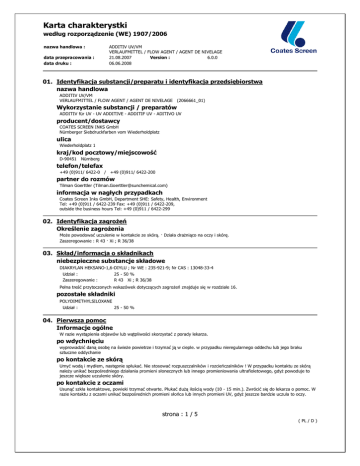 Karta charakterystki według rozporządzenie (WE) 1907/2006 nazwa handlowa : data przepracowania : data druku : ADDITIV UV/VM VERLAUFMITTEL / FLOW AGENT / AGENT DE NIVELAGE 21.08.2007 Version : 6.0.0 06.06.2008 01. Identyfikacja substancji/preparatu i identyfikacja przedsiębiorstwa nazwa handlowa ADDITIV UV/VM VERLAUFMITTEL / FLOW AGENT / AGENT DE NIVELAGE (2066661_01) Wykorzystanie substancji / preparatów ADDITIV für UV - UV ADDITIVE - ADDITIF UV - ADITIVO UV producent/dostawcy COATES SCREEN INKS GmbH Nürnberger Siebdruckfarben vom Wiederholdplatz ulica Wiederholdplatz 1 kraj/kod pocztowy/miejscowość D-90451 Nürnberg telefon/telefax +49 (0)911/ 6422-0 / +49 (0)911/ 6422-200 partner do rozmów Tilman Goerttler ([email protected]) informacja w nagłych przypadkach Coates Screen Inks GmbH, Department SHE: Safety, Health, Environment Tel: +49 (0)911 / 6422-239 Fax: +49 (0)911 / 6422-209, outside the business hours Tel: +49 (0)911 / 6422-299 02. Identyfikacja zagrożeń Określenie zagrożenia Może powodować uczulenie w kontakcie ze skórą. · Działa drażniąco na oczy i skórę. Zaszeregowanie : R 43 · Xi ; R 36/38 03. Skład/informacja o składnikach niebezpieczne substancje składowe DIAKRYLAN HEKSANO-1,6-DIYLU ; Nr WE : 235-921-9; Nr CAS : 13048-33-4 Udział : Zaszeregowanie : 25 - 50 % R 43 Xi ; R 36/38 Pełna treść przytoczonych wskazówek dotyczących zagrożeń znajduje się w rozdziale 16. pozostałe składniki POLYDIMETHYLSILOXANE Udział : 25 - 50 % 04. Pierwsza pomoc Informacje ogólne W razie wystąpienia objawów lub wątpliwości skorzystać z porady lekarza. po wdychnięciu wyprowadzić daną osobę na świeże powietrze i trzymać ją w cieple. w przypadku nieregularnego oddechu lub jego braku sztuczne oddychanie po kontakcie ze skórą Umyć wodą i mydłem, następnie spłukać. Nie stosować rozpuszczalników i rozcieńczalników ! W przypadku kontaktu ze skórą należy unikać bezpośredniego działania promieni słonecznych lub innego promieniowania ultrafioletowego, gdyż powoduje to jeszcze większe uczulenie skóry. po kontakcie z oczami Usunąć szkła kontaktowe, powieki trzymać otwarte. Płukać dużą ilością wody (10 - 15 min.). Zwrócić się do lekarza o pomoc. W razie kontaktu z oczami unikać bezpośrednich promieni słońca lub innych promieni UV, gdyż jeszcze bardzie uczula to oczy. strona : 1 / 5 ( PL / D ) Karta charakterystki według rozporządzenie (WE) 1907/2006 nazwa handlowa : data przepracowania : data druku : ADDITIV UV/VM VERLAUFMITTEL / FLOW AGENT / AGENT DE NIVELAGE 21.08.2007 Version : 6.0.0 06.06.2008 po połknięciu Nie powodować wymiotów, wezwać lekarza. 05. Postępowanie w przypadku pożaru Stosowne środki gaśnicze piana (odporna na alkohole), dwutlenek węgla, proszek, mgła (woda) Środki gaśnicze, których nie wolno użyć ze względów bezpieczeństwa pełny strumień wody Szczególne zagrożenie związane z narażeniem na substancję / preparat, produkty spalania, produkty gazowe W razie pożaru powstaje gęsty, czarny dym. Wdychanie niebezpiecznych poroduktów rozkładu może powodować poważne szkody na zdrowiu. Specjalne wyposażenie ochronne dla osób walczących z pożarem nie wdychać gazów pożarowych W przypadku pożaru: konieczne jest urządzenie ochrony dróg oddechowych z niezależnym zasilaniem świeżym powietrzem informacje dodatkowe W razie pożaru chłodzić wodą zagrożone pojemniki. Nie pozwolić na przedostanie się wody gaśniczej do kanalizacij. 06. Postępowanie w przypadku niezamierzonego uwolnienia do środowiska Indywidualnych środków ostrożności, takich jak Zadbać o wystarczające przewietrzanie. Przestrzegać przepisów bezieczeństwa (patrz rozdział 7 i 8). Środków ochrony środowiska takich jak Nie pozwolić na dostanie się do kanalizacji. W przypadku zanieczyszczenia rzek, jezior lub przewodów kanalizacyjnych należy powiadomić odpowiednie urzędy zgodnie z miejscowymi przepisami. Metod oczyszczania takich jak Wycieknięty/rozsypany materiał otoczyć niepalnym środkiem chłonącym (na przykład piaskiem, ziemią, ziemią okrzemkową, Vermiculite) i zebrać do odpowiednich pojemników zgodnie z miejscowymi przepisami. Najlepiej czyścić przy pomocy środków do czyszczenia, w miarę możliwości nie stosować rozpuszczalników. 07. Postępowanie z substancją/preparatem i jej/jego magazynowanie wskazówki na temat bezpiecznego obchodzenia się z danym produktem Unikać kontaktu ze skórą i oczami. dbać o dopływ świeżego powietrza Przestrzegać ustawowych przepisów ochronnych i bezpieczeństwa. wskazówki na temat ochrony przeciwpożarowej i przeciwwybuchowej Trzymać z dala od źródeł ognia i dbać o dobre przewietrzanie pomieszczeń. wymagania pod względem pomieszczeń magazynowych i pojemników Dokładnie pozamykać otwarte pojemniki i składować w pozycji pionowej, aby zapobiec wyciekom. wskazówki na temat składowania z innymi substancjami Trzymać z dala od silnie kwaśnych i alkalicznych materiałów oraz substancji utleniających. dalsze informacje na temat wymagań co do magazynowania Przechowywać zawsze w opakowaniach, odpowiadających oryginalnemu pojemnikowi. Przestrzegać wskazówek z etykiety. Chronić przed gorącem i bezpośrednim napromieniowaniem słonecznym. Przestrzegać wskazówek bezpieczeństwa i instrukcji, podanej na pojemniku. dbać o zachowanie zalecanej temperatury składowania 08. Kontrola narażenia/środki ochrony indywidualnej Dbać o dobre przewietrzanie. Można to osiągnąć przez lokalny odciąg lub dobre odwietrzenie. Jeśli to nie wystarcza, aby utrzymać stężenie par rozpuszczalników poniżej dopuszczalnych wartości AGW należy nosić odpowiednie urządzenie ochrony dróg oddechowych. Przy pracy nie jeść i nie pić - nie palić. osobiste wyposażenie bezpieczeństwa Ochrona dróg oddechowych W przypadku przekroczenia wartości dopuszczalnych dla miejsca pracy, należy nosić odpowiednią ochronę dróg oddech