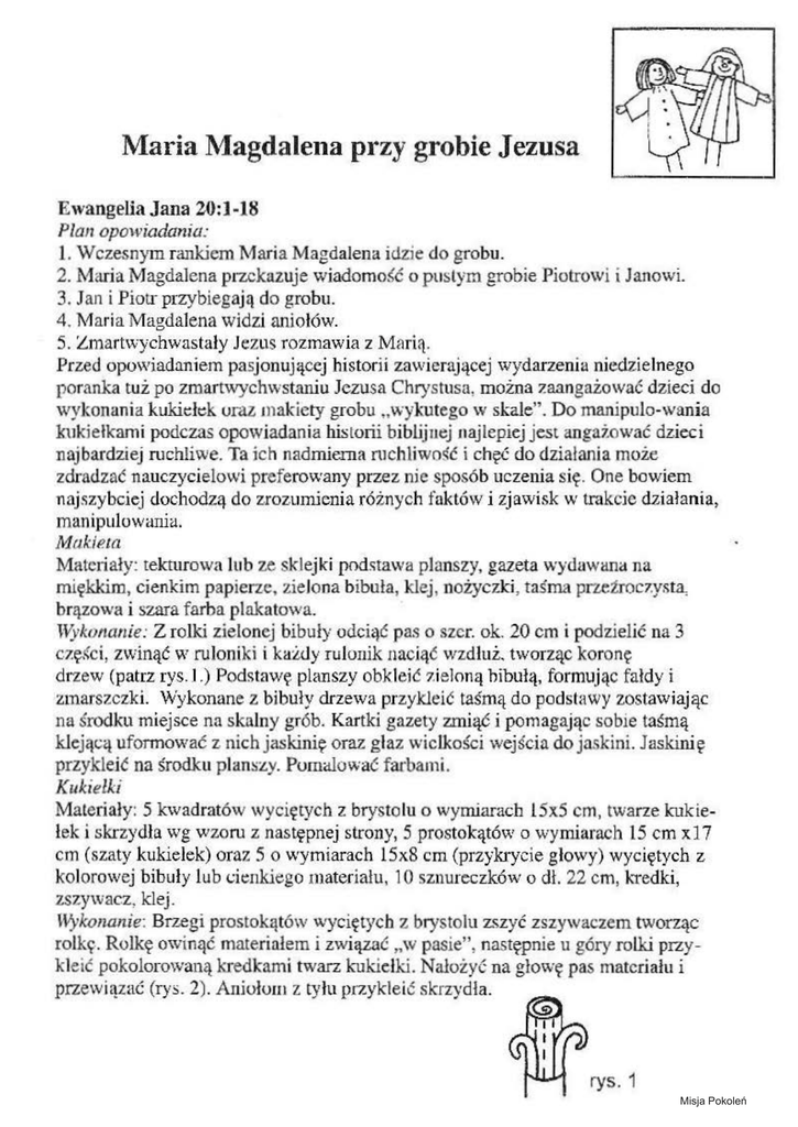 Maria ~1agdałena przy grobie Jezusa Ewangelia Jana 20:1-18 Plan opowiadania: 1. Wczesnym rankiem l\1aria Magdalena idzie do grobu. 2. ł.1aria Magdalena przekazuje wiadomość o pustym grobie Piotrowi i Janowi. 3. Jan i Piou- przybiegają do grobu. 4. l\1aria Magdalena widzi aniołów. 5. Zmartwychwastały Jezus rozmawia z M11rią. Przed opowiadaniem pasjonującej historii zawierającej wydarzenia niedzielnego poranka tuż po zmartwychwstaniu Jezusa Chrystusa, można zaangażować dzieci do wykonania kukid~k uraz. makiety grobu „wykutego w skale". Do manipulo-wania kukiełkami podczas opowiadania historii biblijnej najlepiej jest angażować dzieci najbardziej ruchliwe. Ta ich nadmierna ruchliwo~ć i chęć do działania może zdradzać nauczycielowi preferowany przez nie sposób uczenia się. One bowiem najszybciej dochodzą do zrozmnienia różnych faktów i zjawisk w trakcie działania, manipulowania. Makieta Mate1iały: tekturowa lub ze sklejki podstawa planszy, gazeta wydawana na miękkim, cienkim papierze, zielona bibuła, klej, nożyczki, taśma pr.Getroczysta, brązowa i szara farba plakatowa. lVyko11a11ie: Z rolki zielonej bibuły odciąć pas o szer. ok. 20 cm i podzielić na 3 częśc i, zwinąć w ruloniki i kaidy rulonik naciąć wzdłuż. tworząc koronę drzew (patrz rys. l .) Podstawę planszy obkl eić zieloną bibułą, formując fałdy i z1narszczki. Wykonane z bibuły drzewa przykleić taśmą do podstawy zostawiając na środku miejsce na skalny grób. Kartki gazety zmiąć i pomagając sobie taśmą klejącą uformować z nich jaskinię oraz głaz wielkości wejścia do jaskini. Jaskinię przykleić na środku plansl.y. Pomalować farbami. Kukiełki 5 kwadratów wyciętych z brystolu o wymiarach 15x5 cm, twarze kukiełek i skrzydła wg wzoru z następnej strony, 5 prostokątów o wymiarach 15 cm x17 crn (szaty kukiełek) oraz 5 o wymiarach 15x8 cm (przykrycie głowy) wyc.iętych z kolorowej bibuły lub cienkiego inateriału, 1Osznureczków o dł. 22 cm, kredki, Mateńały: zszywacz, klej. i\.yko11anie: Brz.egi prostokątów wyciętych z brystolu zszyć zszywaczem tworząc rołky. Rolkę owinąć materiałem i związać ,,w pasie", następnie u góry rolki przykleić pokolormvaną kredkami twarz kukiełki. Naloiyć na głowę pas materiału i przewiązać (rys. 2) . Aniołom z tyłu przykleić s krzydła. rys. 1 Misja Pokoleń I - u4 I I I I I ·O I .~I C> ~I I I •(.) '(i) 32 I I ~ I a. 116- l·o, ,~ rys. 2 Misja Pokoleń