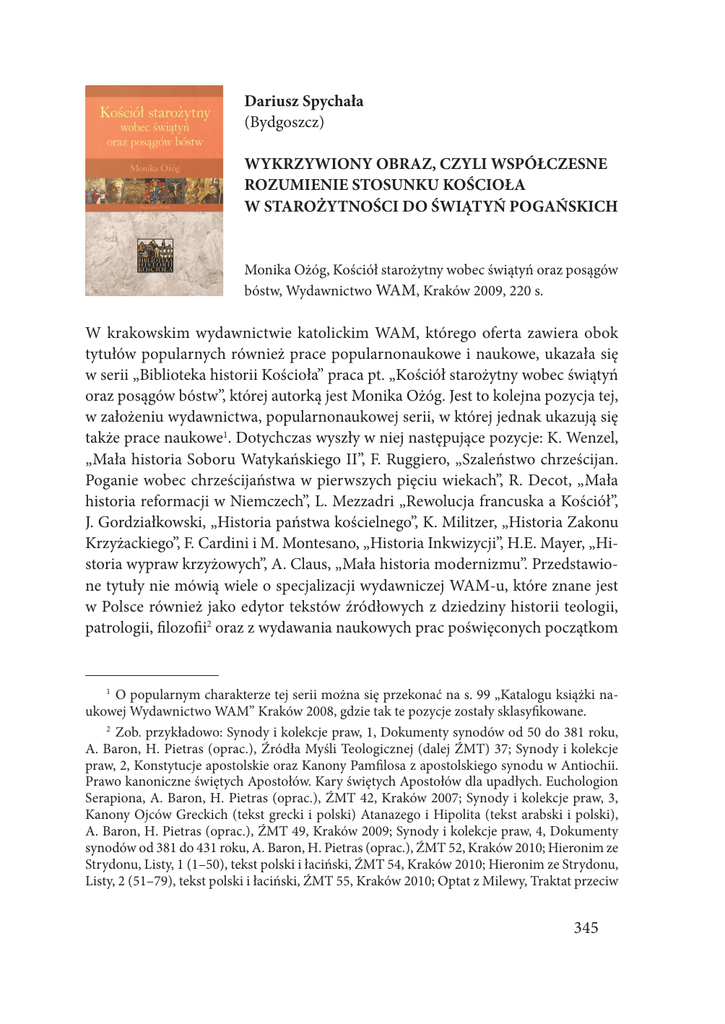 DARIUSZ SPYCHAŁA, WYKRZYWIONY OBRAZ… Dariusz Spychała (Bydgoszcz) WYKRZYWIONY OBRAZ, CZYLI WSPÓŁCZESNE ROZUMIENIE STOSUNKU KOŚCIOŁA W STAROŻYTNOŚCI DO ŚWIĄTYŃ POGAŃSKICH Monika Ożóg, Kościół starożytny wobec świątyń oraz posągów bóstw, Wydawnictwo WAM, Kraków 2009, 220 s. W krakowskim wydawnictwie katolickim WAM, którego oferta zawiera obok tytułów popularnych również prace popularnonaukowe i naukowe, ukazała się w serii „Biblioteka historii Kościoła” praca pt. „Kościół starożytny wobec świątyń oraz posągów bóstw”, której autorką jest Monika Ożóg. Jest to kolejna pozycja tej, w założeniu wydawnictwa, popularnonaukowej serii, w której jednak ukazują się także prace naukowe1. Dotychczas wyszły w niej następujące pozycje: K. Wenzel, „Mała historia Soboru Watykańskiego II”, F. Ruggiero, „Szaleństwo chrześcijan. Poganie wobec chrześcijaństwa w pierwszych pięciu wiekach”, R. Decot, „Mała historia reformacji w Niemczech”, L. Mezzadri „Rewolucja francuska a Kościół”, J. Gordziałkowski, „Historia państwa kościelnego”, K. Militzer, „Historia Zakonu Krzyżackiego”, F. Cardini i M. Montesano, „Historia Inkwizycji”, H.E. Mayer, „Historia wypraw krzyżowych”, A. Claus, „Mała historia modernizmu”. Przedstawione tytuły nie mówią wiele o specjalizacji wydawniczej WAM-u, które znane jest w Polsce również jako edytor tekstów źródłowych z dziedziny historii teologii, patrologii, filozofii2 oraz z wydawania naukowych prac poświęconych początkom 1 O popularnym charakterze tej serii można się przekonać na s. 99 „Katalogu książki naukowej Wydawnictwo WAM” Kraków 2008, gdzie tak te pozycje zostały sklasyfikowane. 2 Zob. przykładowo: Synody i kolekcje praw, 1, Dokumenty synodów od 50 do 381 roku, A. Baron, H. Pietras (oprac.), Źródła Myśli Teologicznej (dalej ŹMT) 37; Synody i kolekcje praw, 2, Konstytucje apostolskie oraz Kanony Pamfilosa z apostolskiego synodu w Antiochii. Prawo kanoniczne świętych Apostołów. Kary świętych Apostołów dla upadłych. Euchologion Serapiona, A. Baron, H. Pietras (oprac.), ŹMT 42, Kraków 2007; Synody i kolekcje praw, 3, Kanony Ojców Greckich (tekst grecki i polski) Atanazego i Hipolita (tekst arabski i polski), A. Baron, H. Pietras (oprac.), ŹMT 49, Kraków 2009; Synody i kolekcje praw, 4, Dokumenty synodów od 381 do 431 roku, A. Baron, H. Pietras (oprac.), ŹMT 52, Kraków 2010; Hieronim ze Strydonu, Listy, 1 (1–50), tekst polski i łaciński, ŹMT 54, Kraków 2010; Hieronim ze Strydonu, Listy, 2 (51–79), tekst polski i łaciński, ŹMT 55, Kraków 2010; Optat z Milewy, Traktat przeciw 345 STUDIA EUROPAEA GNESNENSIA 4/2011 · RECENZJE chrześcijaństwa3. Firma ta powinna więc gwarantować wysoki poziom merytoryczny udostępnianych czytelnikowi dysertacji. Jak się wydaje, praca M. Ożóg to zmieniona wersja doktoratu, obronionego przez autorkę na Uniwersytecie Gdańskim w 2008 r., powinna więc bez problemów spełniać te wymagania. W polskiej literaturze naukowej problem stosunku chrześcijaństwa do świątyń pogańskich oraz posągów bóstw nie był dotychczas specjalnie eksploatowany. Ukazało się wszystkiego kilka prac naukowych, z których należy wymienić przede wszystkim dysertacje A. Dębińskiego i L. Małunowiczówny oraz, częściowo tylko poruszające interesujące nas zagadnienie, pozycje D. Musiał, E. Wipszyckiej czy T. Zielińskiego4. Można jeszcze wspomnieć o kilku artykułach opublikowanych w czasopismach naukowych5. Reszta to niestety pozycje o charakterze raczej po- donatystom, ŹMT 56, Kraków 2011; Augustyn z Hippony, O życiu szczęśliwym, Źródła Myśli Filozoficznej, Kraków 2006; Augustyn z Hippony, Przeciw Akademikom, ŹMT, Kraków 2007. 3 Zob. np.: H. Chadwick, Historia rozłamu Kościoła wschodniego i zachodniego. Od czasów apostolskich do soboru florenckiego, Kraków 2009; W. Gajewski, Charyzmat urząd hierarchia, Kraków 2010; B. Górka, Biblia i cywilizacja Boga, Kraków 2004; idem, Hermeneutyka inicjacji wczesnochrześcijańskiej, Kraków 2007; idem, Jezus i Samarytanka (J. 4,1–42). Historia i inicjacja, Kraków 2008; S. Łucarz, Grób czy świątynia? Problematyka cielesności w antropologii Klemensa Aleksandryjskiego, Kraków 2007; M. Przyszychowska, Nauka o łasce w dziełach świętego Grzegorza z Nyssy, Kraków 2010; K. Schatz, Sobory powszechne. Punkty zwrotne w historii Kościoła, Kraków 2001; idem, Prymat papieski od początków do współczesności, Kraków 2004; S. Strękowski, Sofiologia św. Grzegorza z Nyssy. Elementy teologii trynitarnej i antropologii w Homiliach do Pieśni nad Pieśniami, Kraków 2006; C. Morrisson (red.), Świat Bizancjum, 1, Cesarstwo wschodniorzymskie 330–641, Kraków 2007; szczególnie należy wspomnieć o pracy E. Jastrzębowskiej, zatytułowanej ,,Sztuka wczesnochrześcijańska”, Kraków 2008. 4 A. Dębiński, Ustawodawstwo karne rzymskich cesarzy chrześcijańskich w sprawach religijnych, Lublin 1990; L. Małunowiczówna, De ara Victoriae in Curia Romana, Wilno 1937; D. Musiał, Antyczne korzenie chrześcijaństwa, Warszawa 2001; Sz. Olszaniec, Julian Apostata, Kraków 1999; E. Wipszycka, Kościół w świecie późnego antyku, Warszawa 1994; T. Zieliński, Chrześcijaństwo antyczne, Toruń 1999; idem, Religia Rzeczpospolitej Rzymskiej, Toruń 2001. 5 Zob. np.: R. Dyrcz, Wokół zburzenia przez Konstantyna Wielkiego Asklepiejonu w Ajgaj w Cylicji w 331 r. po Ch., Nowy Filomata 3/1999, s. 195–209; M. Dzielska, Kilka uwag na temat żywotności idei pogańskich w IV i pierwszej połowie V w., [w:] E. Konik (red.), 1500-lecie upadku Cesarstwa Zachodniorzymskiego, Wrocław 1979, s. 155–160; B. Gąssowska, Maternus Cynegius, praefectus praetorio orientis and the destruction of the Allat Temple in Palmyra, Archeologia 33/ 1982, s. 107–123; K. Majewski, Bezobrazowość oraz burzenie świątyń, posągów bogów i pomników wł