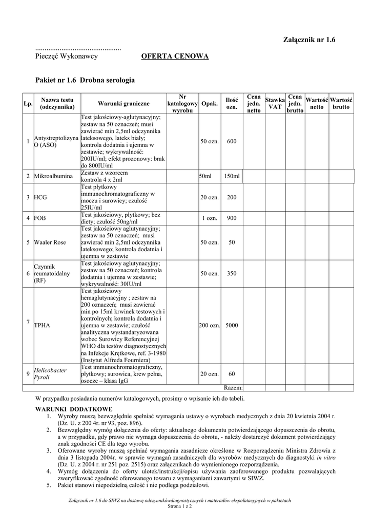 Załącznik nr 1.6 .............................................. Pieczęć Wykonawcy OFERTA CENOWA Pakiet nr 1.6 Drobna serologia Lp. Nazwa testu (odczynnika) Warunki graniczne Test jakościowy-aglutynacyjny; zestaw na 50 oznaczeń; musi zawierać min 2,5ml odczynnika Antystreptolizyna lateksowego, lateks biały; 1 kontrola dodatnia i ujemna w O (ASO) zestawie; wykrywalność: 200IU/ml; efekt prozonowy: brak do 800IU/ml Zestaw z wzorcem 2 Mikroalbumina kontrola 4 x 2ml Test płytkowy immunochromatograficzny w 3 HCG moczu i surowicy; czułość 25IU/ml Test jakościowy, płytkowy; bez 4 FOB diety; czułość 50ng/ml Test jakościowy aglutynacyjny; zestaw na 50 oznaczeń; musi 5 Waaler Rose zawierać min 2,5ml odczynnika lateksowego; kontrola dodatnia i ujemna w zestawie Test jakościowy aglutynacyjny; Czynnik zestaw na 50 oznaczeń; kontrola 6 reumatoidalny dodatnia i ujemna w zestawie; (RF) wykrywalność: 30IU/ml Test jakościowy hemaglutynacyjny ; zestaw na 200 oznaczeń; musi zawierać min po 15ml krwinek testowych i kontrolnych; kontrola dodatnia i 7 TPHA ujemna w zestawie; czułość analityczna wystandaryzowana wobec Surowicy Referencyjnej WHO dla testów diagnostycznych na Infekcje Krętkowe, ref. 3-1980 (Instytut Alfreda Fourniera) Test immunochromatograficzny, Helicobacter 9 płytkowy; surowica, krew pełna, Pyroli osocze – klasa IgG Nr katalogowy Opak. wyrobu Ilość ozn. 50 ozn. 600 50ml Cena Cena Stawka Wartość Wartość jedn. jedn. VAT netto brutto netto brutto 150ml 20 ozn. 200 1 ozn. 900 50 ozn. 50 50 ozn. 350 200 ozn. 5000 20 ozn. 60 Razem: W przypadku posiadania numerów katalogowych, prosimy o wpisanie ich do tabeli. WARUNKI DODATKOWE 1. Wyroby muszą bezwzględnie spełniać wymagania ustawy o wyrobach medycznych z dnia 20 kwietnia 2004 r. (Dz. U. z 200 4r. nr 93, poz. 896). 2. Bezwzględny wymóg dołączenia do oferty: aktualnego dokumentu potwierdzającego dopuszczenia do obrotu, a w przypadku, gdy prawo nie wymaga dopuszczenia do obrotu, - naleŜy dostarczyć dokument potwierdzający znak zgodności CE dla tego wyrobu. 3. Oferowane wyroby muszą spełniać wymagania zasadnicze określone w Rozporządzeniu Ministra Zdrowia z dnia 3 listopada 2004r. w sprawie wymagań zasadniczych dla wyrobów medycznych do diagnostyki in vitro (Dz. U. z 2004 r. nr 251 poz. 2515) oraz załącznikach do wymienionego rozporządzenia. 4. Wymóg dołączenia do oferty ulotek/instrukcji/opisu uŜywania zaoferowanego produktu pozwalających zweryfikować zgodność oferowanego towaru z wymaganiami zawartymi w SIWZ. 5. Pakiet stanowi niepodzielną całość i nie podlega podziałowi. Załącznik nr 1.6 do SIWZ na dostawę odczynnikówdiagnostycznych i materiałów ekspolatacyjnych w pakietach Strona 1 z 2 Razem netto..................(słownie...............................................................................................) Razem brutto.................(słownie..............................................................................................) ............................dnia.................................... ………………………............... Pieczęć i podpis osoby uprawnionej Załącznik nr 1.6 do SIWZ na dostawę odczynnikówdiagnostycznych i materiałów ekspolatacyjnych w pakietach Strona 2 z 2
