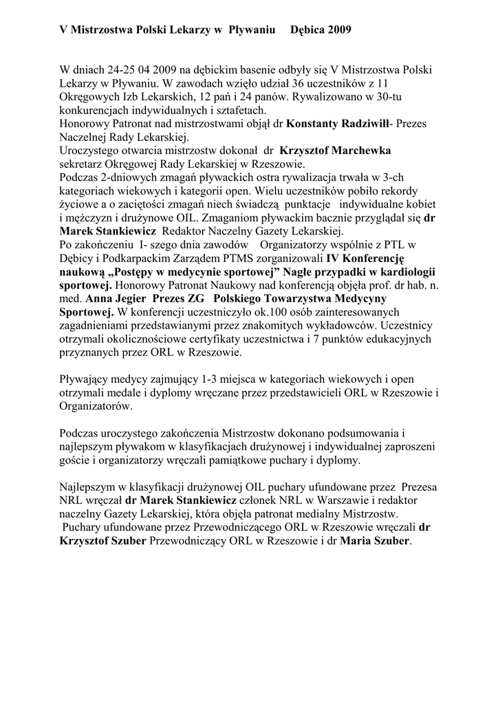 V Mistrzostwa Polski Lekarzy w Pływaniu Dębica 2009 W dniach 24-25 04 2009 na dębickim basenie odbyły się V Mistrzostwa Polski Lekarzy w Pływaniu. W zawodach wzięło udział 36 uczestników z 11 Okręgowych Izb Lekarskich, 12 pań i 24 panów. Rywalizowano w 30-tu konkurencjach indywidualnych i sztafetach. Honorowy Patronat nad mistrzostwami objął dr Konstanty Radziwiłł- Prezes Naczelnej Rady Lekarskiej. Uroczystego otwarcia mistrzostw dokonał dr Krzysztof Marchewka sekretarz Okręgowej Rady Lekarskiej w Rzeszowie. Podczas 2-dniowych zmagań pływackich ostra rywalizacja trwała w 3-ch kategoriach wiekowych i kategorii open. Wielu uczestników pobiło rekordy Ŝyciowe a o zaciętości zmagań niech świadczą punktacje indywidualne kobiet i męŜczyzn i druŜynowe OIL. Zmaganiom pływackim bacznie przyglądał się dr Marek Stankiewicz Redaktor Naczelny Gazety Lekarskiej. Po zakończeniu I- szego dnia zawodów Organizatorzy wspólnie z PTL w Dębicy i Podkarpackim Zarządem PTMS zorganizowali IV Konferencję naukową „Postępy w medycynie sportowej” Nagłe przypadki w kardiologii sportowej. Honorowy Patronat Naukowy nad konferencją objęła prof. dr hab. n. med. Anna Jegier Prezes ZG Polskiego Towarzystwa Medycyny Sportowej. W konferencji uczestniczyło ok.100 osób zainteresowanych zagadnieniami przedstawianymi przez znakomitych wykładowców. Uczestnicy otrzymali okolicznościowe certyfikaty uczestnictwa i 7 punktów edukacyjnych przyznanych przez ORL w Rzeszowie. Pływający medycy zajmujący 1-3 miejsca w kategoriach wiekowych i open otrzymali medale i dyplomy wręczane przez przedstawicieli ORL w Rzeszowie i Organizatorów. Podczas uroczystego zakończenia Mistrzostw dokonano podsumowania i najlepszym pływakom w klasyfikacjach druŜynowej i indywidualnej zaproszeni goście i organizatorzy wręczali pamiątkowe puchary i dyplomy. Najlepszym w klasyfikacji druŜynowej OIL puchary ufundowane przez Prezesa NRL wręczał dr Marek Stankiewicz członek NRL w Warszawie i redaktor naczelny Gazety Lekarskiej, która objęła patronat medialny Mistrzostw. Puchary ufundowane przez Przewodniczącego ORL w Rzeszowie wręczali dr Krzysztof Szuber Przewodniczący ORL w Rzeszowie i dr Maria Szuber. Klasyfikacja druŜynowa OIL 1. OIL Szczecin - 296 pkt 2. OIL Katowice - 184 3. OIL Rzeszów - 136 /7 pierwszych miejsc/ 4. OIL Warszawa - 136 /5 pierwszych miejsc/ 5. OIL Katowice - 164 6. OIL Warszawa - 133 Znakomite pływaczki i pływacy ze Szczecina ponowni wygrali w sposób zdecydowany klasyfikację druŜynową,2-gie miejsce zajęli młodzi pływacy ze Śląska, a gospodarze z OIL z Rzeszowa po zaciętej walce wygrali z Warszawą.. Najlepszym pływaczkom puchary ufundowane przez Pawła Wolickiego Burmistrza Dębicy wręczał Marek Kamiński Drektor dębickiego Mosiru. Klasyfikacja indywidualna kobiet 1.STĘPIEŃ-GIELO Joanna (OIL Szczecin) - 2249 2.DAMLJANOVIC Iwona (OIL Szczecin) - 1896 3.HERMAN Aleksandra (OILKatowice) - 1843 4.ZIARKO Danuta (OIL Katowice) -1663 5.ZIMNA-WALENDZIK Ewa (OIL ŁódŜ) -1571 6.NAJDA ElŜbieta (OIL Lublin) -1188 Starosta Powiatu dębickiego Władysław Bielawa ufundował i wręczał puchary najlepszym w kategorii męŜczyzn. Klasyfikacja indywidualna męŜczyzn 1.PASIECZNY Andrzej (OIL Gdańsk) - 2711 pkt 2.LORKOWSKI Robert (OIL Rzeszów) -2116 3.LESZCZYŃSKI Jerzy (OIL Warszawa) -2078 4.KAśMIERCZAK Krzysztof (OIL Łódź) - 2071 5.KAWECKI Krzysztof (OIL Bydgoszcz) -2065 6.GRZESZEWSKI Sławomir (OIL Szczecin) -1958 *Zestawienie punktów za 4 najlepsze starty wg tabeli DSV Master Performance Table version 1998. Oficjalne wyniki III Mistrzostw Lekarzy w Pływaniu na stronach internetowych Mistrzostw mplwp.xt.pl i OIL w Rzeszowie /www.rzeszow.oil.org.pl/.