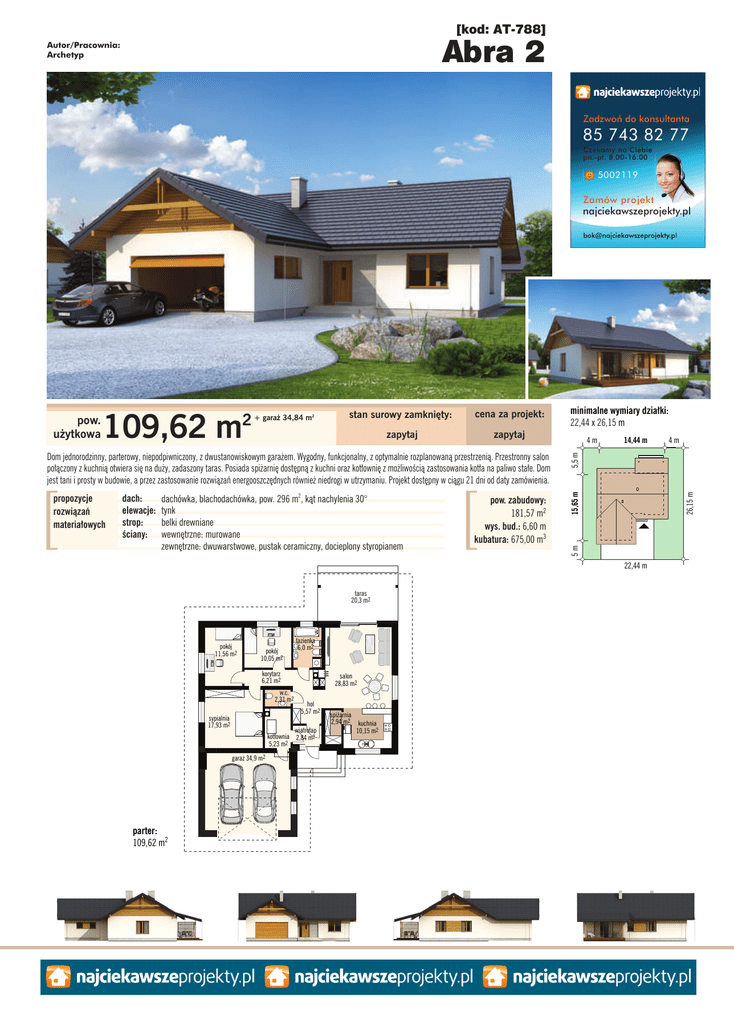 [kod: AT-788] Abra 2 Autor/Pracownia: Archetyp Zadzwoń do konsultanta 85 743 82 77 Czekamy na Ciebie pn.-pt. 8.00-16.00 5002119 Zamów projekt najciekawszeprojekty.pl cena za projekt: zapytaj zapytaj Dom jednorodzinny, parterowy, niepodpiwniczony, z dwustanowiskowym garażem. Wygodny, funkcjonalny, z optymalnie rozplanowaną przestrzenią. Przestronny salon połączony z kuchnią otwiera się na duży, zadaszony taras. Posiada spiżarnię dostępną z kuchni oraz kotłownię z możliwością zastosowania kotła na paliwo stałe. Dom jest tani i prosty w budowie, a przez zastosowanie rozwiązań energooszczędnych również niedrogi w utrzymaniu. Projekt dostępny w ciągu 21 dni od daty zamówienia. propozycje rozwiązań materiałowych dach: elewacje: strop: ściany: dachówka, blachodachówka, pow. 296 m2, kąt nachylenia 30° tynk belki drewniane wewnętrzne: murowane zewnętrzne: dwuwarstwowe, pustak ceramiczny, docieplony styropianem pow. zabudowy: 181,57 m2 wys. bud.: 6,60 m kubatura: 675,00 m3 minimalne wymiary działki: 22,44 x 26,15 m 4m 14,44 m 22,44 m taras 20,3 m2 pokój 11,56 m2 pokój 10,05 m2 łazienka 6,0 m2 korytarz 6,21 m2 w.c. 2,31 m2 sypialnia 17,93 m2 hol 5,57 m2 wiatrołap kotłownia 2,84 m2 5,23 m2 garaż 34,9 m2 parter: 109,62 m2 salon 28,83 m2 spiżarnia 2,94 m2 kuchnia 10,15 m2 4m 26,15 m stan surowy zamknięty: 5,5 m 109,62 m 2 15,65 m 2 + garaż 34,84 m 5m pow. użytkowa