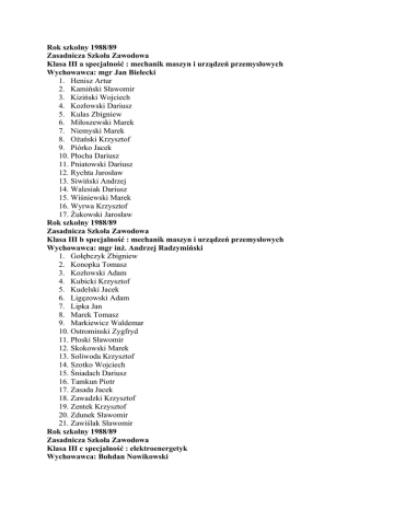 Rok szkolny 1988/89 Zasadnicza Szkoła Zawodowa Klasa III a specjalność : mechanik maszyn i urządzeń przemysłowych Wychowawca: mgr Jan Bielecki 1. Henisz Artur 2. Kamiński Sławomir 3. Kiziński Wojciech 4. Kozłowski Dariusz 5. Kulas Zbigniew 6. Miłoszewski Marek 7. Niemyski Marek 8. Ożański Krzysztof 9. Piórko Jacek 10. Płocha Dariusz 11. Pniatowski Dariusz 12. Rychta Jarosław 13. Siwiński Andrzej 14. Walesiak Dariusz 15. Wiśniewski Marek 16. Wyrwa Krzysztof 17. Żukowski Jarosław Rok szkolny 1988/89 Zasadnicza Szkoła Zawodowa Klasa III b specjalność : mechanik maszyn i urządzeń przemysłowych Wychowawca: mgr inż. Andrzej Radzymiński 1. Gołębczyk Zbigniew 2. Konopka Tomasz 3. Kozłowski Adam 4. Kubicki Krzysztof 5. Kudelski Jacek 6. Ligęzowski Adam 7. Lipka Jan 8. Marek Tomasz 9. Markiewicz Waldemar 10. Ostrominski Zygfryd 11. Płoski Sławomir 12. Skokowski Marek 13. Soliwoda Krzysztof 14. Szotko Wojciech 15. Śniadach Dariusz 16. Tamkun Piotr 17. Zasada Jacek 18. Zawadzki Krzysztof 19. Zentek Krzysztof 20. Zdunek Sławomir 21. Zawiślak Sławomir Rok szkolny 1988/89 Zasadnicza Szkoła Zawodowa Klasa III c specjalność : elektroenergetyk Wychowawca: Bohdan Nowikowski 1. Bladosz Zbigniew 2. Błaszczak Zbigniew 3. Bogusz Robert 4. Bojarski Stanisław 5. Cieciora Tomasz 6. Chabrowski Włodzimierz 7. Chrostowski Andrzej 8. Dec Jarosław 9. Grochowski Marek 10. Justowicz Zbigniew 11. Kowalski Piotr 12. Krasaka Tomasz 13. Łabaj Marcin 14. Malinowski Wojciech 15. Markiewicz Maciej 16. Nitek Dariusz 17. Olszewski Jarosław 18. Pietka Krzysztof 19. Przerwa Sławomir 20. Rapacki Waldemar 21. Suchoparski Krzysztof 22. Sobczuk Arkadiusz 23. Wasilewski Krzysztof 24. Welter Tomasz 25. Zagórski Krzysztof 26. Zyśk Ryszard 27. Brzozowski Dariusz 28. Grela Jarosław Rok szkolny 1988/89 Zasadnicza Szkoła Zawodowa Klasa III d specjalność : elektroenergetyka Wychowawca: Czesława Olszewska 1. Czajka Piotr 2. Fijolek Jarosław 3. Iwanowicz Ireneusz 4. Jędrzejczyk Krzysztof 5. Kościjańczuk Przemysław 6. Kraśniewicz Krzysztof 7. Kurtyś Mirosław 8. Kuś Krzysztof 9. Lodd Marek 10. Oświecimski Rafał 11. Poschman Waldemar 12. Perczyński Dariusz 13. Przybyszewski Dariusz 14. Sawko Robert 15. Sierżant Jerzy 16. Skiber Krzysztof 17. Szatkowski Karol 18. Szkudlarek Jan 19. Unruch Marek 20. Użdalewicz Adam 21. Wasilewski Adam 22. Urban Marek 23. Świetoniowski Krzysztof 24. Furmaniak Zdzisław 25. Żebrowski Marek 26. Kozłowski Wojciech Rok szkolny 1988/89 Zasadnicza Szkoła Zawodowa Klasa III e specjalność : tokarz Wychowawca: mgr Ryszard Krępuła 1. Bielowski Bogusław 2. Grzegorczyk Grzegorz 3. Grzelak Zbigiew 4. Kaczerowski Robert 5. Korzeń Andrzej 6. Kurowski Grzegorz 7. Lisowski Robert 8. Lubak Jacek 9. Ludwik Andrzej 10. Maks Jacek 11. Muzyka Jacek 12. Pstrągowski Tomasz 13. Radzikowski Grzegorz 14. Słowik Mariusz 15. Sowiński Roman 16. Trojanowski Jarosław Rok szkolny 1988/89 Szkoła Przysposobiająca do Zawodu Klasa II U-za specjalność : ślusarz Wychowawca: Andrzej Ławrynowicz 1. Bochowski Piotr 2. Borkowski Dariusz 3. Cybulski Dariusz 4. Dziewulski Zenon 5. Gawłowski Andrzej 6. Jędra Krzysztof 7. Maluchnik Sławomir 8. Obudziński Grzegorz 9. Piekarski Andrzej 10. Sędrowski Paweł 11. Szyszko Mirosław 12. Wasiak Jarosław 13. Ziółkowski Kazimierz 14. Żejewski Bernard 15. Olechowicz Piotr Rok szkolny 1988/89 Szkoła Przysposobiająca do Zawodu Klasa II U-zb specjalność : ślusarz Wychowawca: Marian Kupczałojć 1. Atałap Józef 2. Bąkolik Henryk 3. Cesarski Ryszard 4. Chudzik Adam 5. Giera Dariusz 6. Kamiński Józef 7. Kruszewski Bogdan 8. Michalewicz Janusz 9. Mierzwicki Janusz 10. Morawski Mariusz 11. Moszczynski Andrzej 12. Sikora Dariusz 13. Sokołowski Mariusz 14. Woźniak Bogdan Rok szkolny 1988/89 Technikum Elektryczne Klasa VE5 specjalność: elektroenergetyka Wychowawca: mgr Jan Czużdaniuk 1. Czaja Mirosław 2. Flisiakowski Jerzy 3. Florczuk Grzegorz 4. Gleba Bogusław 5. Gotowski Mariusz 6. Janicki Piotr 7. Kajdanowski Jan 8. Łapiejko Edumund 9. Majewski Dariusz 10. Marcinkowski Adam 11. Matuszewicz Cezary 12. Milewski Bogdan 13. Niemiro Dariusz 14. Nowak Piotr 15. Paśnikowski Jarosław 16. Pętlak Piotr 17. Rydzewski Mariusz 18. Suchowiecki Jarosław 19. Ścibek Tomasz 20. Woźniak Jacek 21. Zych Dariusz 22. Żywólko Jarosław Rok szkolny 1988/89 Technikum Mechaniczne Klasa III M3 specjalność: budowa maszyn Wychowawca: mgr Leon Pokora 1. Abramowski Robert 2. Bartosiak Jerzy 3. Berdzik Eugeniusz 4. Bucholski Marek 5. Butkiewicz Paweł 6. Dąbrowski Wojciech 7. Glista Piotr 8. Grablewski Stanisław 9. Graczykowski Janusz 10. Gromacki Krzysztof 11. Jaroszewski Jarosław 12. Kowalczyk Dariusz 13. Królikowski Bogdan 14. Kubach Tomasz 15. Pich Artur 16. Polewacz Paweł 17. Sobolewski Paweł 18. Szelązek Zbigniew 19. Szorc Krzysztof 20. Ziółkowski Arkadiusz 21. Przekop Sławomir Rok szkolny 1988/89 Wydział dla Pracujących Technikum Mechaniczne Klasa III Mw specjalność: budowa maszyn Wychowawca: 1. Bajkowski Czesław 2. Gierys Józef 3. Ignaszczak Piotr 4. Kapusta Krzysztof 5. Kołakowski Marek 6. Lubak Dariusz 7. Lubak Małgorzata 8. Smajewski Krzysztof 9. Witka Marian 10. Żeńczak Dariusz 11. Sarnowski Andrzej 12. Syminowicz Marcin Rok szkolny 1988/89 Wydział dla Pracujących Technikum Elektryczne Klasa III Ew specjalność: budowa maszyn Wychowawca: 1. Borysik Andrzej 2. Czapliński Jacek 3. Filipski Zbigniew 4. Gojska Sławomir 5. Gumowski Adam 6. Ikaniewicz Robert 7. Jędrzejewski Adam 8. Kogut Janusz 9. Kozłowski Krzysztof 10. Maliszewski Tadeusz 11. Piszczatowski Bogusław 12. Radecki Jan 13. Stadmiłek Mirosław 14. Jankowski Sławomir 15. Wrzesiński Zbigniew