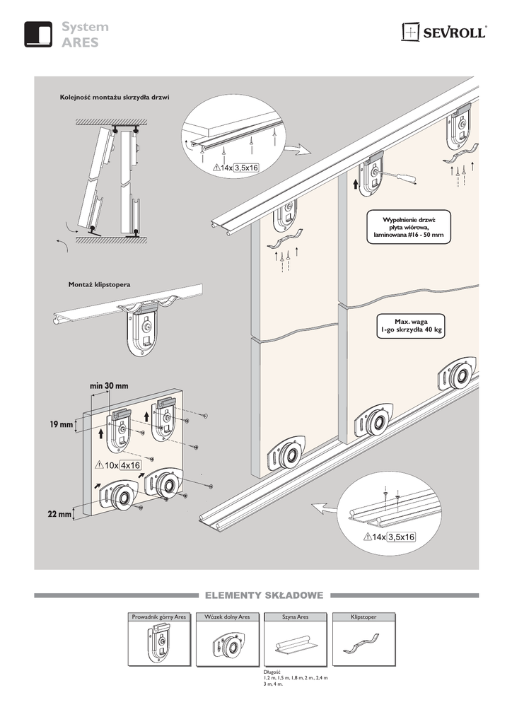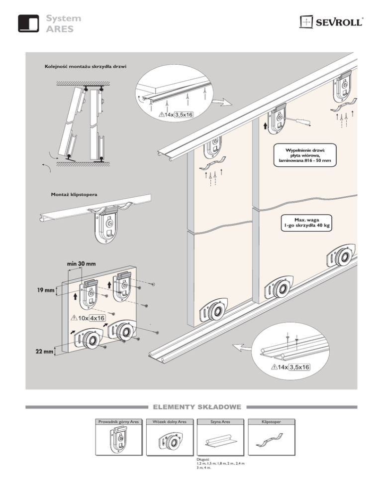 System ARES Kolejność montażu skrzydła drzwi Wypełnienie drzwi: płyta wiórowa, laminowana #16 - 50 mm Montaż klipstopera Max. waga 1-go skrzydła 40 kg Prowadnik górny Ares Wózek dolny Ares Szyna Ares Długość 1,2 m, 1,5 m, 1,8 m, 2 m., 2,4 m 3 m, 4 m. Klipstoper System ARES H D H hs = H - 8 mm Światło otworu Wypełnienie skrzydła -płyta od # 16 mm do 50 mm. Montaż wózków dolnych i prowadnic górnych do skrzydła Montaż klipstoperów do szyny górnej D d 1 Z wysokość skrzydła drzwi wysokość płyty szerokość skrzydła drzwi szerokość płyty szerokość wnęki szerokość zakładki drzwi liczba skrzydeł drzwi 2008 v1.0 str. 2/2 3 2 h hp d dp D Z n h=H - 8 hp=h [D+(n-1)Z]:n dp=d mm mm szt.
