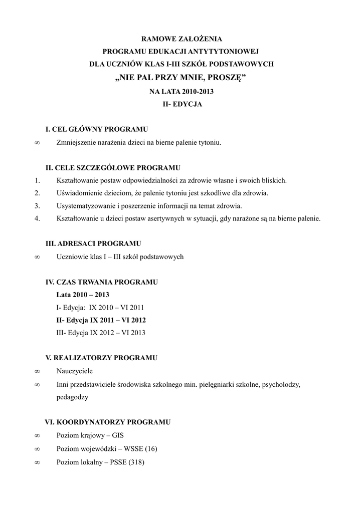 RAMOWE ZAŁOŻENIA PROGRAMU EDUKACJI ANTYTYTONIOWEJ DLA UCZNIÓW KLAS I-III SZKÓŁ PODSTAWOWYCH „NIE PAL PRZY MNIE, PROSZĘ” NA LATA 2010-2013 II- EDYCJA I. CEL GŁÓWNY PROGRAMU • Zmniejszenie narażenia dzieci na bierne palenie tytoniu. II. CELE SZCZEGÓŁOWE PROGRAMU 1. Kształtowanie postaw odpowiedzialności za zdrowie własne i swoich bliskich. 2. Uświadomienie dzieciom, że palenie tytoniu jest szkodliwe dla zdrowia. 3. Usystematyzowanie i poszerzenie informacji na temat zdrowia. 4. Kształtowanie u dzieci postaw asertywnych w sytuacji, gdy narażone są na bierne palenie. III. ADRESACI PROGRAMU • Uczniowie klas I – III szkół podstawowych IV. CZAS TRWANIA PROGRAMU Lata 2010 – 2013 I- Edycja: IX 2010 – VI 2011 II- Edycja IX 2011 – VI 2012 III- Edycja IX 2012 – VI 2013 V. REALIZATORZY PROGRAMU • Nauczyciele • Inni przedstawiciele środowiska szkolnego min. pielęgniarki szkolne, psycholodzy, pedagodzy VI. KOORDYNATORZY PROGRAMU • Poziom krajowy – GIS • Poziom wojewódzki – WSSE (16) • Poziom lokalny – PSSE (318) VII. PARTNERZY PROGRAMU • Ministerstwo Edukacji Narodowej • Stowarzyszenie na Rzecz Dzieciństwa Wolnego od Tytoniu • Inni – na poziomie wojewódzkim i lokalnym VIII. METODYKA REALIZACJI PROGRAMU • Przedstawienie oferty programowej dyrektorom szkół podstawowych w kraju: I-Edycja – 24% uczniów klas I-III szkół podstawowych II- Edycja – 40% uczniów klas I-III szkół podstawowych III- Edycja – 60 % uczniów klas I-III szkół podstawowych • Przeszkolenie i przygotowanie koordynatorów Programu: - koordynatorów wojewódzkich: GIS - koordynatorów powiatowych: WSSE - realizatorów szkolnych: PSSE IX. REALIZACJA II - EDYCJI PROGRAMU W SZKOŁACH 1. 2. Zadanie Odpowiedzialny Poinformowanie realizatorów programu w szkołach o powiatowy koordynator sposobie jego realizacji. programu (PSSE) Poinformowanie rodziców dzieci o realizacji programu w realizatorzy programu w szkole szkole. Współpraca z rodzicami/opiekunami: - spotkanie z rodzicami - list do rodziców - inne formy 3. Przeprowadzenie zajęć warsztatowych z uczniami wg realizatorzy programu w szkole zaproponowanych scenariuszy zajęć: - Zajęcia 1. Co to jest zdrowie? - Zajęcia 2. Od czego zależy nasze zdrowie? - Zajęcia 3. Co i dlaczego szkodzi zdrowiu? - Zajęcia 4. Co robić, gdy moje zdrowie jest zagrożone? - Zajęcia 5. Nie pal przy mnie, proszę. 4. Przeprowadzenie zajęć z rodzicami uczniów według autorskich projektów w szkołach. realizatorzy programu w szkole 5. Podsumowanie programu. realizatorzy programu w szkole/ koordynator WSSE/PSSE/GIS X. NADZOROWANIE I MONITOROWANIE REALIZACJI PROGRAMU Odpowiedzialni: GIS, WSSE, PSSE XI. PODSUMOWANIE I OCENA REALIZACJI I-EDYCJI PROGRAMU Dokonanie podsumowania i oceny z uwzględnieniem następujących wskaźników: • liczba szkół, które zrealizowały program/odsetek szkół, które zrealizowały program; • liczba dzieci, które uczestniczyły w programie/odsetek dzieci, które uczestniczyły w programie; • liczba rodziców, którzy uczestniczyli w programie; • liczba przeszkolonych koordynatorów/realizatorów programu: - na poziomie wojewódzkim (dla koordynatorów powiatowych) - na poziomie powiatowym (dla realizatorów programu w szkołach) • zakres dodatkowej działalności, dobre praktyki w realizacji programu; • wnioski z realizacji programu. Odpowiedzialni: GIS/WSSE/PSSE/realizatorzy programu w szkołach XII. OPRACOWANIE SPRAWOZDANIA Z REALIZACJI II - EDYCJI PROGRAMU Odpowiedzialni: GIS/WSSE/PSSE/realizatorzy programu w szkołach XIII. PRZYGOTOWANIE I UDOSKONALENIE KOLEJNEJ EDYCJI PROGRAMU Odpowiedzialni: GIS