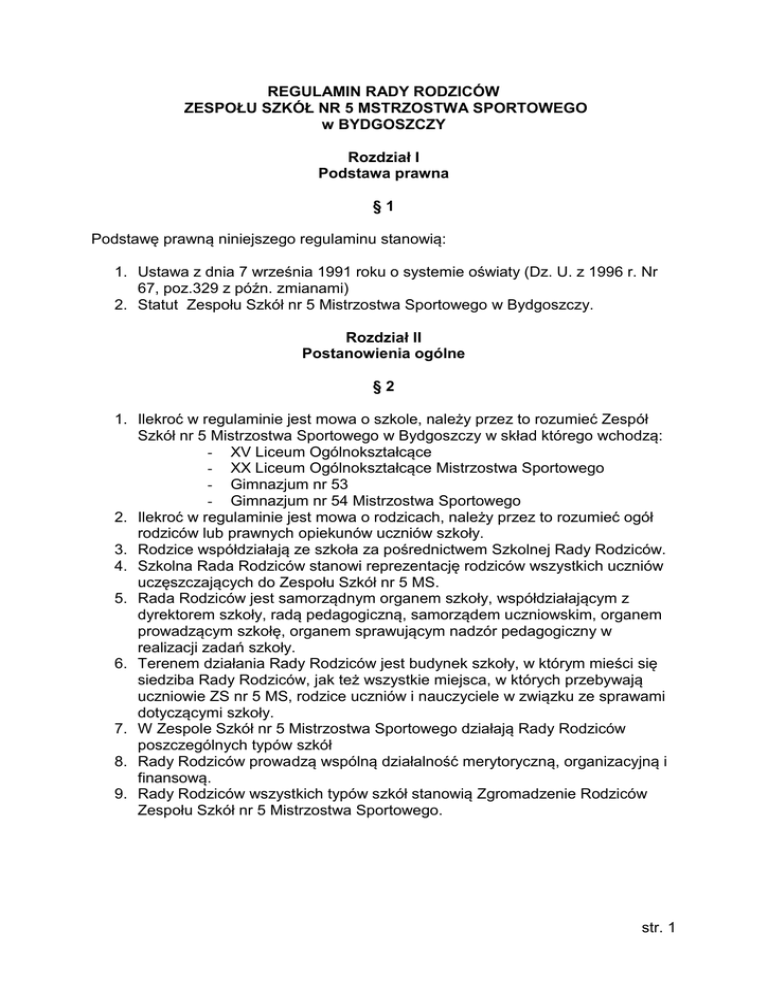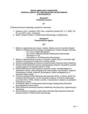 REGULAMIN RADY RODZICÓW ZESPOŁU SZKÓŁ NR 5 MSTRZOSTWA SPORTOWEGO w BYDGOSZCZY Rozdział I Podstawa prawna §1 Podstawę prawną niniejszego regulaminu stanowią: 1. Ustawa z dnia 7 września 1991 roku o systemie oświaty (Dz. U. z 1996 r. Nr 67, poz.329 z późn. zmianami) 2. Statut Zespołu Szkół nr 5 Mistrzostwa Sportowego w Bydgoszczy. Rozdział II Postanowienia ogólne §2 1. Ilekroć w regulaminie jest mowa o szkole, należy przez to rozumieć Zespół Szkół nr 5 Mistrzostwa Sportowego w Bydgoszczy w skład którego wchodzą: - XV Liceum Ogólnokształcące - XX Liceum Ogólnokształcące Mistrzostwa Sportowego - Gimnazjum nr 53 - Gimnazjum nr 54 Mistrzostwa Sportowego 2. Ilekroć w regulaminie jest mowa o rodzicach, należy przez to rozumieć ogół rodziców lub prawnych opiekunów uczniów szkoły. 3. Rodzice współdziałają ze szkoła za pośrednictwem Szkolnej Rady Rodziców. 4. Szkolna Rada Rodziców stanowi reprezentację rodziców wszystkich uczniów uczęszczających do Zespołu Szkół nr 5 MS. 5. Rada Rodziców jest samorządnym organem szkoły, współdziałającym z dyrektorem szkoły, radą pedagogiczną, samorządem uczniowskim, organem prowadzącym szkołę, organem sprawującym nadzór pedagogiczny w realizacji zadań szkoły. 6. Terenem działania Rady Rodziców jest budynek szkoły, w którym mieści się siedziba Rady Rodziców, jak też wszystkie miejsca, w których przebywają uczniowie ZS nr 5 MS, rodzice uczniów i nauczyciele w związku ze sprawami dotyczącymi szkoły. 7. W Zespole Szkół nr 5 Mistrzostwa Sportowego działają Rady Rodziców poszczególnych typów szkół 8. Rady Rodziców prowadzą wspólną działalność merytoryczną, organizacyjną i finansową. 9. Rady Rodziców wszystkich typów szkół stanowią Zgromadzenie Rodziców Zespołu Szkół nr 5 Mistrzostwa Sportowego. str. 1 Rozdział III Cele, zakres działania i zadania Rady Rodziców §3 1. Celem działania Rady Rodziców jest doskonalenie statutowej działalności szkoły w zakresie: o organizacji pracy szkoły, procesu wychowawczego i dydaktycznego o poprawy warunków technicznych i wyposażenia szkoły o zapewnienia uczniom warunków bytowych i pomocy materialnej 2. Szkolna Rada Rodziców reprezentuje ogół rodziców. 3. Szkolna Rada Rodziców może występować do organu prowadzącego szkołę, dyrektora, rady pedagogicznej z wnioskami i opiniami dotyczącymi wszystkich spraw szkoły. 4. Szkolna Rada Rodziców prowadzi działalność na podstawie zatwierdzonego przez siebie rocznego planu pracy oraz rocznego planu wpływów i wydatków. §4 Do zadań Szkolnej Rady Rodziców należą w szczególności: 1. Uchwalanie w porozumieniu z Radą Pedagogiczną: a) programu wychowawczego szkoły obejmującego wszystkie treści i działania o charakterze wychowawczym, skierowane do uczniów, realizowanego przez nauczycieli, b) programu profilaktyki dostosowanego do potrzeb rozwojowych uczniów oraz potrzeb danego środowiska, obejmującego wszystkie treści i działania o charakterze profilaktycznym skierowane do uczniów , nauczycieli i rodziców. c) opiniowanie programu i harmonogramu poprawy efektywności kształcenia lub wychowania szkoły, d) opiniowanie projektu planu finansowego składanego przez dyrektora szkoły. 2. Inicjowanie i branie czynnego udziału w spotkaniach z młodzieżą. 3. Współdziałanie w programowaniu pracy szkoły oraz w planowaniu wydatków finansowych szkoły. 4. Udzielanie pomocy samorządowi uczniowskiemu oraz organizacjom młodzieżowym i społecznym działającym w szkole. 5. Ustalanie stawek wynagrodzenia za prace nauczycieli w ramach zajęć pozalekcyjnych (kółka zainteresowań) 6. Podejmowanie decyzji o dofinansowywaniu przedsięwzięć organizowanych przez szkołę oraz uczestnictwa uczniów w imprezach na zewnątrz. 7. ustalanie kwot dopłat do wypoczynku uczniów, wyżywienia najuboższych oraz każdego innego rodzaju wsparcia finansowego uczniów. 8. Podejmowanie działań na rzecz pozyskania środków finansowych dla szkoły. 9. Pozyskiwanie podmiotów gospodarczych, instytucji do współpracy ze szkołą, szczególnie w celu przyjęcia patronatu nad jej działalnością. 10. Współpraca z różnymi organizacjami działającymi w środowisku lokalnym. 11. Współuczestniczenie w opracowaniu i realizacji procedur ustalonych na okoliczność sytuacji szczególnych zagrażających bezpieczeństwu uczniów lub str. 2 szkoły (przemoc wobec uczniów lub nauczycieli, zbiorowy protest, zagrożenie losowe lub zewnętrzne itp.) &5 Do kompetencji Zgromadzenia Rodziców Zespołu Szkół nr 5 Mistrzostwa sportowego należy: 1) uchwalenie Statutu Rady Rodziców przy Zespole Szkół nr 5 Mistrzostwa Sportowego 2) wprowadzenie zmian i modyfikacji w Statucie na wniosek wszystkich organów Rady Rodziców 3) przyjęcie lub odrzucenie sprawozdania z działalności Szkolnej Rady Rodziców za rok szkolny 4) rozpatrywania na wniosek dyrektora szkoły zawieszonych uchwał Rady rodziców 5) ustalanie wysokości składek Rozdział IV Organizacja i zasady działania Rady Rodziców §6 1. Podstawowym ogniwem organizacyjnym Rady Rodziców jest Rada Klasowa. 2. Klasowe zebranie rodziców wybiera spośród siebie Radę Klasową składającą się z 3 osób tak, aby można było utworzyć funkcję przewodniczącego, skarbnika i sekretarza. 3. Rodzice na zebraniu klasowym wybierają w wyborach tajnych jednego przedstawiciela do Rady Rodziców. W czasie wyborów jednego ucznia reprezentuje jeden rodzic. 4. Wybrani przedstawiciele klasowi stanowią Radę Rodziców poszczególnych typów szkół. 5. Przedstawiciele rad klasowych w poszczególnych typach szkół wybierają spośród siebie delegatów do Szkolnej Rady Rodziców. 6. Szkolna Rada Rodziców składa się z pięciu członków wybranych w następująco: - XV LO – 2 delegatów - XX LO MS – 1 delegat - Gimnazjum nr 53 – 1 delegat - Gimnazjum nr 54 MS – 1 delegat 7. Szkolna Rada Rodziców na pierwszym swo