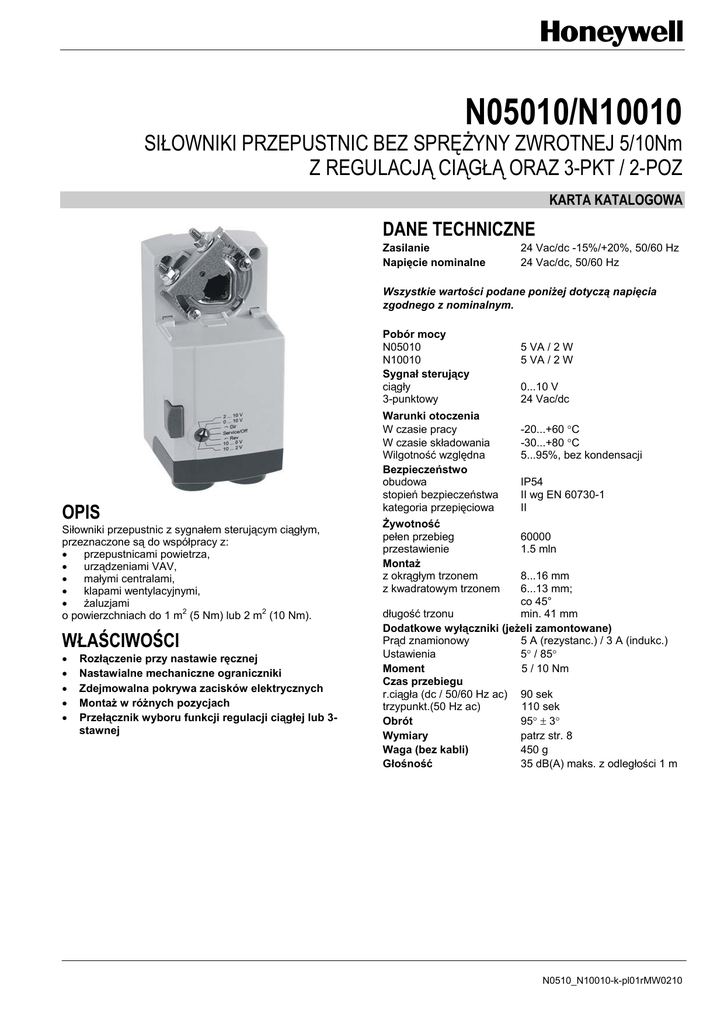 N05010/N10010 SIŁOWNIKI PRZEPUSTNIC Z REGULACJĄ CIĄGŁĄ ORAZ 3-PKT / 2-POZ.