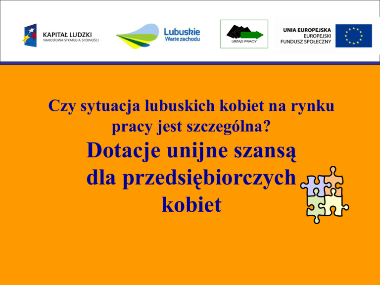 Czy sytuacja lubuskich kobiet na rynku pracy jest szczególna? Dotacje unijne szansą dla przedsiębiorczych kobiet Sytuacja kobiet na lubuskim rynku pracy Większość osób bezrobotnych to kobiety. Na koniec lipca 2010 r. w województwie lubuskim w powiatowych urzędach pracy zarejestrowanych było 55 482 osób bezrobotnych, w tym 30 187 to kobiety, które stanowiły 54,4% ogółu zarejestrowanych. mężczyźni; 46,6% bezrobotni kobiety; 54,4% Sytuacja kobiet na lubuskim rynku pracy Kobiety dłużej przebywają w rejestrach powiatowych urzędów pracy. Na koniec 2009 r.* ponad rok bez pracy pozostawało 24,9% kobiet. Dla porównania - dla mężczyzn wskaźnik ten wyniósł 17,4%. Długotrwale bezrobotni 30% 20% *Rynek pracy województwa lubuskiego w 2009 r., Wojewódzki Urząd Pracy w Zielonej Górze, Zielona Góra, kwiecień 2010 24,9% 10% 17,4% 0% kobiety mężczyźni Sytuacja kobiet na lubuskim rynku pracy Bezrobotne kobiety są lepiej wykształcone od mężczyzn. Na koniec 2009 r.* wykształcenie wyższe posiadało 8,6% z ogółu bezrobotnych kobiet. Wśród bezrobotnych mężczyzn wykształcenie wyższe miało 5,2%. Wykształcenie policealne i średnie zawodowe miało 24,8% kobiet i tylko 17,6% mężczyzn. *Rynek pracy województwa lubuskiego w 2009 r., Wojewódzki Urząd Pracy w Zielonej Górze, Zielona Góra, kwiecień 2010 24,8% 25% 20% 15% 10% 5% 0% 17,6% wyższe 8,6% 5,2% policealne lub średnie zawodowe Sytuacja kobiet na lubuskim rynku pracy Kobiety rzadziej pracują na własny rachunek. Pracodawców i pracujących na własny rachunek w I kwartale 2010 r. było w woj. lubuskim ok. 60 tys. Z tego 41 tys. to mężczyźni, a tylko 19 tys. to kobiety.* 19 000 41 000 *Dane GUS, Aktywność ekonomiczna ludności w woj. lubuskim w I kwartale 2010 r. pracujący na własny rachunek kobiety mężczyźni Bariery, jakich doświadczają kobiety na rynku pracy segregacja pozioma – podział sektorów gospodarki i zawodów na „męskie” i „kobiece”, wynikający ze stereotypów płci segregacja pionowa rynku pracy – utrudniony dostęp do awan-su, zajmowania stanowisk kierow-niczych i decyzyjnych różnice w płacach kobiet i mężczyzn Bariery, jakich doświadczają kobiety na rynku pracy mała dostępność elastycznych rozwiązań czasu pracy stereotypy płci niewystarczający system opieki przedszkolnej W jaki sposób WUP wspiera kobiety? 1) Doradztwo zawodowe Przy Wojewódzkim Urzędzie Pracy w Zielonej Górze funkcjonuje Centrum Informacji i Planowania Kariery Zawodowej – placówka, która zajmuje się poradnictwem zawodowym i pomocą psychologiczną. Można zasięgnąć w nim informacji dotyczących zawodów, rynku pracy, możliwości nabywania lub podwyższania kwalifikacji zawodowych. Kto może skorzystać z usług Centrum osoby bezrobotne i poszukujące pracy osoby chcące się przekwalifikować absolwenci szkół, którzy wchodzą na rynek pracy osoby opuszczające zakład karny i areszt Usługi Centrum Informacji i Planowania Kariery Zawodowej: ▪ poradnictwo zawodowe – doradca zawodowy pomaga klientowi wybrać zawód, zmienić zatrudnienie lub przystosować się do obecnego zatrudnienia. Poradnictwo zawodowe może być indywidualne i grupowe. Indywidualne – po rozmowie doradcy z klientem, dotyczącej m.in. oczekiwań zawodowych, zainteresowań, uzdolnień, przebiegu kariery zawodowej, szkolnej, wspólnie przygotowywany jest indywidualny plan działania. Grupowe - doradcy zawodowi przeprowadzają zajęcia warsztatowe dotyczące m.in. podejmowania decyzji zawodowych, autoprezentacji, technik poszukiwania pracy, przygotowywania dokumentów aplikacyjnych. poradnictwo psychologiczne – porady psychologa pomagają klientom pokonać bariery psychologiczne utrudniające podejmowanie decyzji zawodowych; wsparcie psychologa jest szczególnie ważne sytuacjach trudnych, związanych np. z utratą pracy czy mobbingiem. Klient może skorzystać z testów osobowości, zainteresowań, inteligencji czy np. sprawdzających uzdolnienia przedsiębiorcze. informacja zawodowa – pomaga klientom w podejmowaniu decyzji zawodowych, ułatwia orientację w świecie pracy. W Centrum można skorzystać z przewodników po zawodach, klasyfikacji zawodów i specjalności, informatorów o szkołach i uczelniach wyższych, zapoznać się z wykazem jednostek szkoleniowych w woj. lubuskim, obejrzeć filmy zawodoznawcze itp. Dane kontaktowe Centrum Informacji i Planowania Kariery Zawodowej mieści się: w Zielonej Górze przy ul. Wyspiańskiego 13, tel. 68 458 88 90, e-mail: [email protected]; w Gorzowie Wielkopolskim przy ul. Ściegiennego 17, tel. 95 722 80 25, e-mail: [email protected] 2) Europejski Fundusz Społeczny W Unii Europejskiej zasada równości szans kobiet i mężczyzn jest jedną z naczelnych polityk horyzontalnych. Działania związane ze zwiększaniem dostępu i uczestnictwa kobiet na rynku pracy wspierane są przez Europejski Fundusz Społeczny w ramach Programu Operacyjnego Kapitał Ludzki. Wybór projektów dofinansowanych przez EFS pozwala na dotarcie do grup najbardziej potrzebujących na rynku pracy, w tym kobiet. Wojewódzki Urząd Pracy w Zielonej Górze na mocy porozumienia zawartego z Urzędem Marszałkowskim Województwa Lubuskiego realizuje działania związane z Priorytetem VI Programu Operacyjnego Kapitał Ludzki „Rynek pracy otwarty dla wszystkich”. Wielu projektodawców kieruje swoje projekty wyłącznie do kobiet, chcąc wyrównać ich szanse na rynku pracy. Baza wszystkich projektów znajduje się na stronie WUP: wup.zgora.pl oraz Departamentu EFS Urzędu Marszałkowskiego: www.efs.lubuskie.pl . Uczestnicy i uczestniczki projektów podnoszą oraz zdobywają nowe kwalifikacje poprzez udział w szkoleniach, praktykach, korzystanie z doradztwa zawodowego, a także poprzez otwieranie własnej firmy, korzystając ze wsparcia merytorycznego oraz dotacji z EFS. Działanie 6.2 Wsparcie oraz promocja przedsiębiorczości i samozatrudnienia Wojewódzki Urząd Pracy 