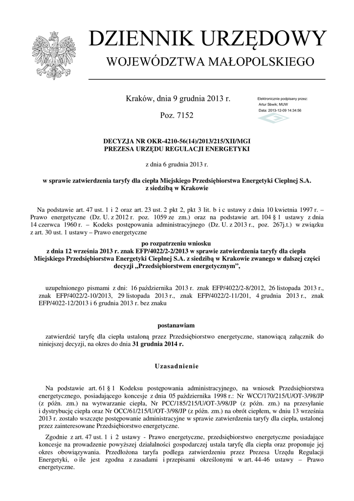 DZIENNIK URZĘDOWY WOJEWÓDZTWA MAŁOPOLSKIEGO Kraków, dnia 9 grudnia 2013 r. Elektronicznie podpisany przez: Artur Słowik; MUW Poz. 7152 Data: 2013-12-09 14:34:56 DECYZJA NR OKR-4210-56(14)/2013/215/XII/MGI PREZESA URZĘDU REGULACJI ENERGETYKI z dnia 6 grudnia 2013 r. w sprawie zatwierdzenia taryfy dla ciepła Miejskiego Przedsiębiorstwa Energetyki Cieplnej S.A. z siedzibą w Krakowie Na podstawie art. 47 ust. 1 i 2 oraz art. 23 ust. 2 pkt 2, pkt 3 lit. b i c ustawy z dnia 10 kwietnia 1997 r. – Prawo energetyczne (Dz. U. z 2012 r. poz. 1059 ze zm.) oraz na podstawie art. 104 § 1 ustawy z dnia 14 czerwca 1960 r. – Kodeks postępowania administracyjnego (Dz. U. z 2013 r., poz. 267j.t.) w związku z art. 30 ust. 1 ustawy – Prawo energetyczne po rozpatrzeniu wniosku z dnia 12 września 2013 r. znak EFP/4022/2-2/2013 w sprawie zatwierdzenia taryfy dla ciepła Miejskiego Przedsiębiorstwa Energetyki Cieplnej S.A. z siedzibą w Krakowie zwanego w dalszej części decyzji „Przedsiębiorstwem energetycznym”, uzupełnionego pismami z dni: 16 października 2013 r. znak EFP/4022/2-8/2012, 26 listopada 2013 r., znak EFP/4022/2-10/2013, 29 listopada 2013 r., znak EFP/4022/2-11/201, 4 grudnia 2013 r., znak EFP/4022-12/2013 i 6 grudnia 2013 r. bez znaku postanawiam zatwierdzić taryfę dla ciepła ustaloną przez Przedsiębiorstwo energetyczne, stanowiącą załącznik do niniejszej decyzji, na okres do dnia 31 grudnia 2014 r. Uzasadnienie Na podstawie art. 61 § 1 Kodeksu postępowania administracyjnego, na wniosek Przedsiębiorstwa energetycznego, posiadającego koncesje z dnia 05 października 1998 r.: Nr WCC/170/215/U/OT-3/98/JP (z późn. zm.) na wytwarzanie ciepła, Nr PCC/185/215/U/OT-3/98/JP (z późn. zm.) na przesyłanie i dystrybucję ciepła oraz Nr OCC/61/215/U/OT-3/98/JP (z późn. zm.) na obrót ciepłem, w dniu 13 września 2013 r. zostało wszczęte postępowanie administracyjne w sprawie zatwierdzenia taryfy dla ciepła, ustalonej przez zainteresowane Przedsiębiorstwo energetyczne. Zgodnie z art. 47 ust. 1 i 2 ustawy - Prawo energetyczne, przedsiębiorstwo energetyczne posiadające koncesje na prowadzenie powyższej działalności gospodarczej ustala taryfę dla ciepła oraz proponuje jej okres obowiązywania. Przedłożona taryfa podlega zatwierdzeniu przez Prezesa Urzędu Regulacji Energetyki, o ile jest zgodna z zasadami i przepisami określonymi w art. 44-46 ustawy – Prawo energetyczne. Dziennik Urzędowy Województwa Małopolskiego –2– Poz. 7152 W trakcie postępowania administracyjnego, na podstawie zgromadzonej dokumentacji ustalono, że Przedsiębiorstwo energetyczne opracowało taryfę zgodnie z zasadami określonymi w art. 44 i 45 ustawy – Prawo energetyczne oraz przepisami rozporządzenia Ministra Gospodarki z dnia 17 września 2010 r. w sprawie szczegółowych zasad kształtowania i kalkulacji taryf oraz rozliczeń z tytułu zaopatrzenia w ciepło (Dz. U. z 2010 r. Nr 194, poz. 1291), zwanego w dalszej części decyzji „rozporządzeniem taryfowym”, a także stosownie do zobowiązań wynikających z ustawy z dnia 15 kwietnia 2011 r. o efektywności energetycznej (Dz.U. 2011 r., Nr 94, poz.551). Ceny i stawki opłat zostały skalkulowane przez Przedsiębiorstwo energetyczne na podstawie kosztów uzasadnionych prowadzenia działalności gospodarczej, zaplanowanych dla pierwszego roku stosowania taryfy. Ocena tych kosztów została dokonana na podstawie porównania, wynikających z nich, jednostkowych kosztów planowanych dla pierwszego roku stosowania taryfy z uzasadnionymi jednostkowymi kosztami wynikającymi z kosztów poniesionych w roku kalendarzowym poprzedzającym pierwszy rok stosowania taryfy (§ 12 ust. 2 rozporządzenia taryfowego). Okres na jaki została zatwierdzona taryfa dla ciepła jest zgodny z wnioskiem Przedsiębiorstwa energetycznego. W tym stanie rzeczy postanowiłem orzec, jak w sentencji. POUCZENIE 1. Od niniejszej decyzji przysługuje odwołanie do Sądu Okręgowego w Warszawie – sądu ochrony konkurencji i konsumentów, za pośrednictwem Prezesa Urzędu Regulacji Energetyki, w terminie dwutygodniowym od dnia jej doręczenia (art. 30 ust. 2 i 3 ustawy z dnia 10 kwietnia 1997 r. – Prawo energetyczne oraz art. 47946 pkt 1 i art. 47947 § 1 Kodeksu postępowania cywilnego). 2. Odwołanie od decyzji powinno czynić zadość wymaganiom przepisanym dla pisma procesowego oraz zawierać oznaczenie zaskarżonej decyzji i wartości przedmiotu sporu, przytoczenie zarzutów, zwięzłe ich uzasadnienie, wskazanie dowodów, a także zawierać wniosek o uchylenie albo o zmianę decyzji – w całości lub części (art. 47949 Kodeksu postępowania cywilnego). Odwołanie należy przesłać na adres Południowo Wschodniego Oddziału Terenowego Urzędu Regulacji Energetyki z siedzibą w Krakowie, ul. Juliusza Lea 114, 30 –133 Kraków. 3. Stosownie do art. 47 ust. 3 pkt 2 w związku z art. 31 ust. 3 pkt 2 i ust. 4 ustawy – Prawo energetyczne, taryfa wraz z decyzją zostaną skierowane do ogłoszenia w Dzienniku Urzędowym Województwa Małopolskiego. 4. Stosownie do art. 47 ust. 4 ustawy – Prawo energetyczne taryfa może zacząć obowiązywać nie wcześniej niż po upływie 14 dni i nie później niż do 45 dnia od dnia jej opublikowania w Dzienniku Urzędowym Województwa Małopolskiego. z up. Prezesa Urzędu Regulacji Energetyki Dyrektor Południowo-Wschodniego Oddziału Terenowego Urzędu Regulacji Energetyki z siedzibą w Krakowie dr Małgorzata Nowaczek-Zaremba Dziennik Urzędowy Województwa Małopolskiego –3– Poz. 7152 Załącznik do Decyzji Nr OKR-4210-56(14)/2013/215/XII/MGi Prezesa Urzędu Regulacji Energetyki z dnia 6 grudnia 2013 r. Dziennik Urzędowy Województwa Małopolskiego –4– Poz. 7152 Dziennik Urzędowy Województwa Małopolskiego –5– Poz. 7152 Dziennik Urzędowy Województwa Małopolskiego –6– Poz. 7152 Dziennik Urzędowy Województwa Małopolskiego –7– Poz. 7152 Dziennik Urzędowy Województwa