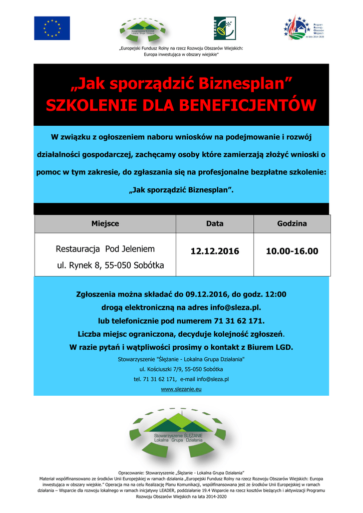 „Europejski Fundusz Rolny na rzecz Rozwoju Obszarów Wiejskich: Europa inwestująca w obszary wiejskie” „Jak sporządzić Biznesplan” SZKOLENIE DLA BENEFICJENTÓW W związku z ogłoszeniem naboru wniosków na podejmowanie i rozwój działalności gospodarczej, zachęcamy osoby które zamierzają złożyć wnioski o pomoc w tym zakresie, do zgłaszania się na profesjonalne bezpłatne szkolenie: „Jak sporządzić Biznesplan”. Miejsce Data Godzina Restauracja Pod Jeleniem 12.12.2016 10.00-16.00 ul. Rynek 8, 55-050 Sobótka Zgłoszenia można składać do 09.12.2016, do godz. 12:00 drogą elektroniczną na adres [email protected]. lub telefonicznie pod numerem 71 31 62 171. Liczba miejsc ograniczona, decyduje kolejność zgłoszeń. W razie pytań i wątpliwości prosimy o kontakt z Biurem LGD. Stowarzyszenie "Ślężanie - Lokalna Grupa Działania" ul. Kościuszki 7/9, 55-050 Sobótka tel. 71 31 62 171, e-mail [email protected] www.slezanie.eu Opracowanie: Stowarzyszenie „Ślężanie - Lokalna Grupa Działania” Materiał współfinansowano ze środków Unii Europejskiej w ramach działania „Europejski Fundusz Rolny na rzecz Rozwoju Obszarów Wiejskich: Europa inwestująca w obszary wiejskie.” Operacja ma na celu Realizację Planu Komunikacji, współfinansowana jest ze środków Unii Europejskiej w ramach działania – Wsparcie dla rozwoju lokalnego w ramach inicjatywy LEADER, poddziałanie 19.4 Wsparcie na rzecz kosztów bieżących i aktywizacji Programu Rozwoju Obszarów Wiejskich na lata 2014-2020