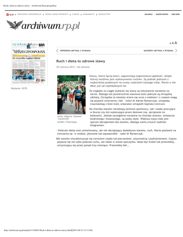 Ruch i dieta to zdrowe stawy - Archiwum Rzeczpospolitej SZKOLENIA I KONFERENCJE POZNAJ NASZE PRODUKTY E-SKLEP KOMUNIKATY NEWSLETTER ZALOGUJ ZAŁÓŻ KONTO KOD SMS AAA POPRZEDNI ARTYKUŁ Z WYDANIA NASTĘPNY ARTYKUŁ Z WYDANIA Ruch i dieta to zdrowe stawy 29 czerwca 2012 | Na zdrowie Stawy, które łączą kości, zapewniają organizmowi giętkość, dzięki której możliwe jest wykonywanie ruchów. Są jednak jednymi z najbardziej podatnych na urazy częściami naszego ciała. Warto o nie dbać już od najmłodszych lat Wydanie: 9270 Ze względu na ciągłe stykanie się stawy są nieustannie narażone na tarcie. Dlatego też powierzchnie stawowe kości pokryte są chrząstką szklistą. Chrząstka ta niestety ściera się wraz z wiekiem i z czasem mogą się pojawić schorzenia i ból – mówi dr Adrian Rymarczyk, ortopeda, traumatolog z Enel-med, ordynator ortopedii Szpitala Centrum. autor zdjęcia: Szymon Łaszewski źródło: Fotorzepa Na choroby stawów narzekają zarówno sportowcy, jak i osoby pracujące w biurze czy też wykonujące prace domowe (np. sprzątanie na kolanach). Jednak szczególnie narażone na choroby stawów, zwłaszcza biodrowego i kolanowego, są osoby otyłe. Większa masa ciała jest sporym obciążeniem dla stawów, dlatego warto zrzucić nadmiar kilogramów. – Polecam dietę oraz umiarkowany, ale nie obciążający dodatkowo stawów, ruch. Warto postawić na ćwiczenia np. w wodzie, pływanie lub aquaaerobik – radzi dr Rymarczyk. Ból stawów charakteryzuje się wzrostem ciepła lub pieczeniem, sztywnością i podrażnieniem. Często pojawia się nie tylko podczas ruchu, ale także w stanie spoczynku. Może być krótki lub przewlekły, utrzymujący się przez ponad trzy miesiące. Przewlekły ból... http://archiwum.rp.pl/artykul/1154663-Ruch-i-dieta-to-zdrowe-stawy.html[2015-04-23 13:11:04]