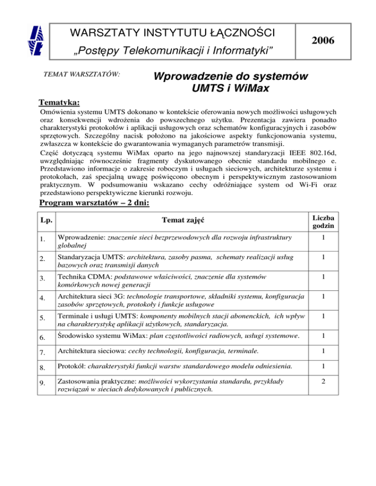 WARSZTATY INSTYTUTU ŁĄCZNOŚCI 2006 „Postępy Telekomunikacji i Informatyki” TEMAT WARSZTATÓW: Wprowadzenie do systemów UMTS i WiMax Tematyka: Omówienia systemu UMTS dokonano w kontekście oferowania nowych możliwości usługowych oraz konsekwencji wdrożenia do powszechnego użytku. Prezentacja zawiera ponadto charakterystyki protokołów i aplikacji usługowych oraz schematów konfiguracyjnych i zasobów sprzętowych. Szczególny nacisk położono na jakościowe aspekty funkcjonowania systemu, zwłaszcza w kontekście do gwarantowania wymaganych parametrów transmisji. Część dotyczącą systemu WiMax oparto na jego najnowszej standaryzacji IEEE 802.16d, uwzględniając równocześnie fragmenty dyskutowanego obecnie standardu mobilnego e. Przedstawiono informacje o zakresie roboczym i usługach sieciowych, architekturze systemu i protokołach, zaś specjalną uwagę poświęcono obecnym i perspektywicznym zastosowaniom praktycznym. W podsumowaniu wskazano cechy odróżniające system od Wi-Fi oraz przedstawiono perspektywiczne kierunki rozwoju. Program warsztatów – 2 dni: Lp. Temat zajęć Liczba godzin 1. Wprowadzenie: znaczenie sieci bezprzewodowych dla rozwoju infrastruktury globalnej 1 2. Standaryzacja UMTS: architektura, zasoby pasma, schematy realizacji usług bazowych oraz transmisji danych 1 3. Technika CDMA: podstawowe właściwości, znaczenie dla systemów komórkowych nowej generacji 1 4. Architektura sieci 3G: technologie transportowe, składniki systemu, konfiguracja zasobów sprzętowych, protokoły i funkcje usługowe 1 5. Terminale i usługi UMTS: komponenty mobilnych stacji abonenckich, ich wpływ na charakterystykę aplikacji użytkowych, standaryzacja. 1 6. Środowisko systemu WiMax: plan częstotliwości radiowych, usługi systemowe. 1 7. Architektura sieciowa: cechy technologii, konfiguracja, terminale. 1 8. Protokół: charakterystyki funkcji warstw standardowego modelu odniesienia. 1 9. Zastosowania praktyczne: możliwości wykorzystania standardu, przykłady rozwiązań w sieciach dedykowanych i publicznych. 2